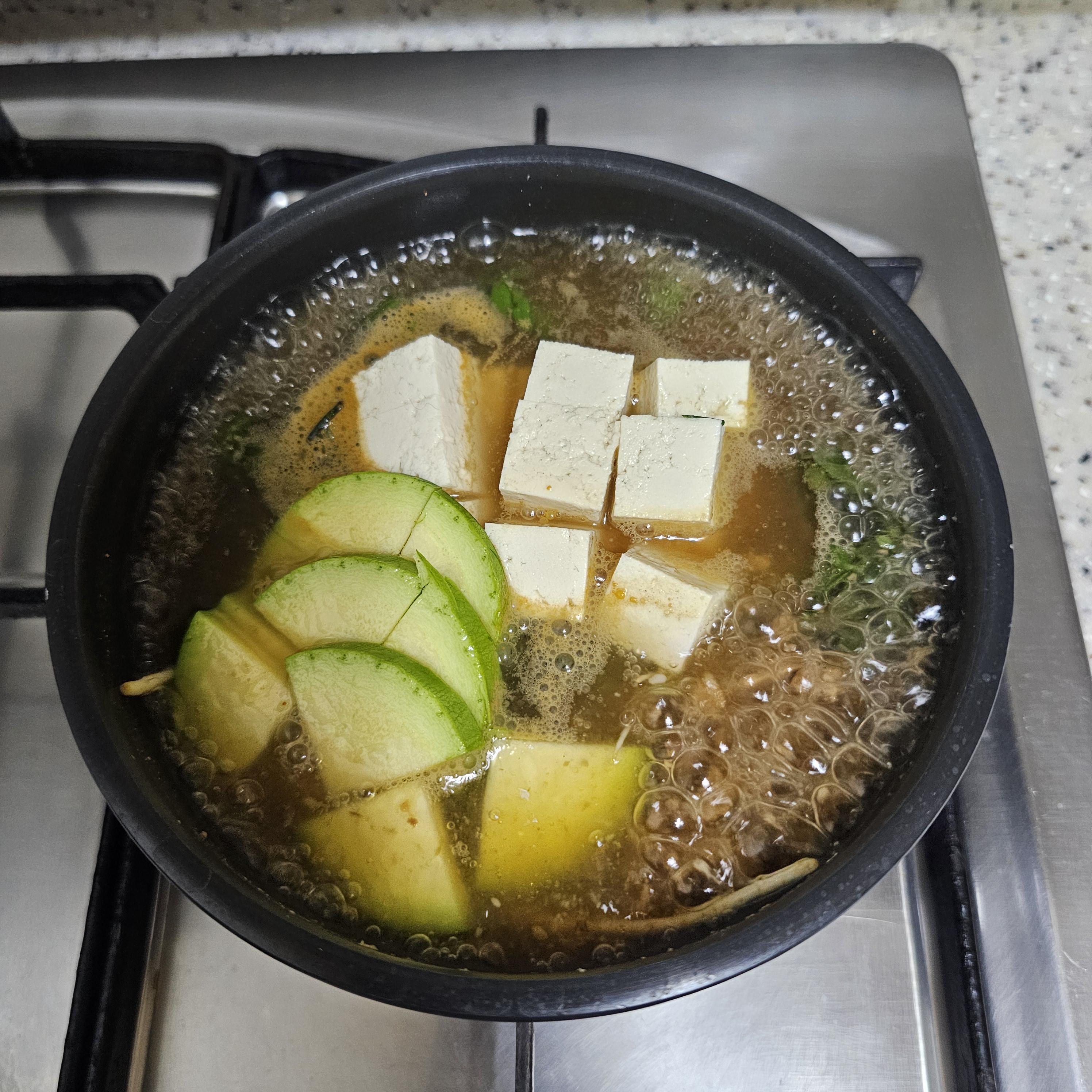 냉이를 넣고 한번 끓으면 두부와 호박을 넣어줍니다.