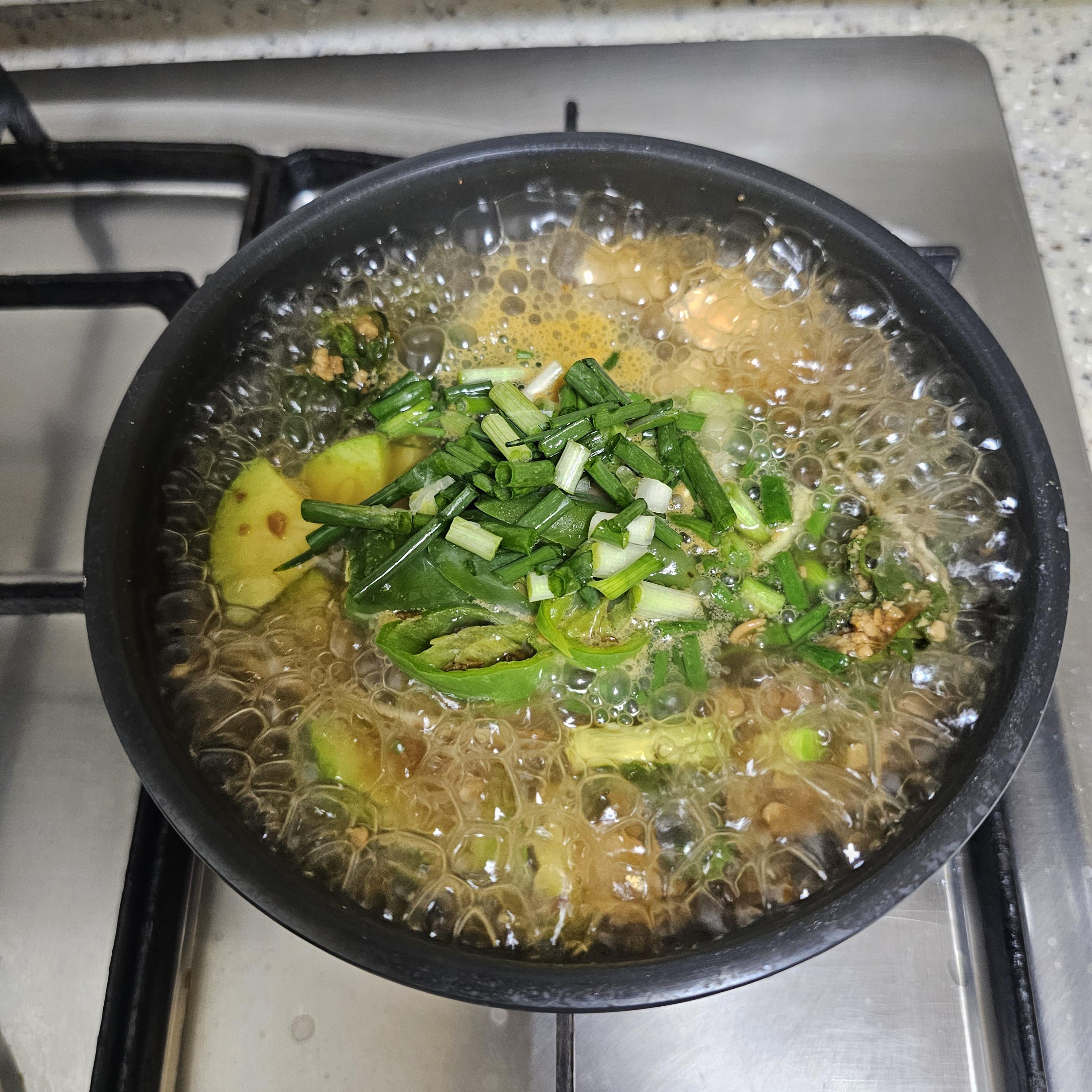 보글보글 어느 정도 끓으면 마지막으로 쪽파와 고추를 넣어 시원한 맛을 내주세요.