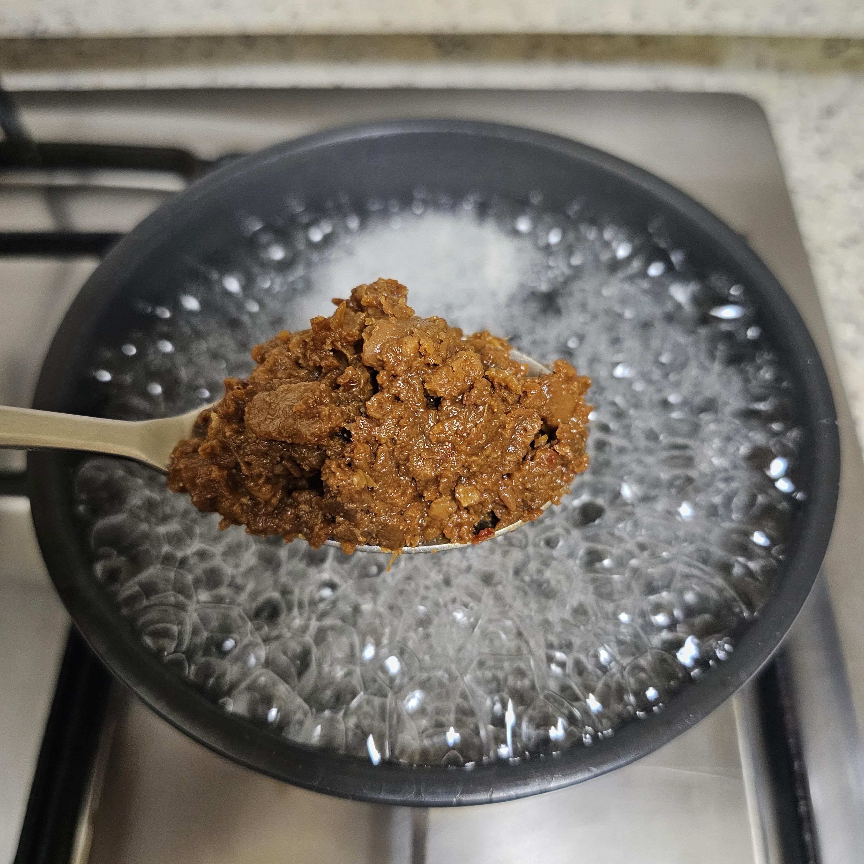 물이 끓으면 된장 1 정도 가득 넣어줍니다.