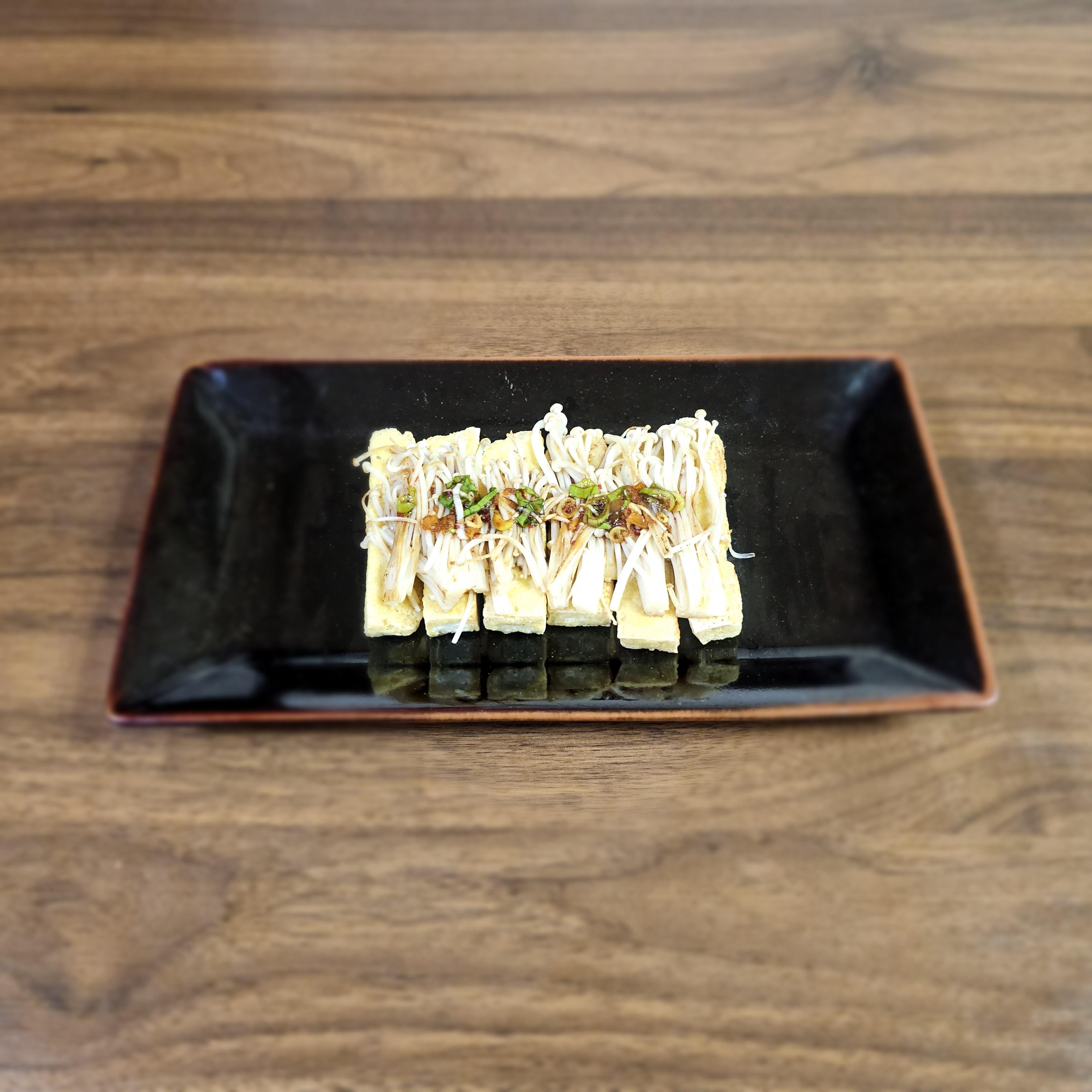 노릇하게 구워진 두부 위에 팽이버섯을 올려줍니다.