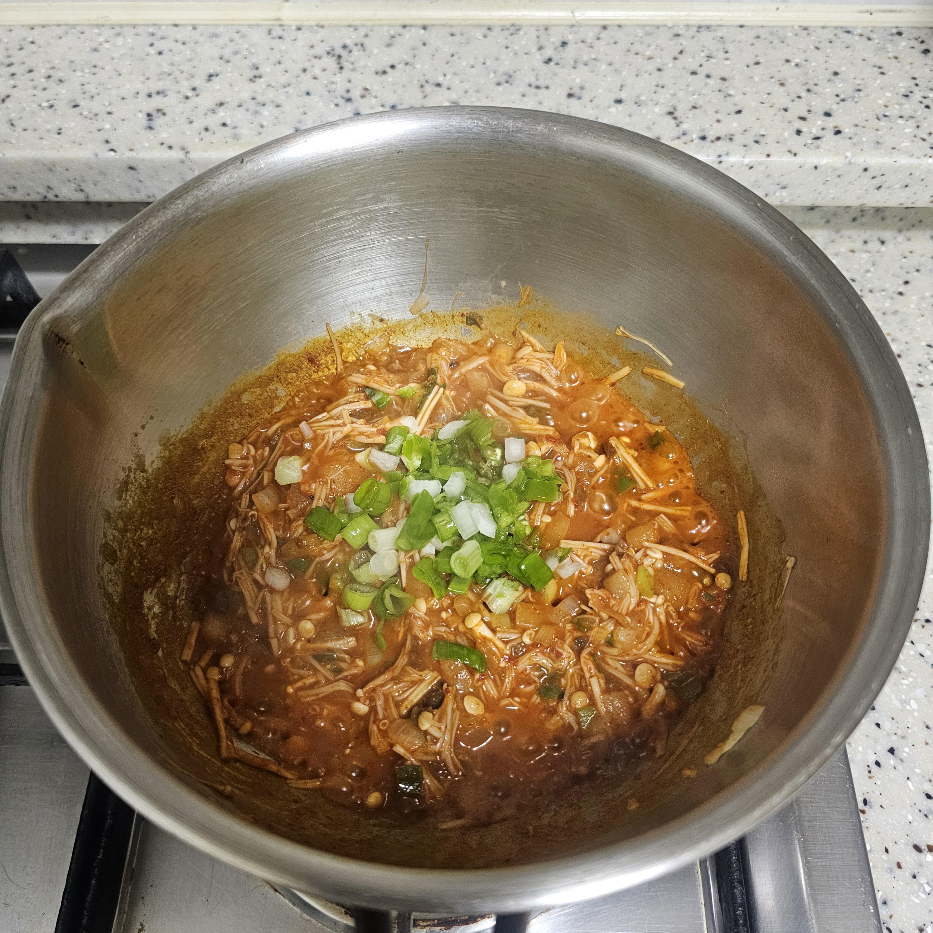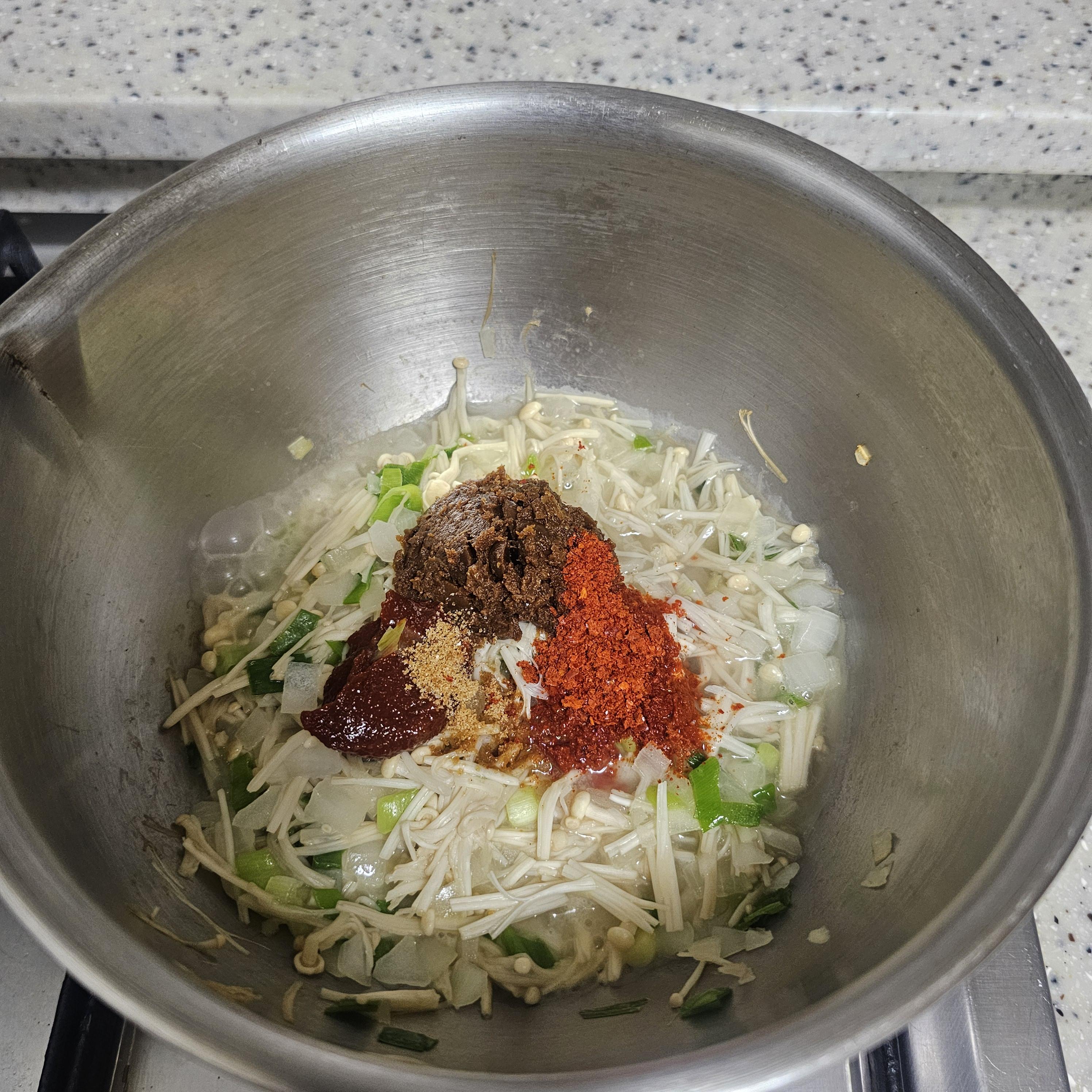 팽이버섯 색이 진해지고 숨이 죽으면 된장 1, 고추장 0.5, 고춧가루 0.5, 다시다 조금 넣고 물 조금 넣고 다시 끓여줍니다.