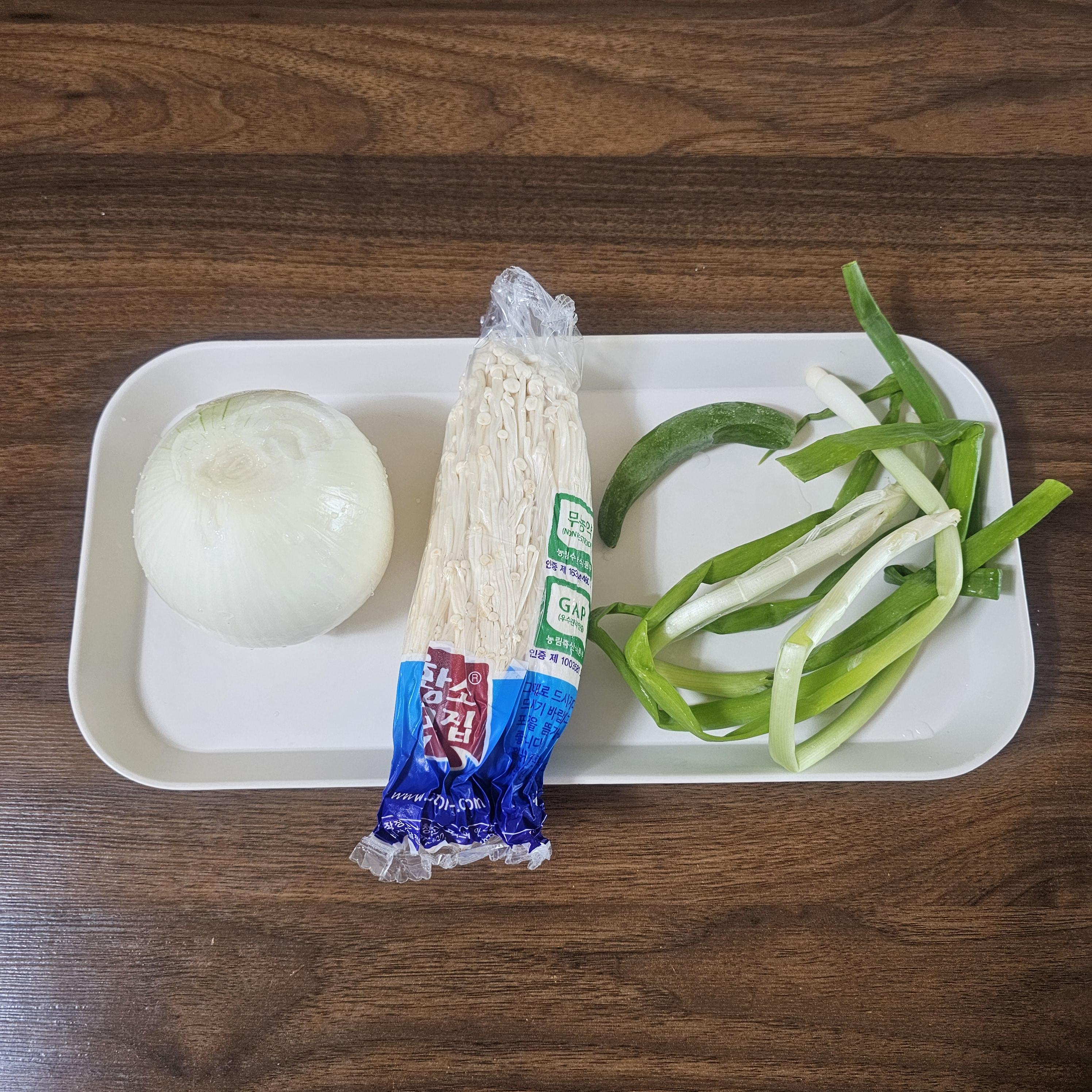 양파, 팽이버섯, 청양고추, 파, 된장, 고추장, 고춧가루, 다시다, 깨