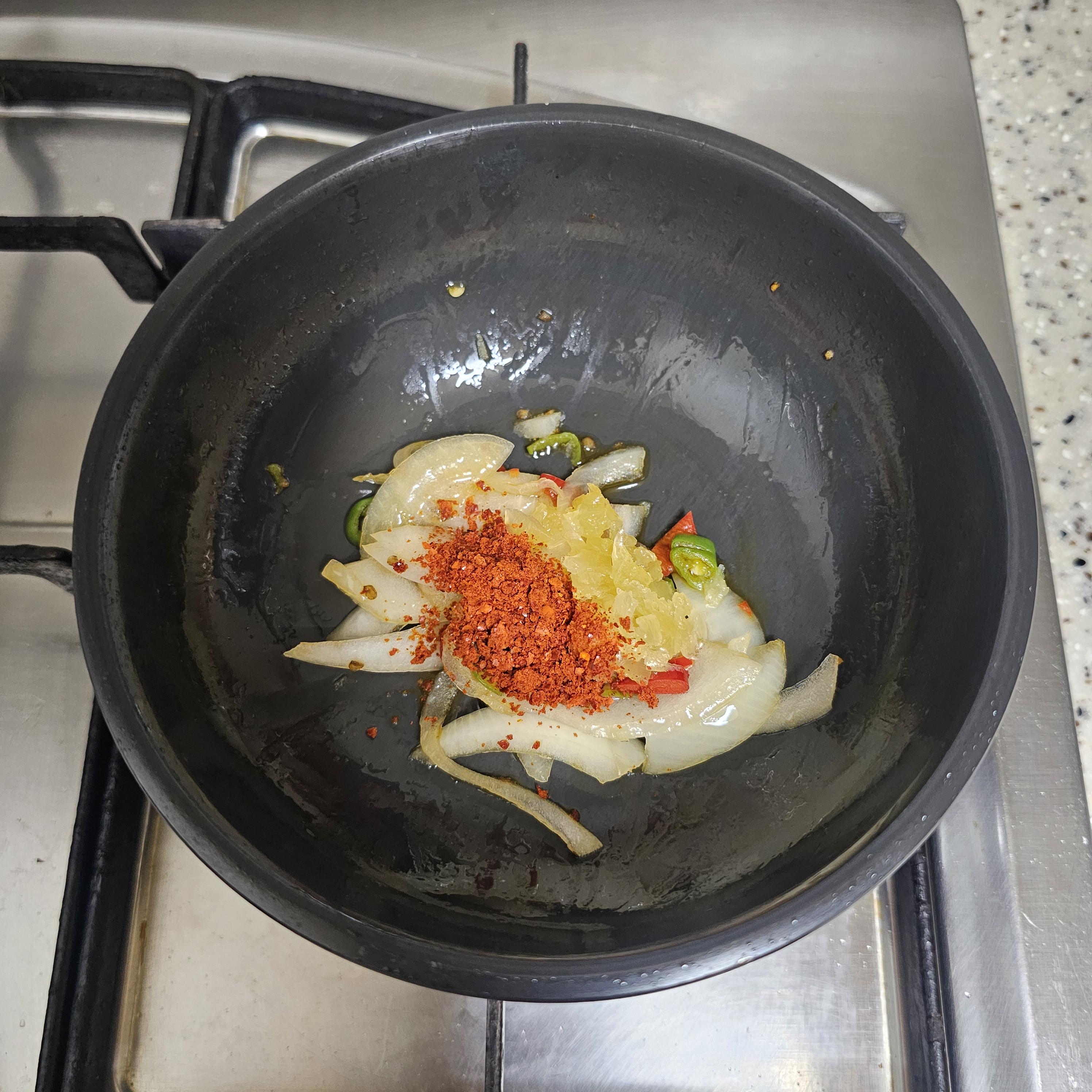 다진 마늘 1, 고춧가루 1을 넣고 살짝 볶아주세요.