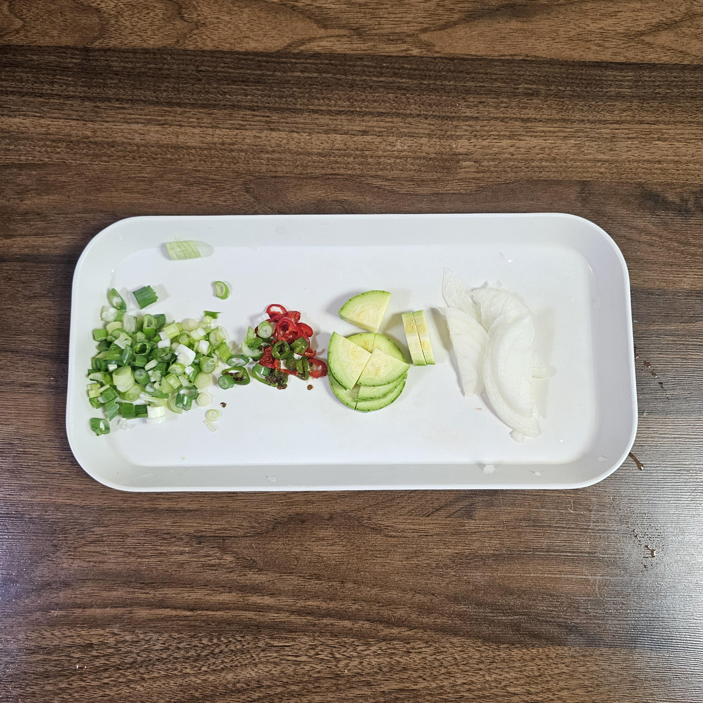 파, 고추, 애호박, 양파를 먹기 좋은 크기로 잘라줍니다.