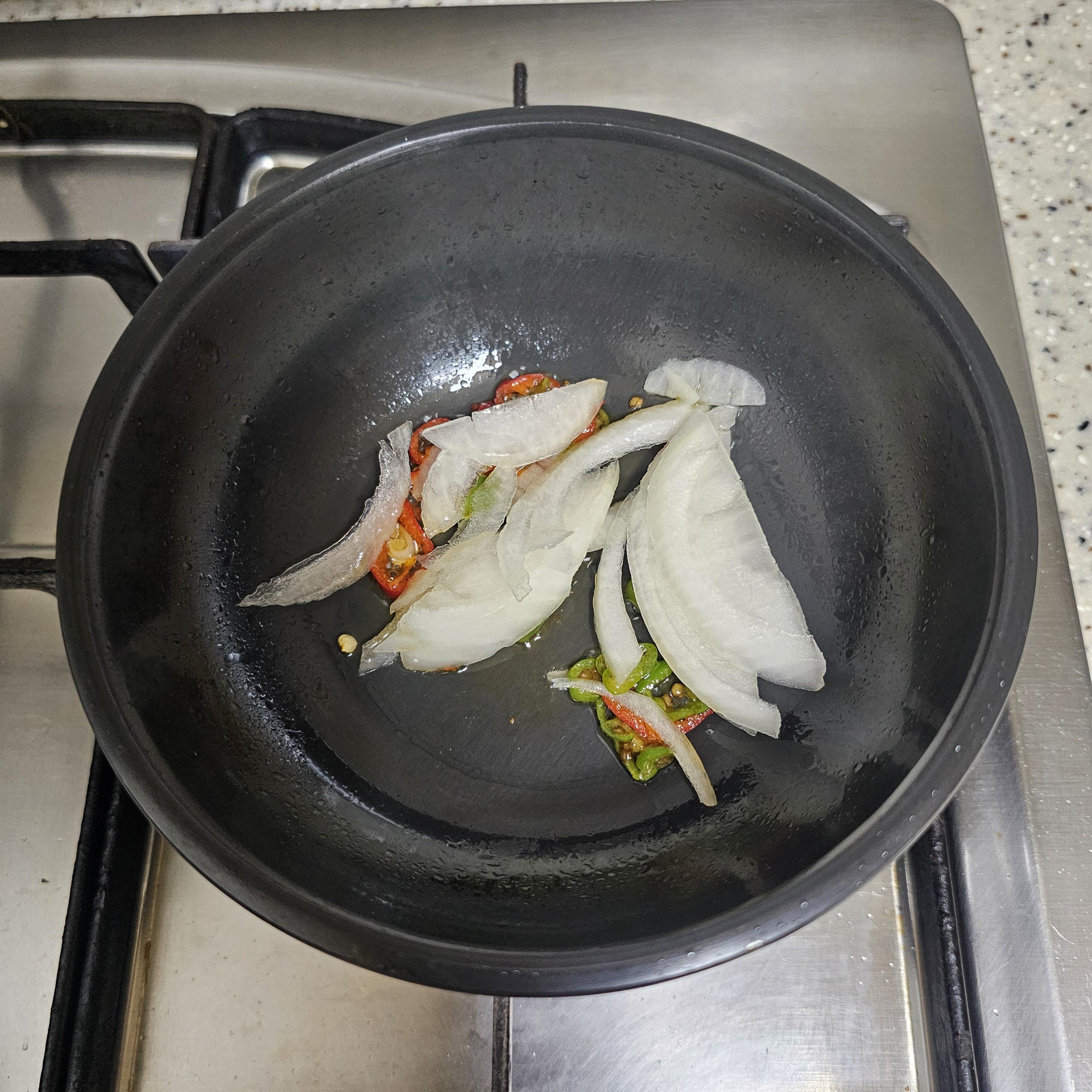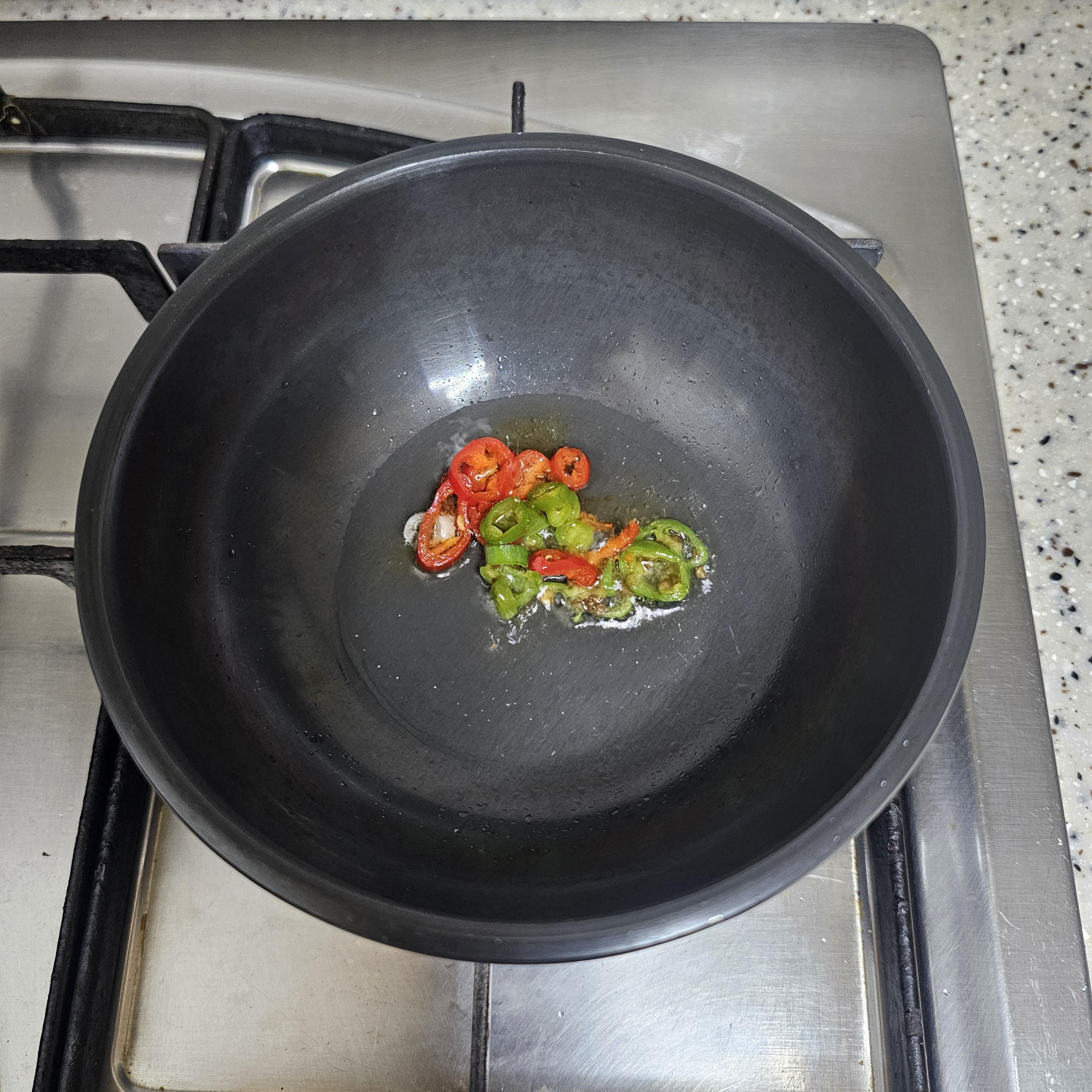 기름을 두른 뒤 홍고추와 청양고추를 넣어 고추기름을 만들어 주세요.