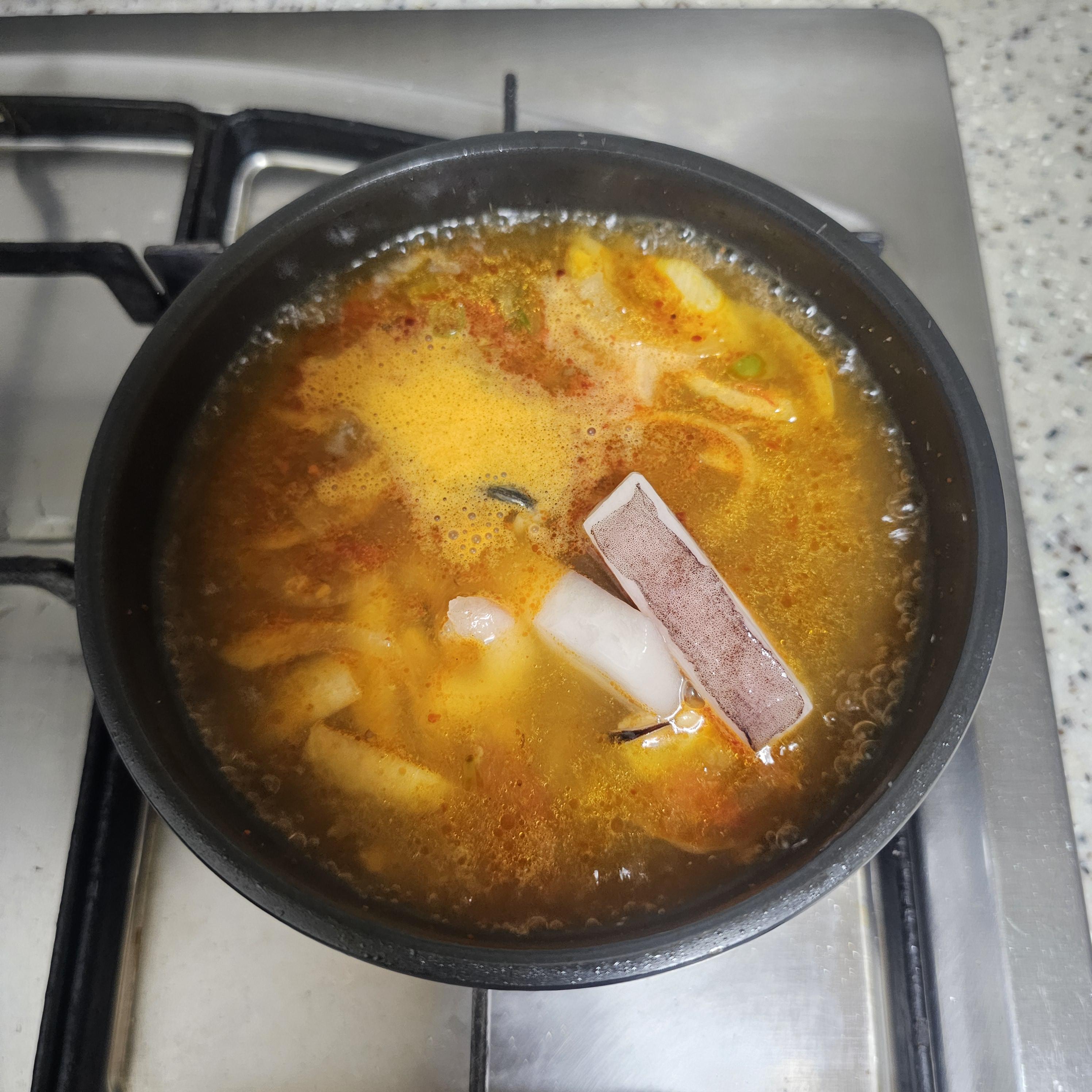 육수가 팔팔 끓으면 모둠해물과 바지락을 넣어줍니다.