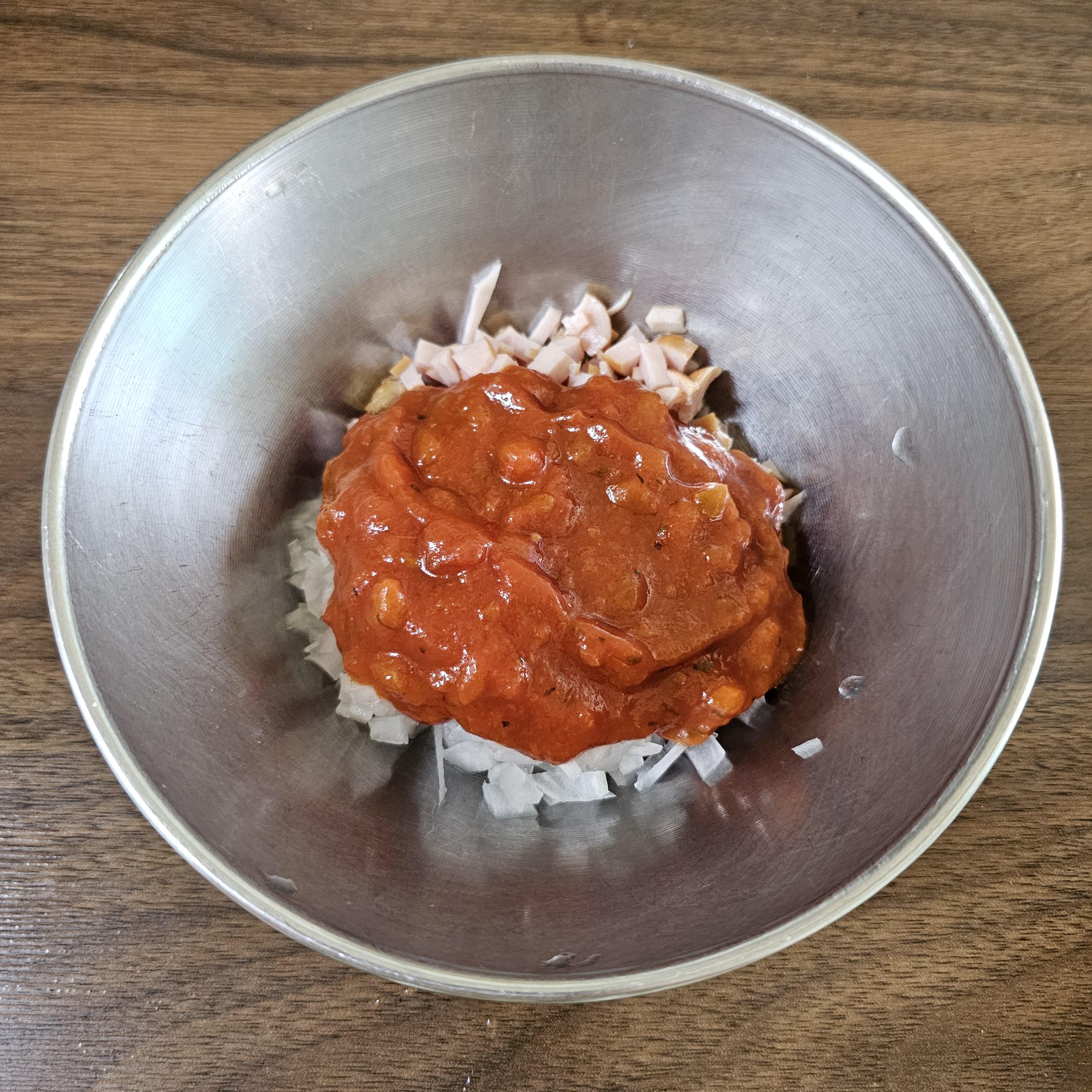 소시지와 양파에 토마토소스 2~3스푼을 넣어 섞어주세요!