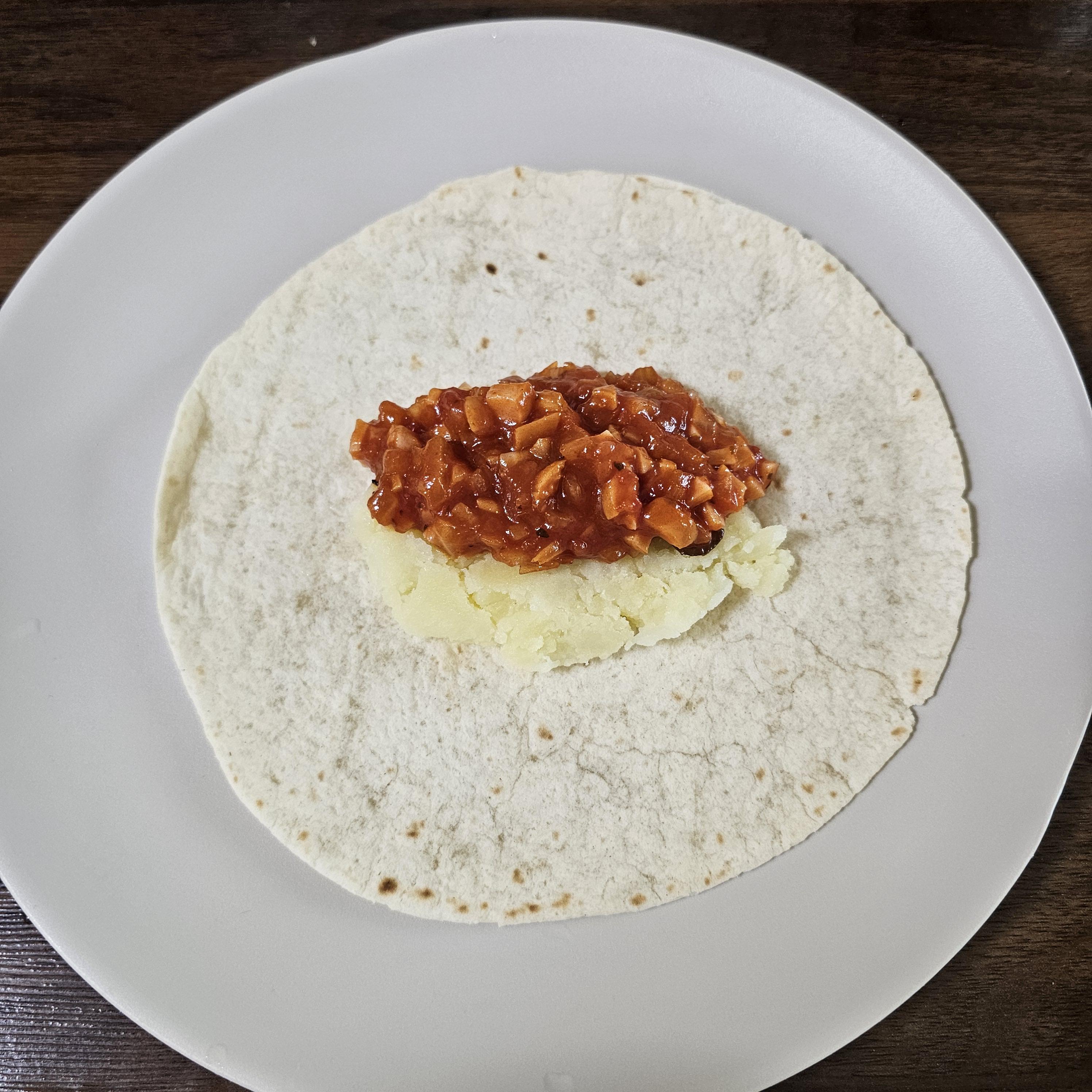 또띠아 위에 으깬감자를 넣고 토마토 소스를 올려줍니다.