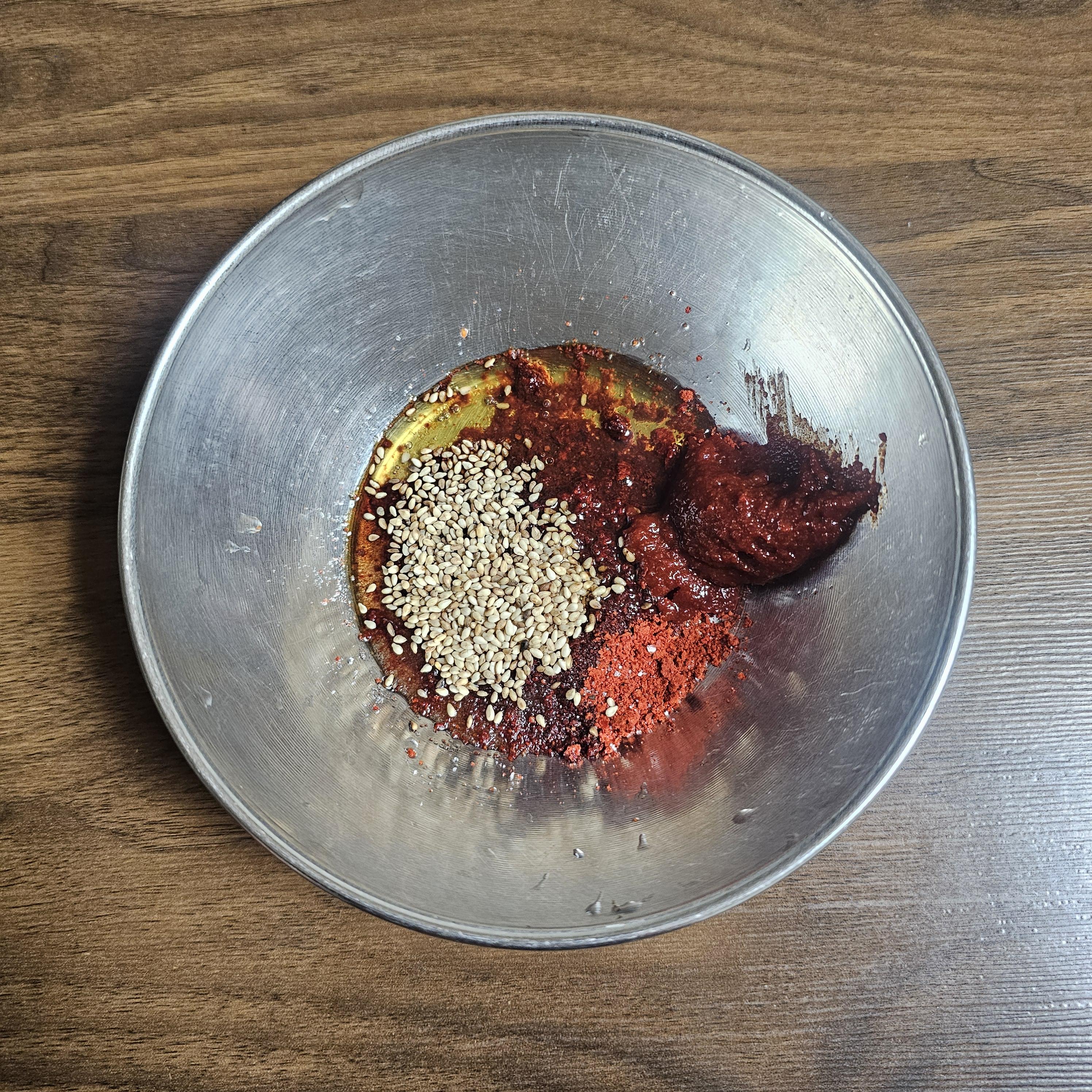 고추장 1, 고춧가루 1, 매실액 1, 참기름 1, 간장 0.5, 설탕 0.5, 깨를 넣고 양념장을 만들어 주세요.