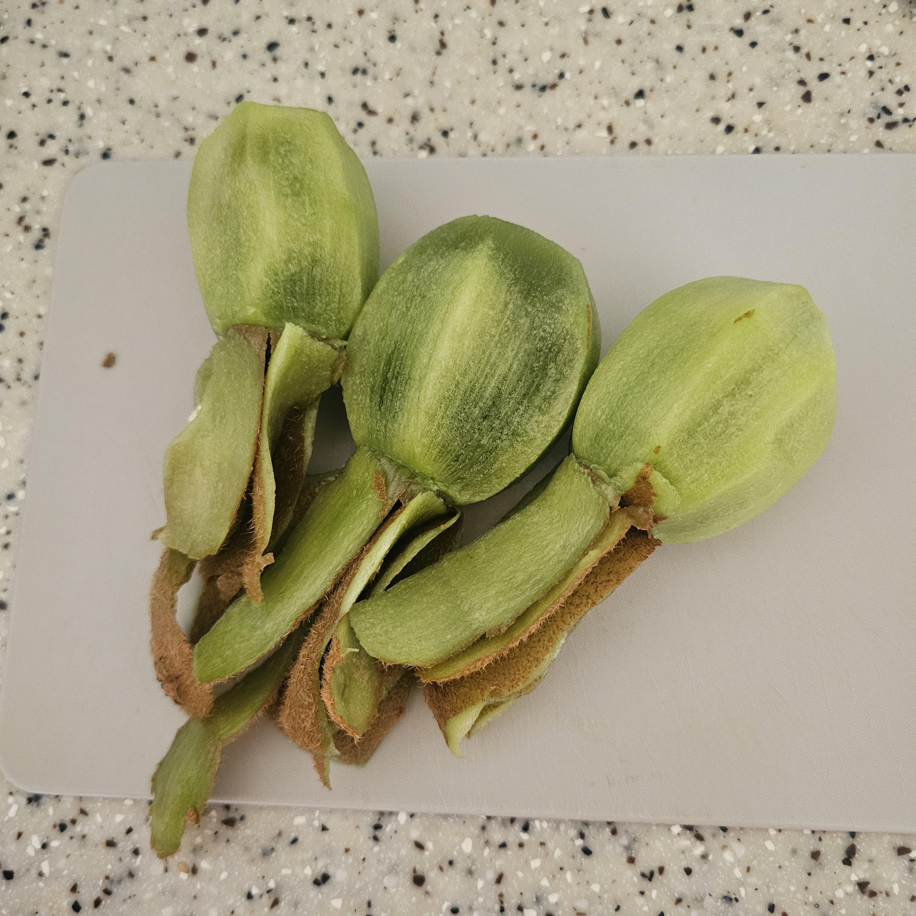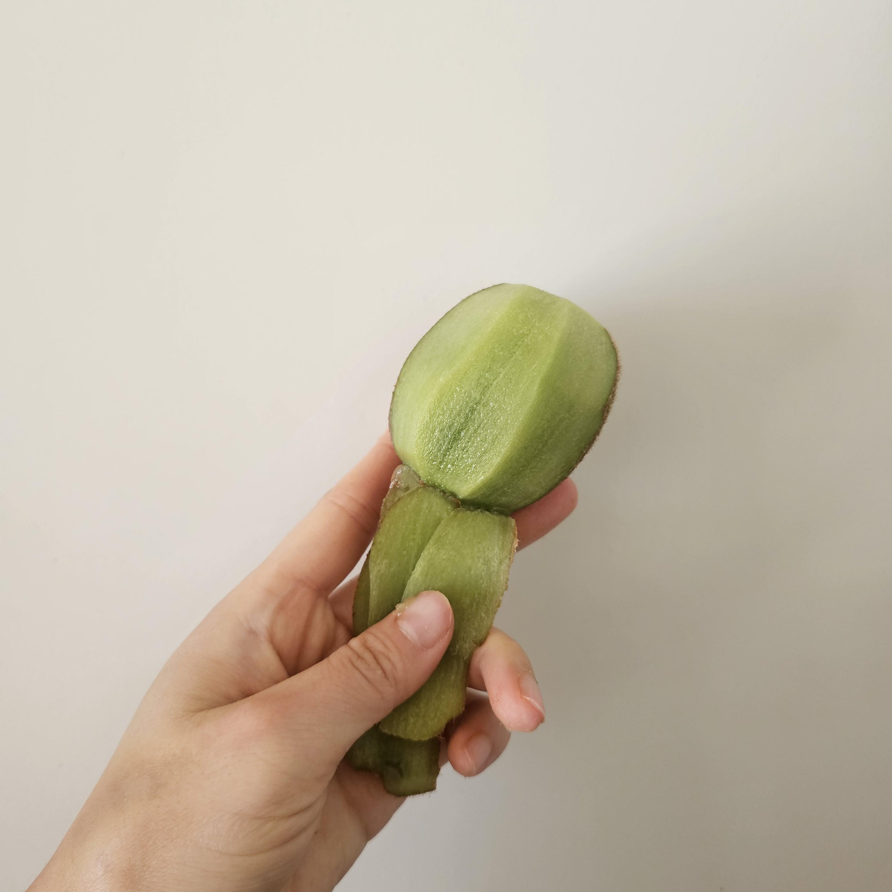 이렇게 껍질을 제거한 부분 손잡이처럼 잡고 남은 껍질을 제거하면 키위 속을 안 만지고 깨끗하게 깔 수 있습니다.