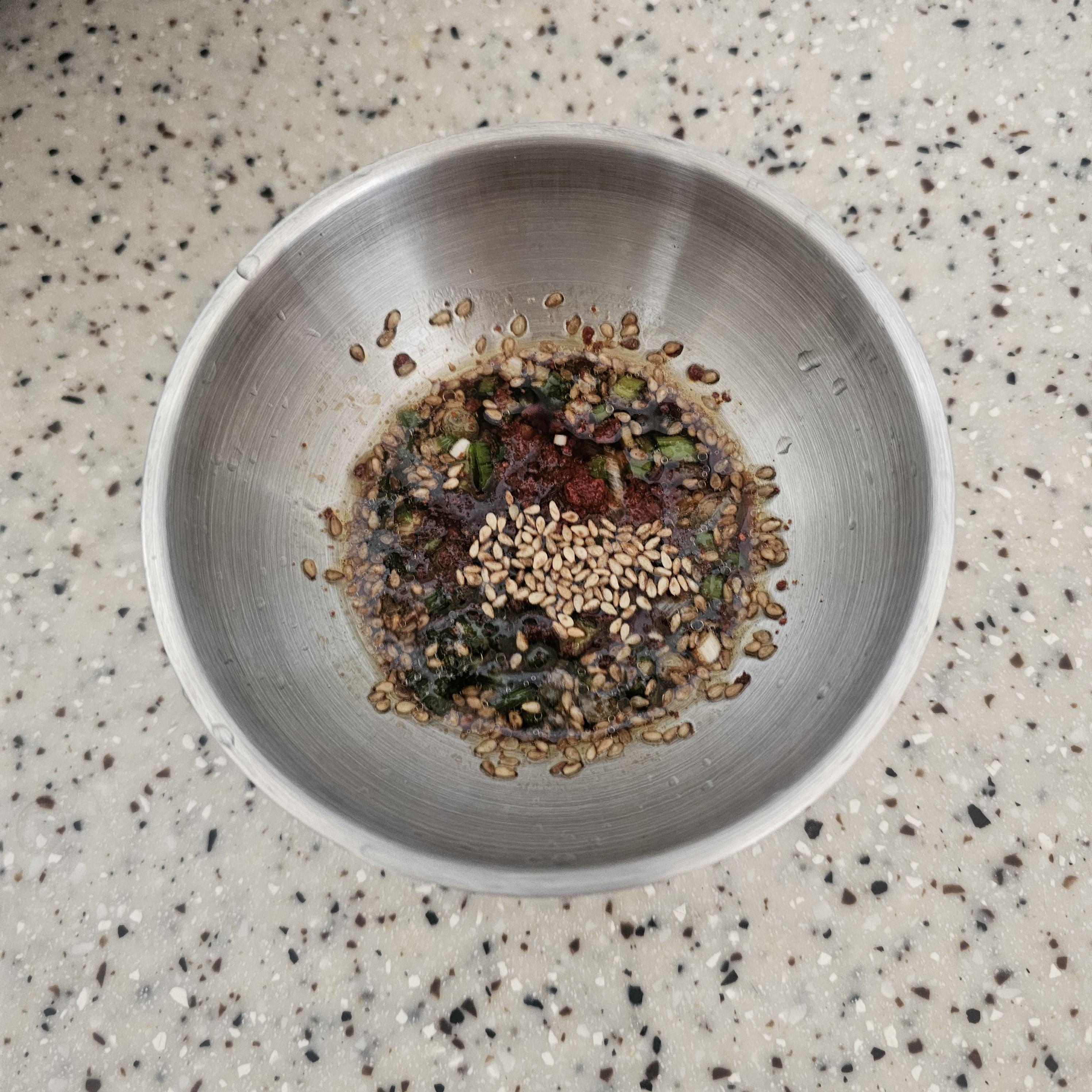 간장 3, 참기름 1, 고춧가루 1, 식초 0.5, 파, 깨를 넣어 만들어줍니다.