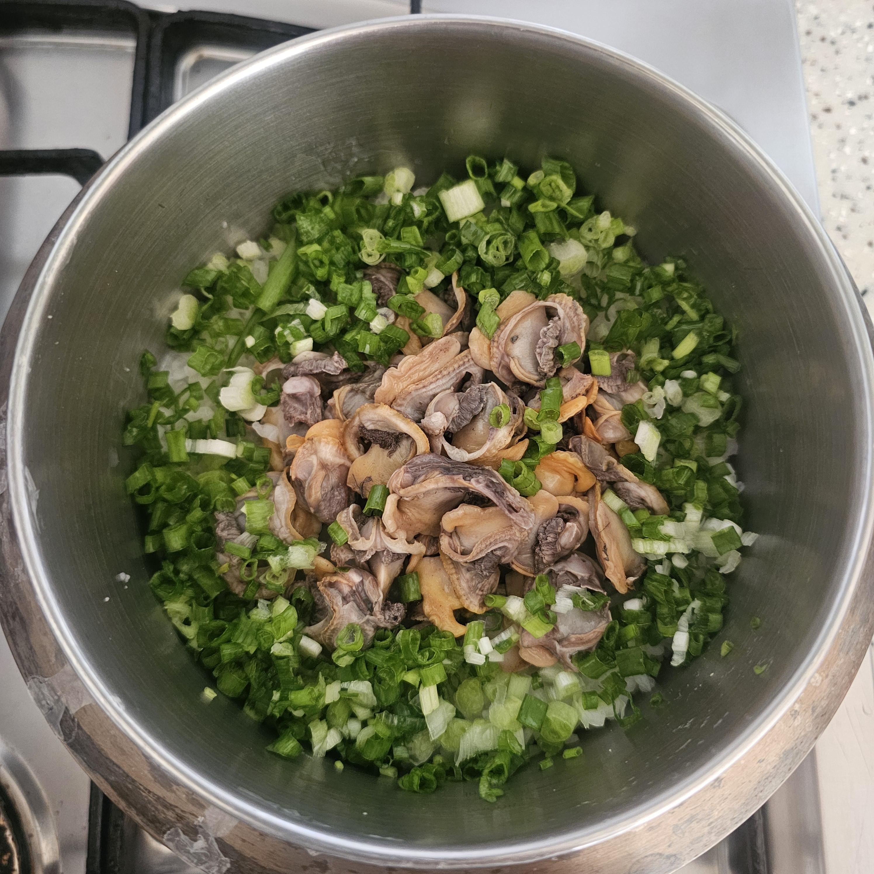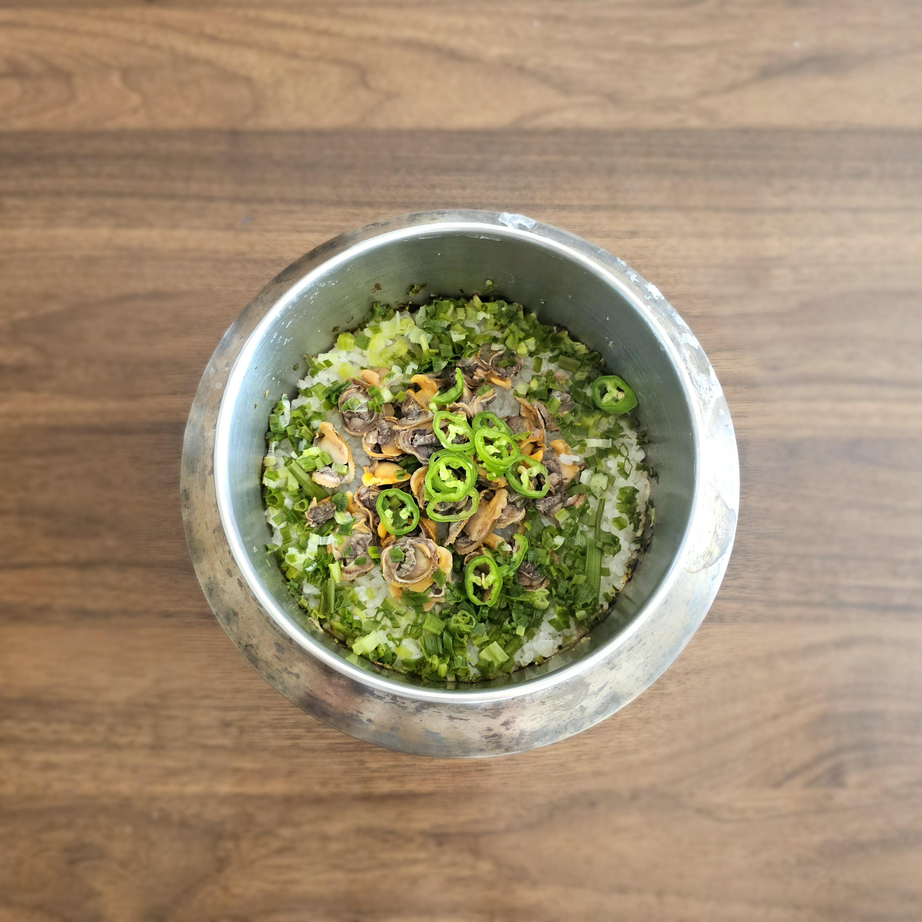 뜸 들이기 전 밥알이 다 익었으면 파를 얹고 꼬막살을 가운데 넣어줍니다.