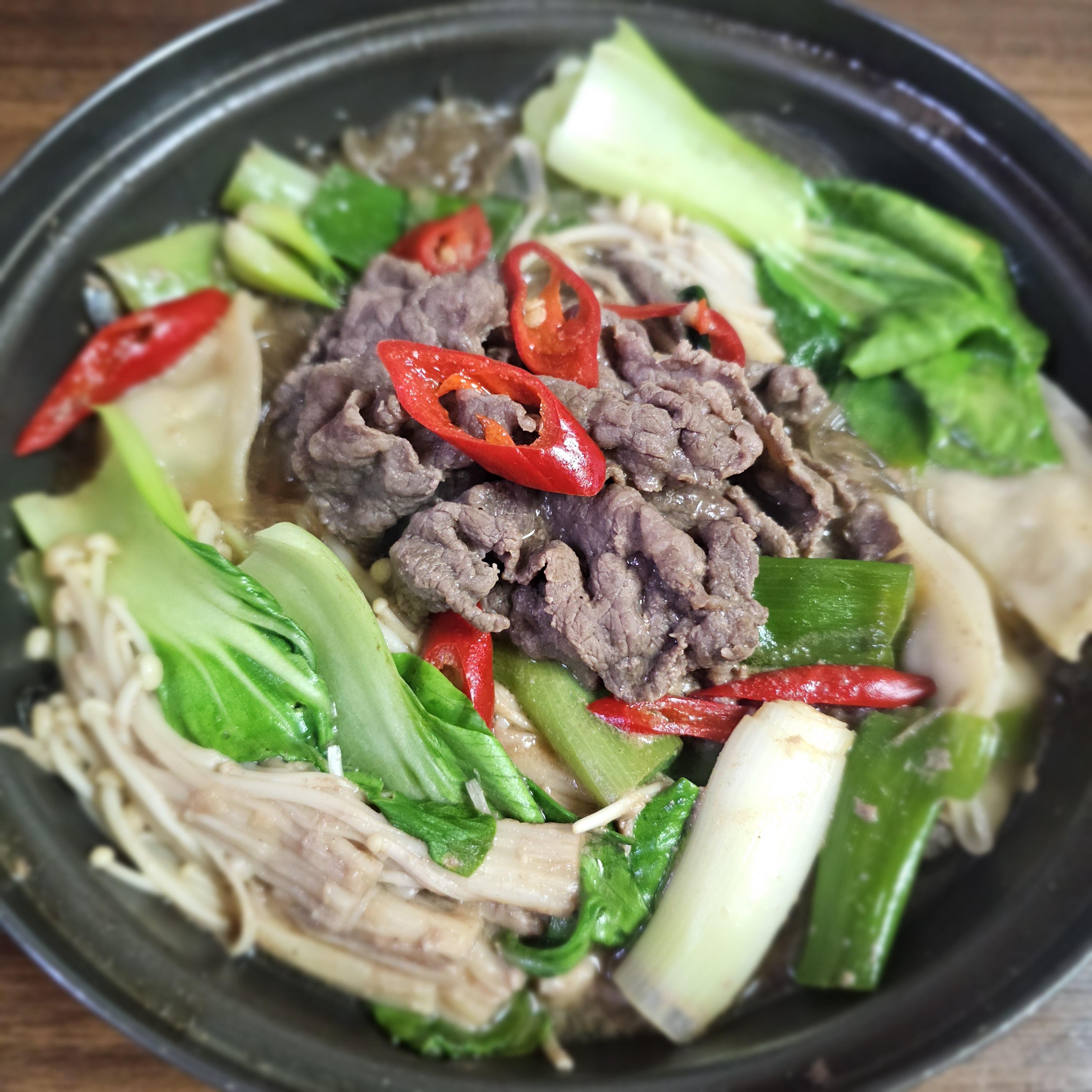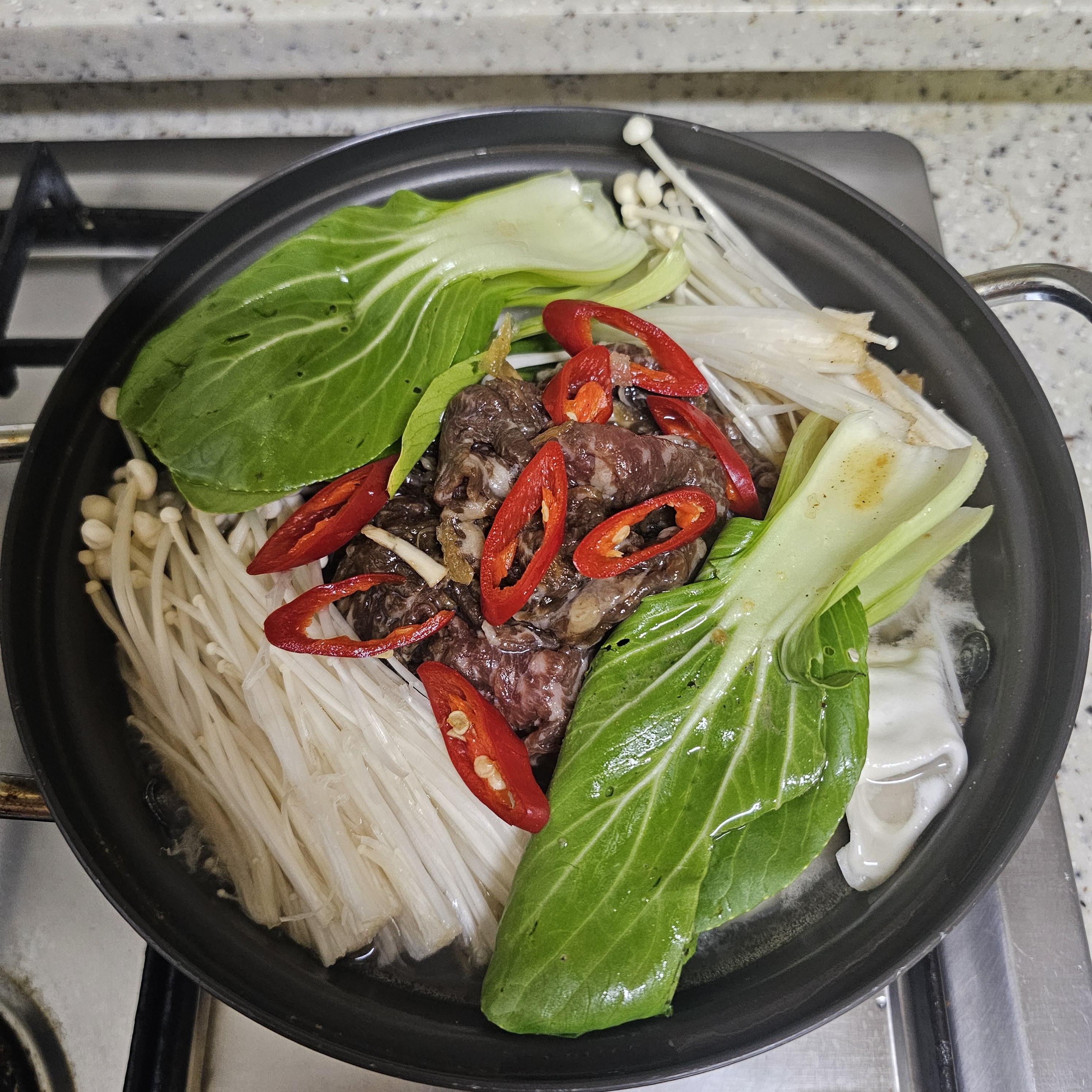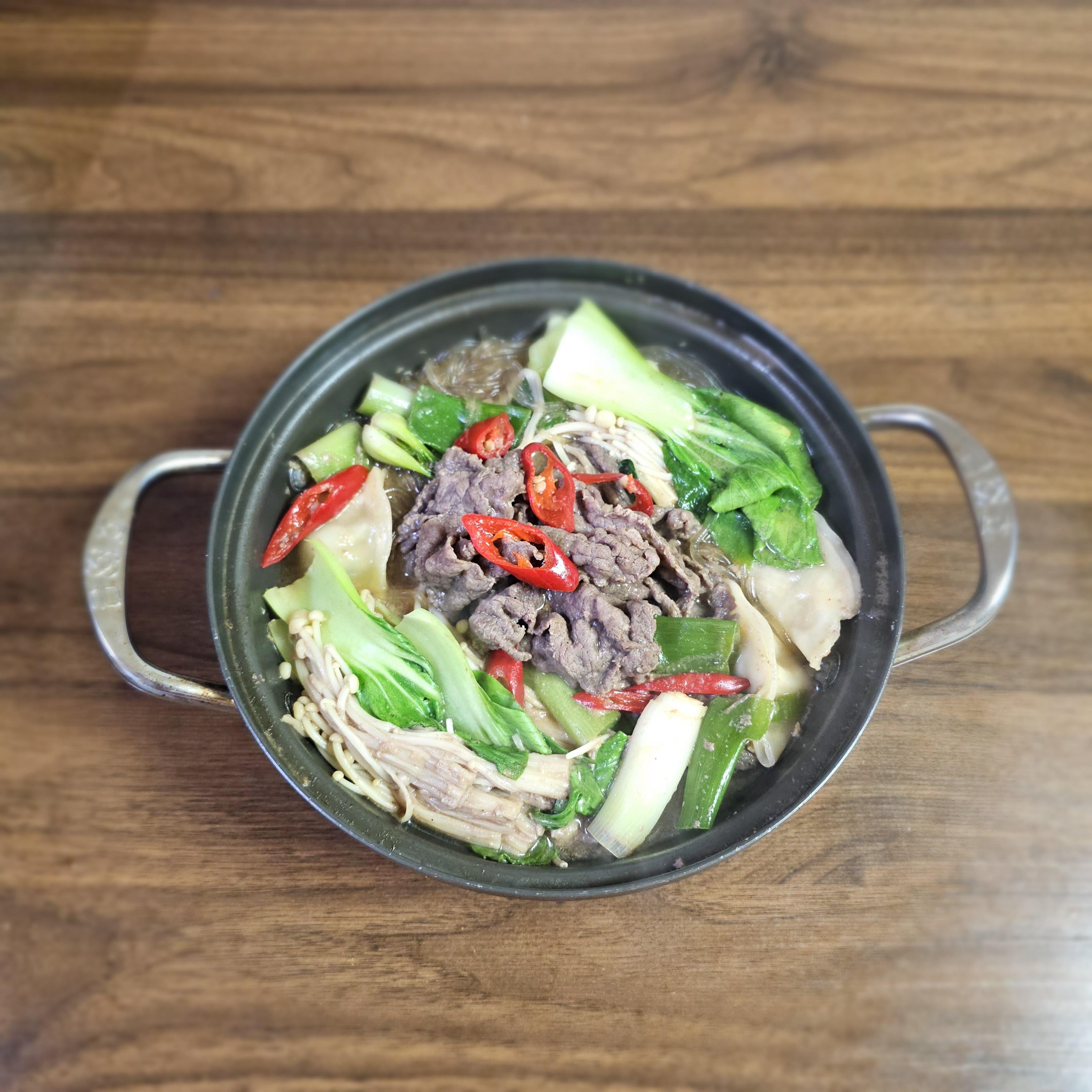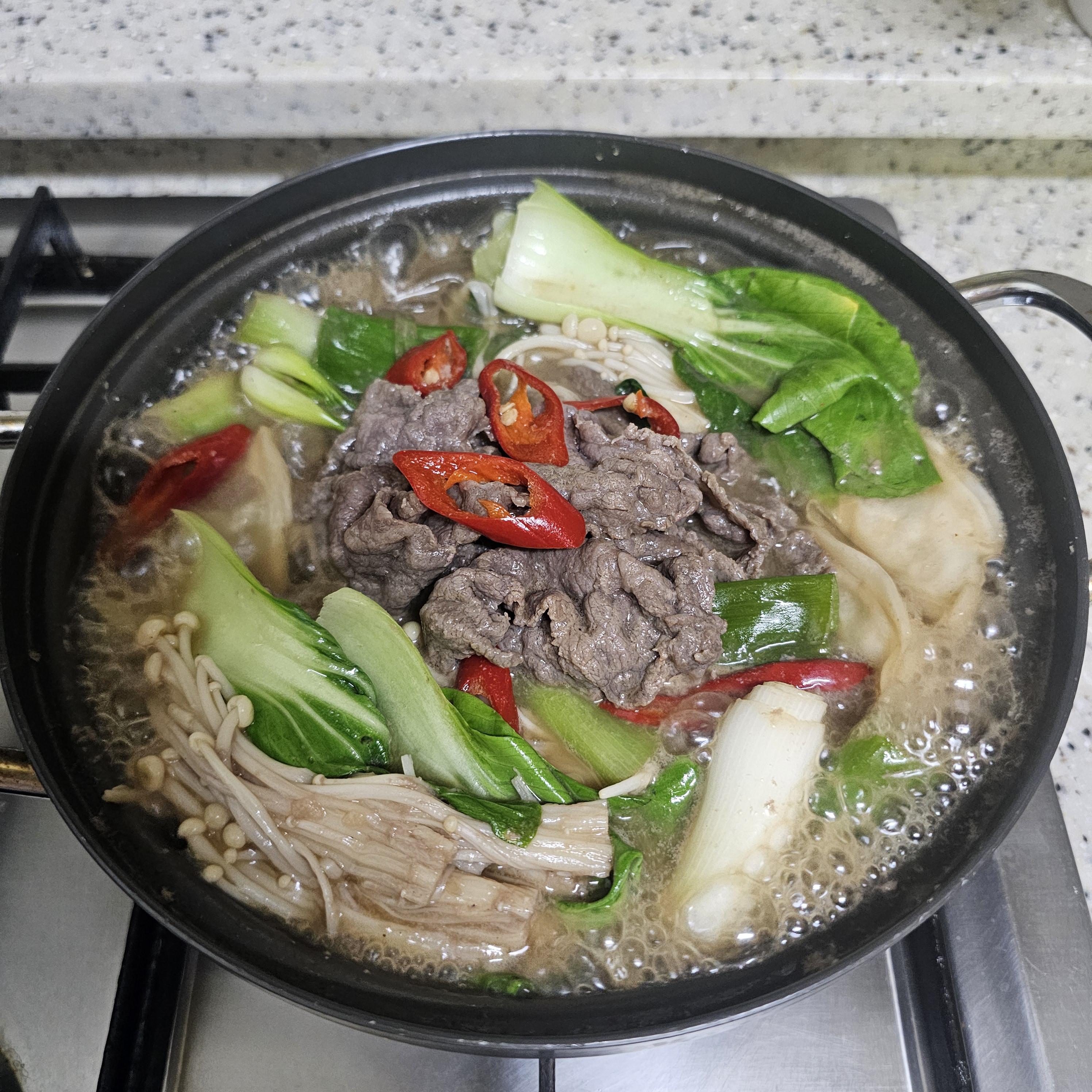 불고기용 소고기, 대파, 고추, 청경채, 팽이버섯, 만두, 불린 당면,