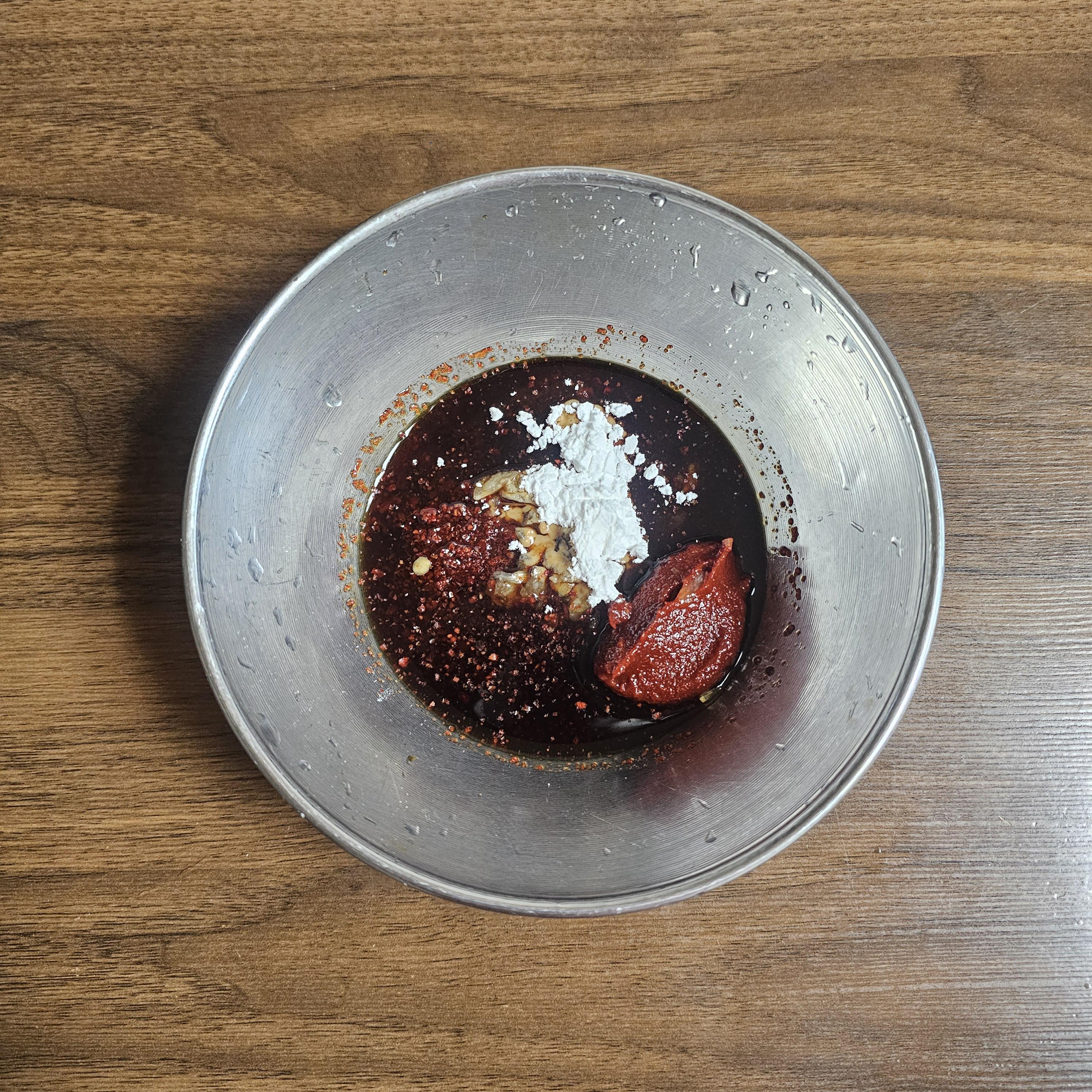 간장 2, 다진 마늘 1, 고추장 0.5, 고춧가루 1, 전분 0.5~1, 설탕 1.5를 넣어 잘 섞어주세요.