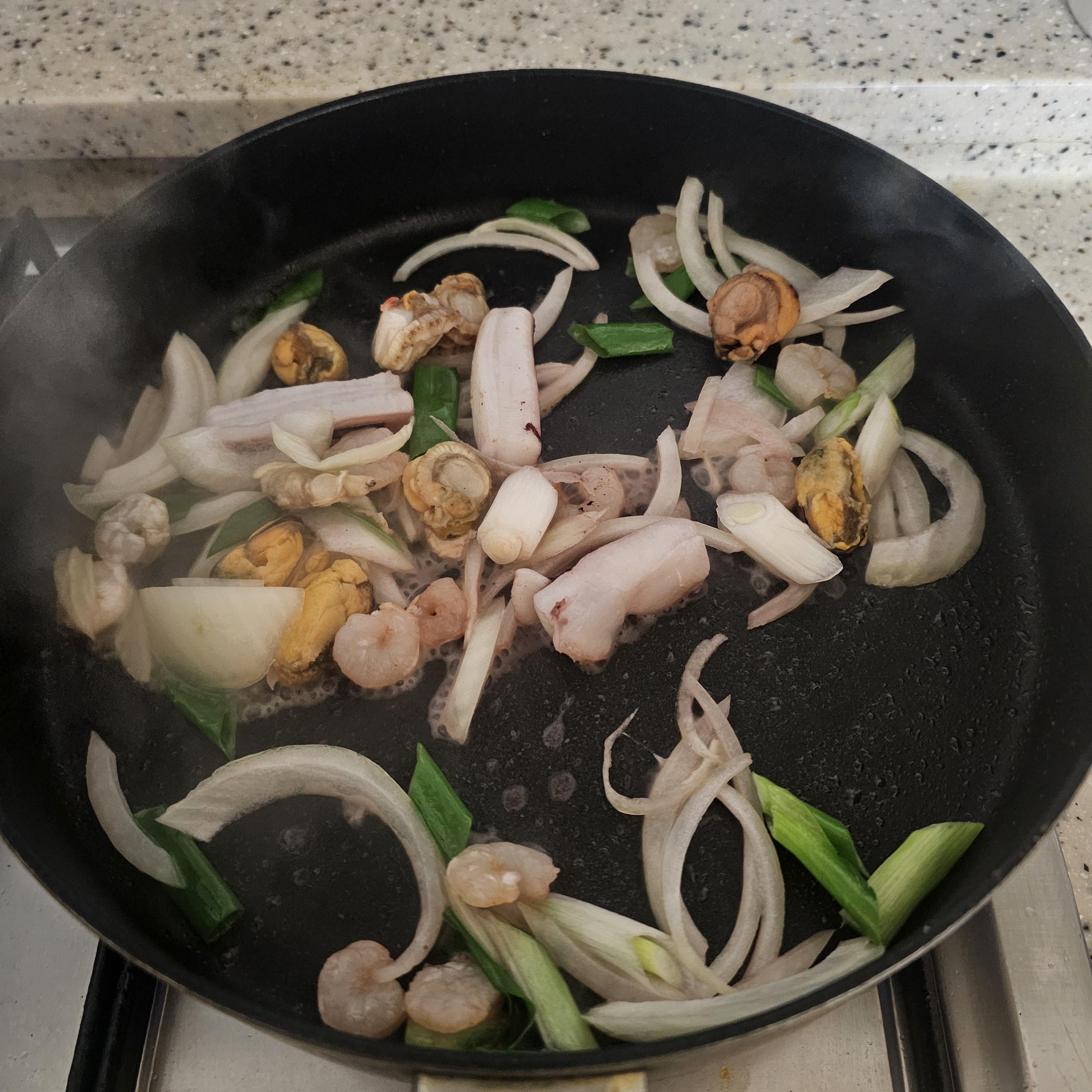 프라이팬에 기름을 두른 뒤 해물과 양파, 파를 넣고 달달 볶아줍니다.