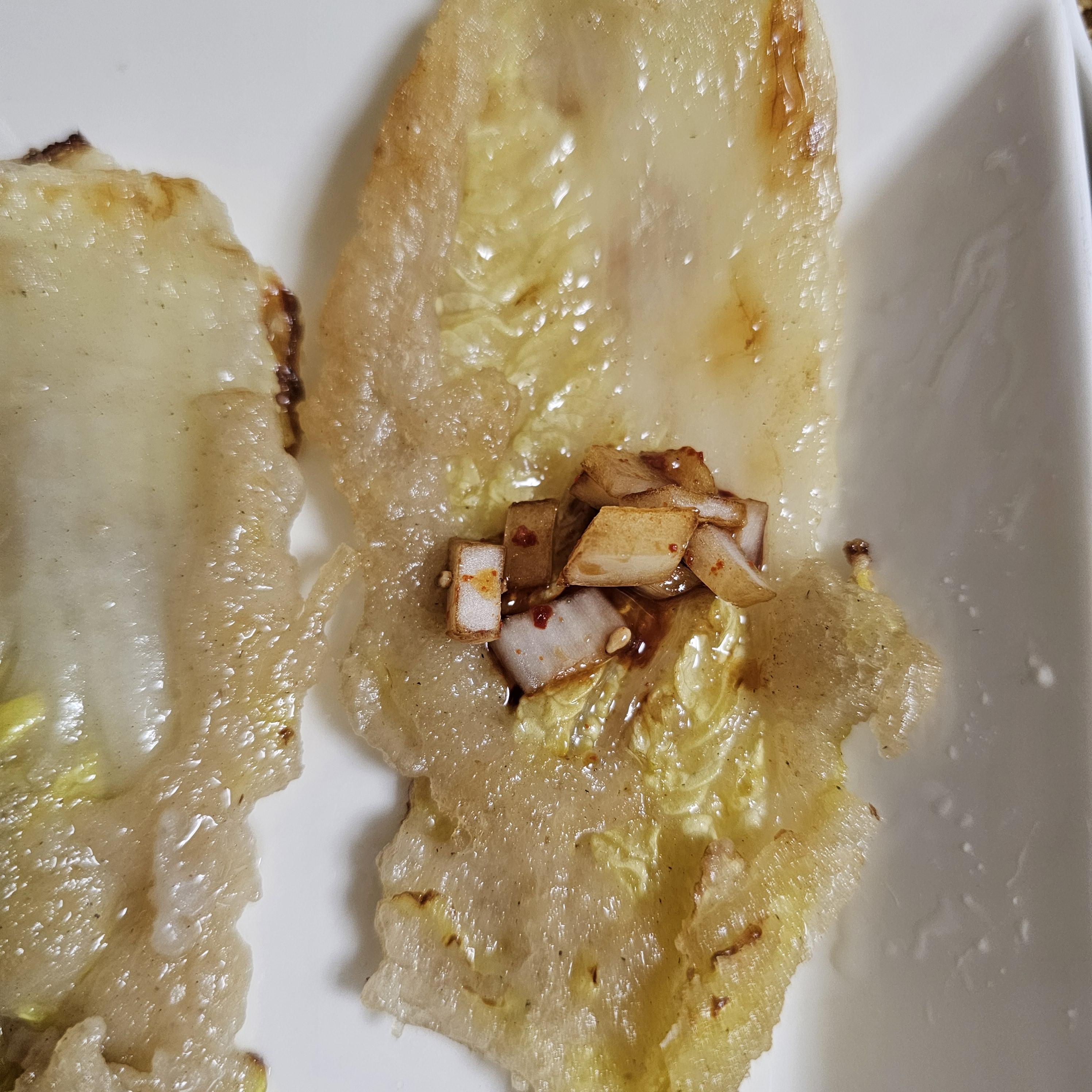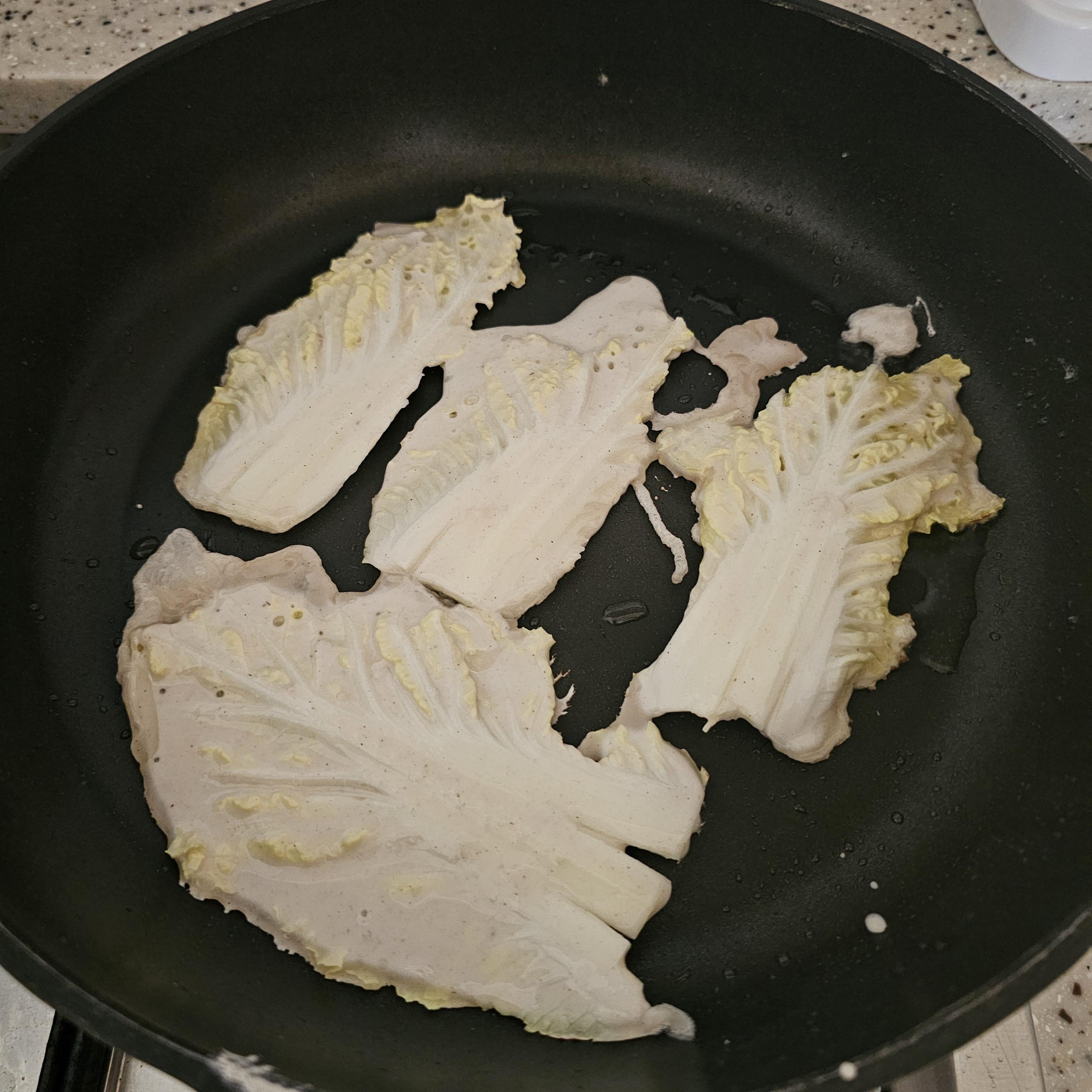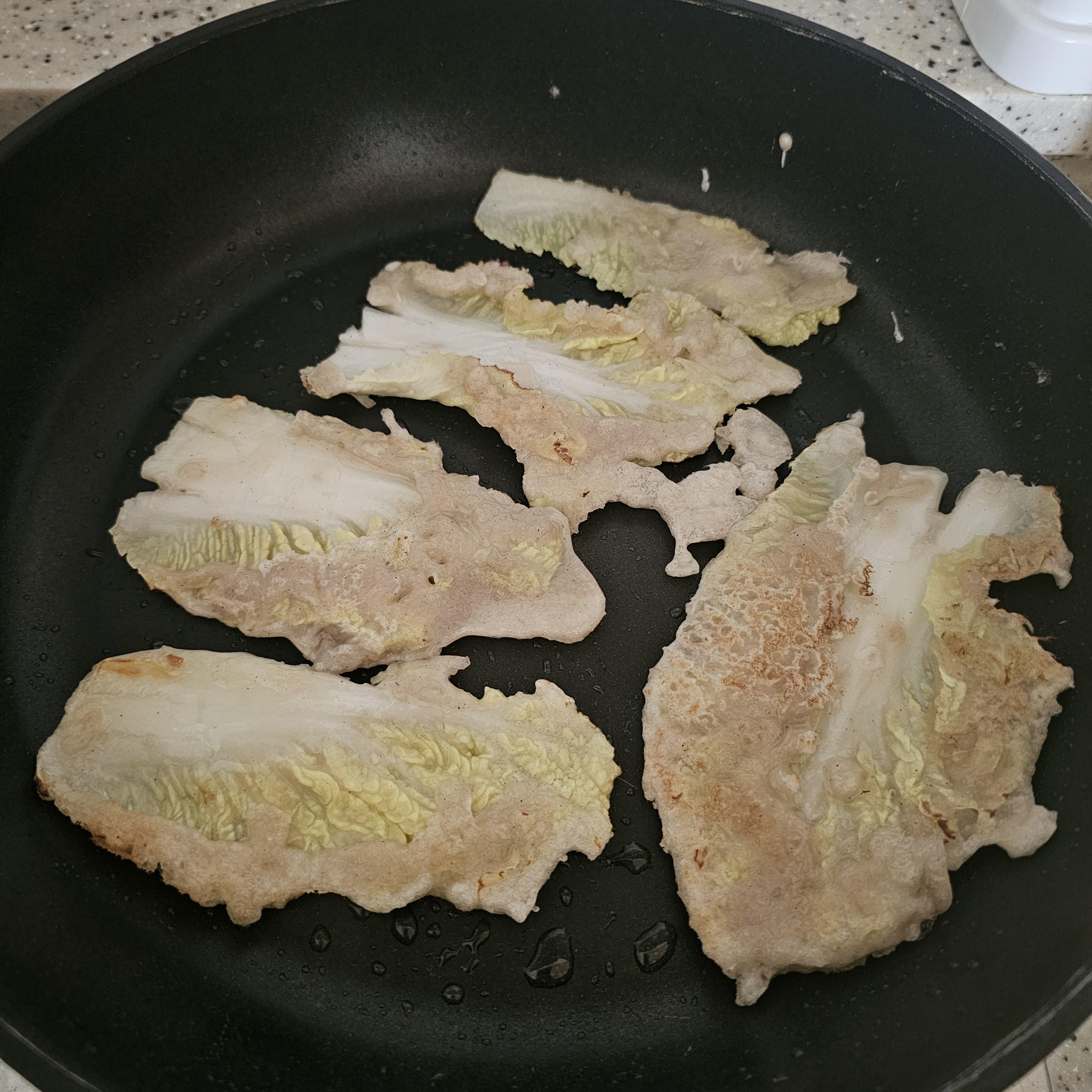 기름을 두른 프라이팬에 반죽한 배추를 얹어주세요.