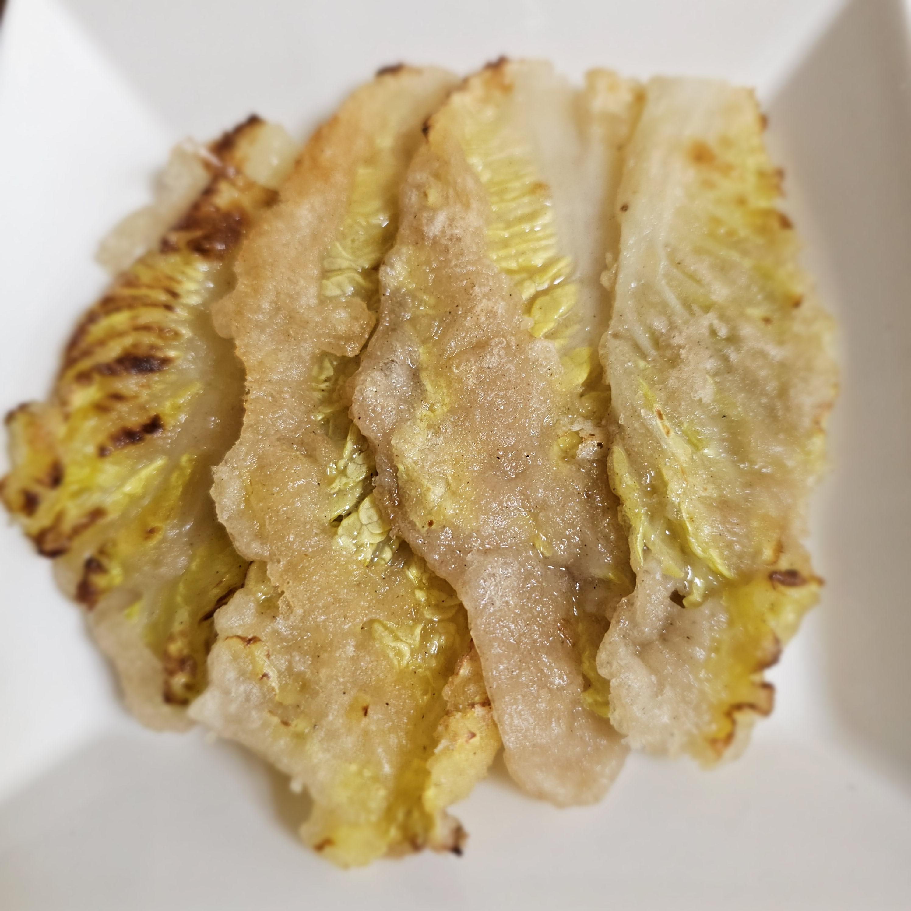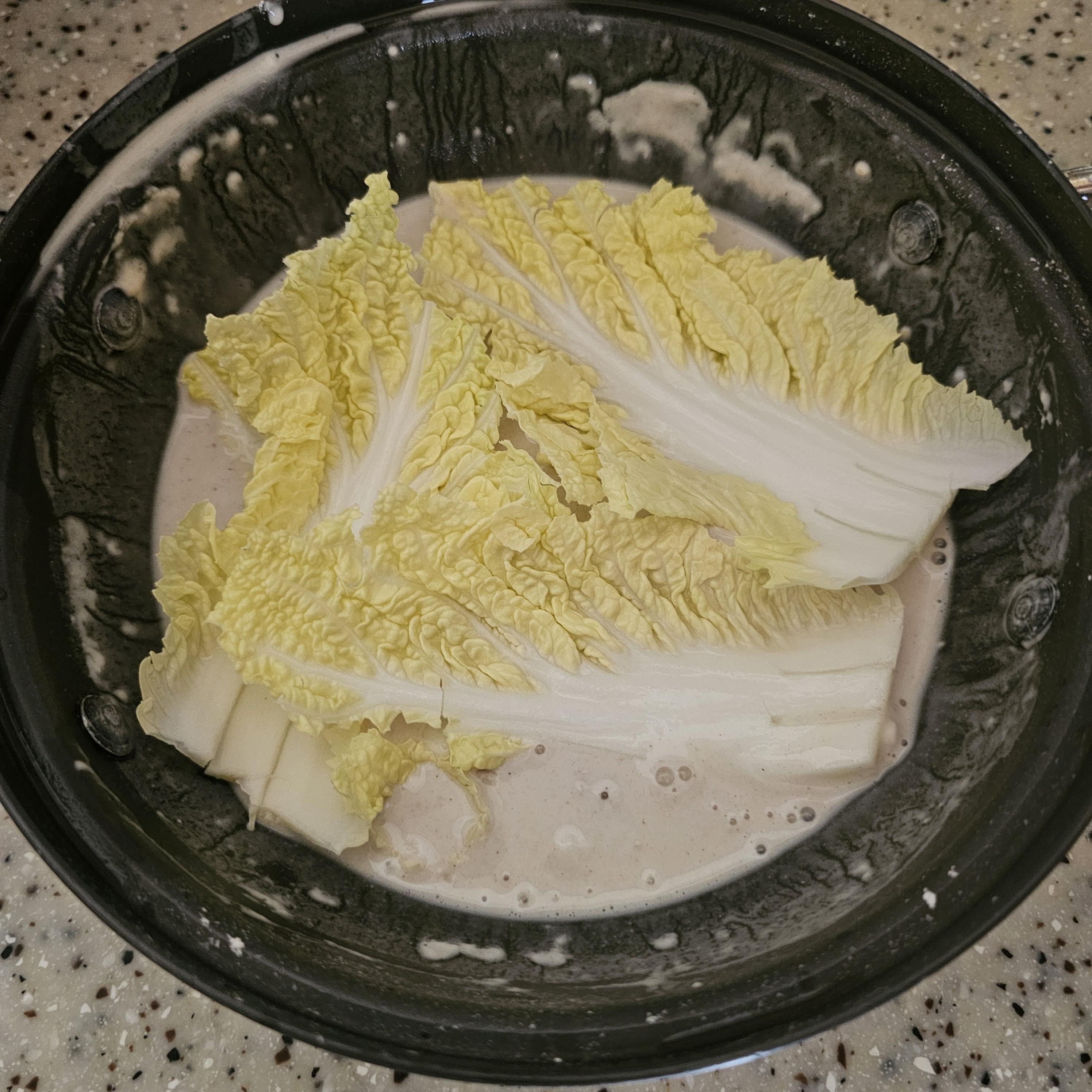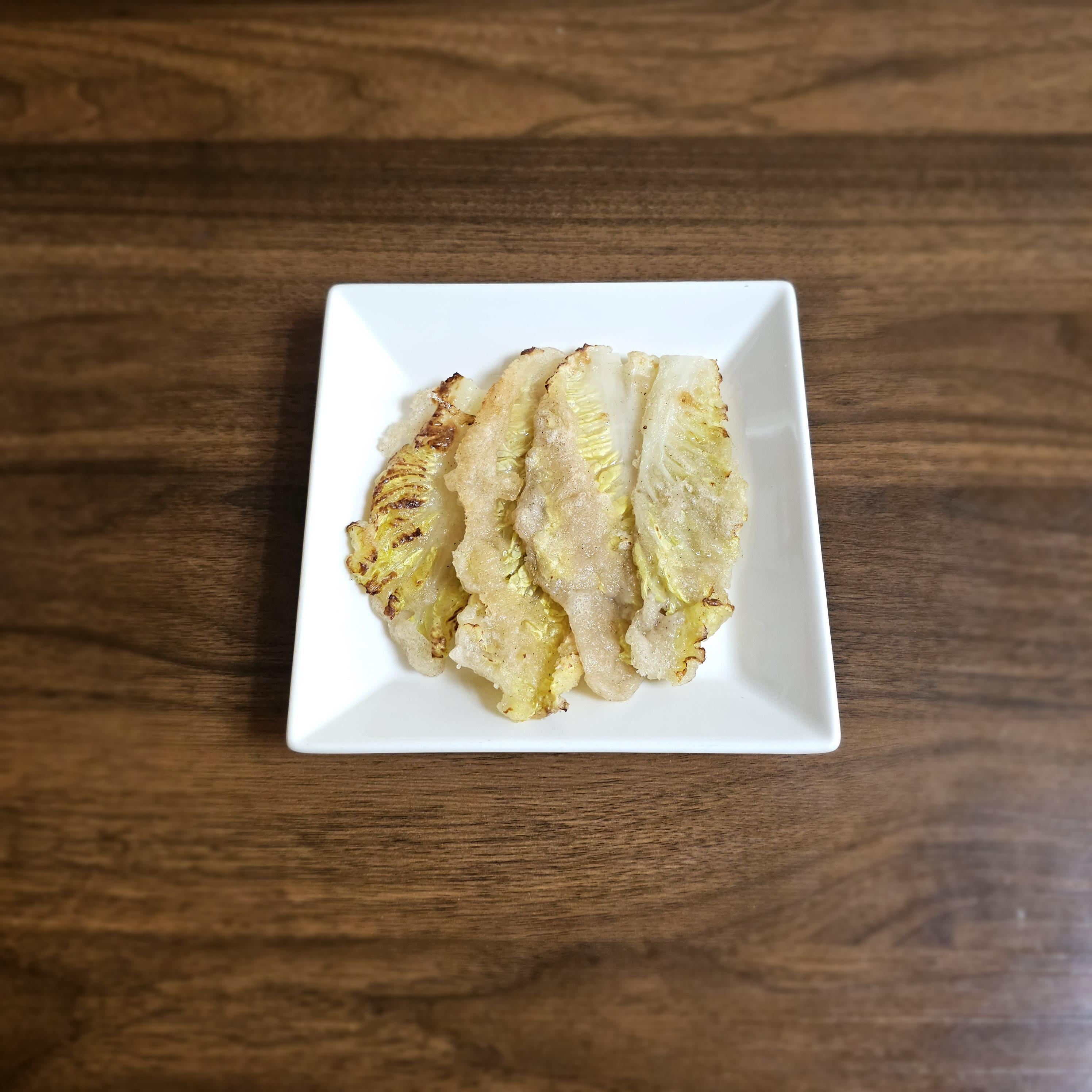 기름을 두른 프라이팬에 반죽한 배추를 얹어주세요.