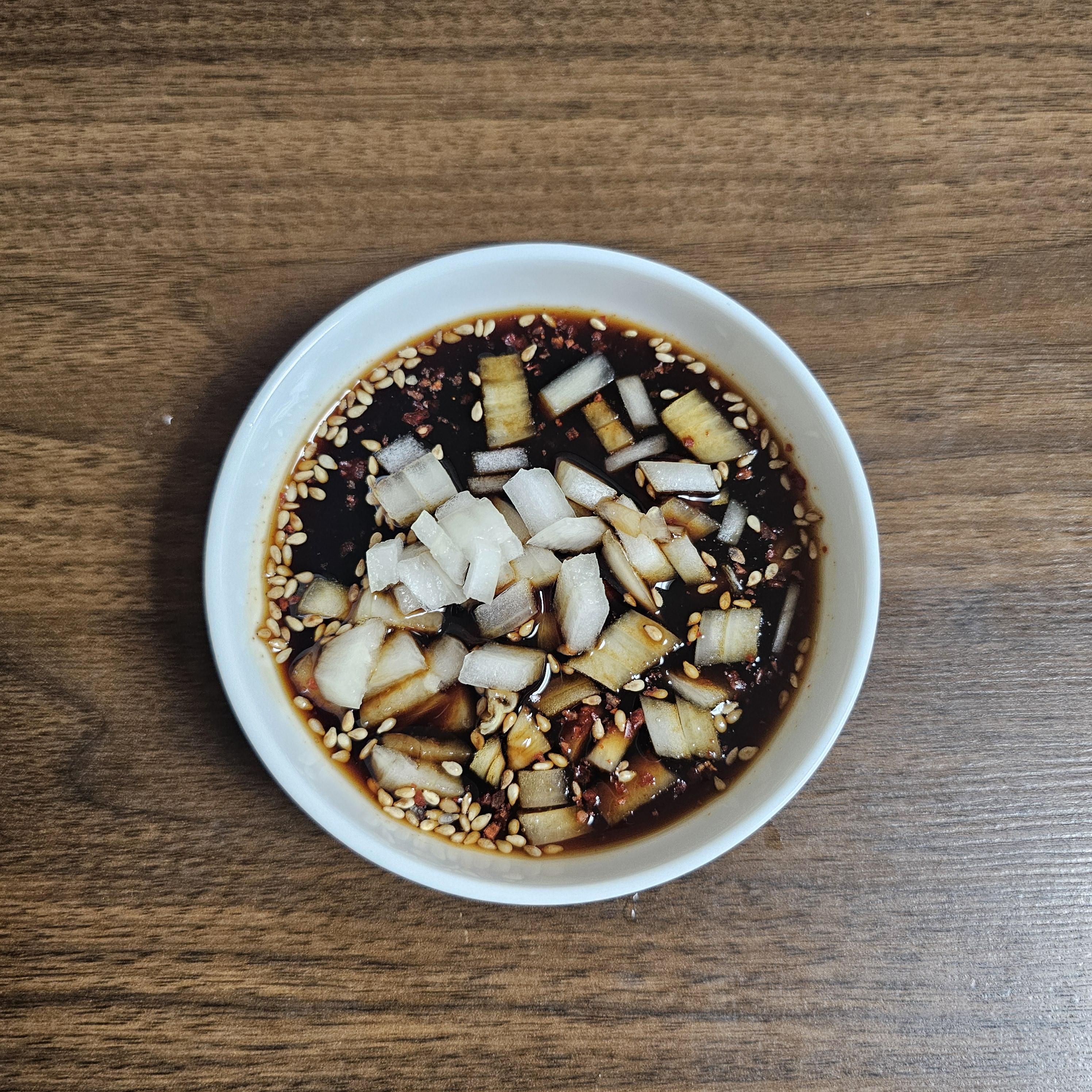 간장 2, 고춧가루 1, 깨, 양파를 썰어서 넣어주세요.