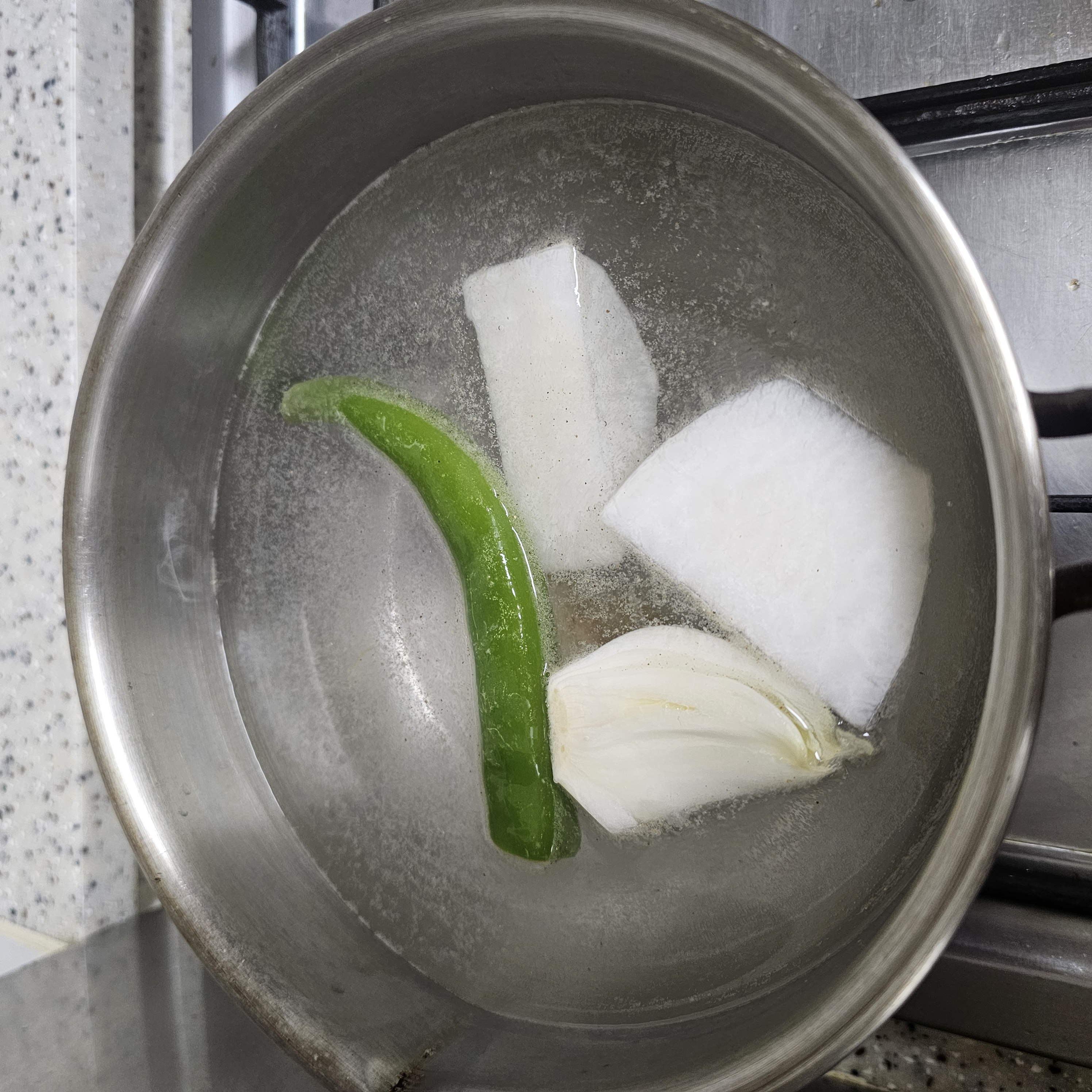냄비에 물을 넣고 코인육수 1, 고추, 양파, 무를 넣어 육수를 내줍니다.