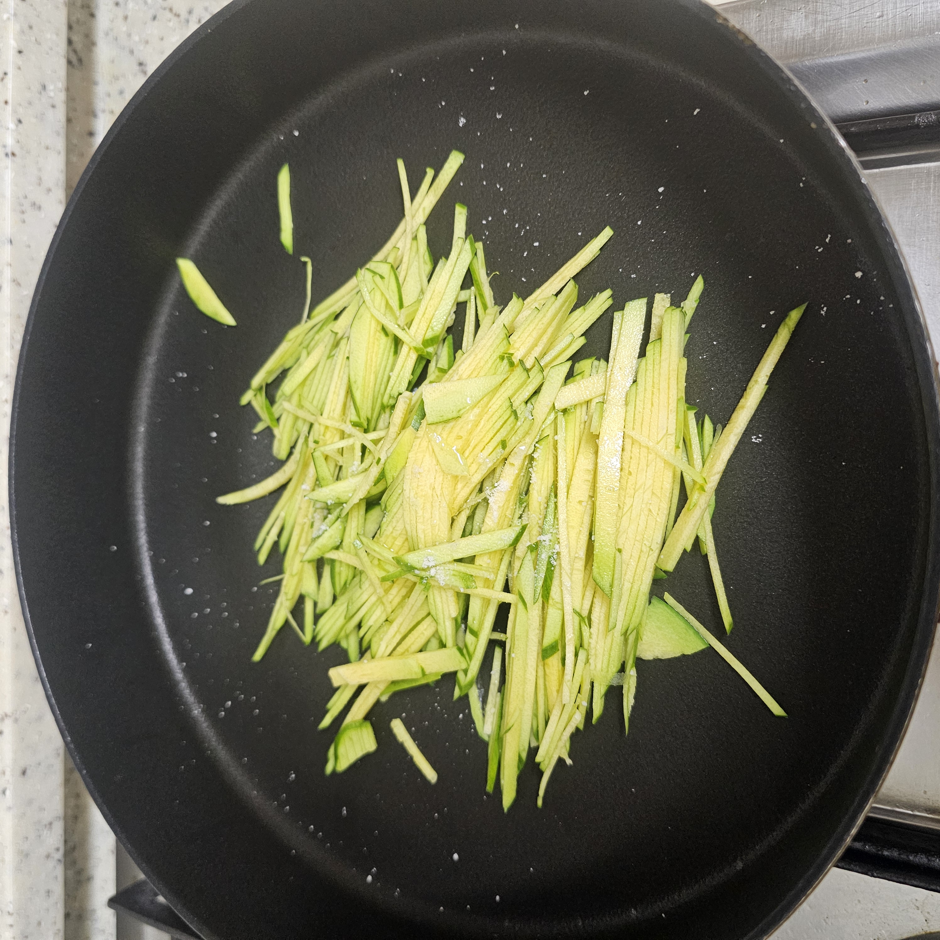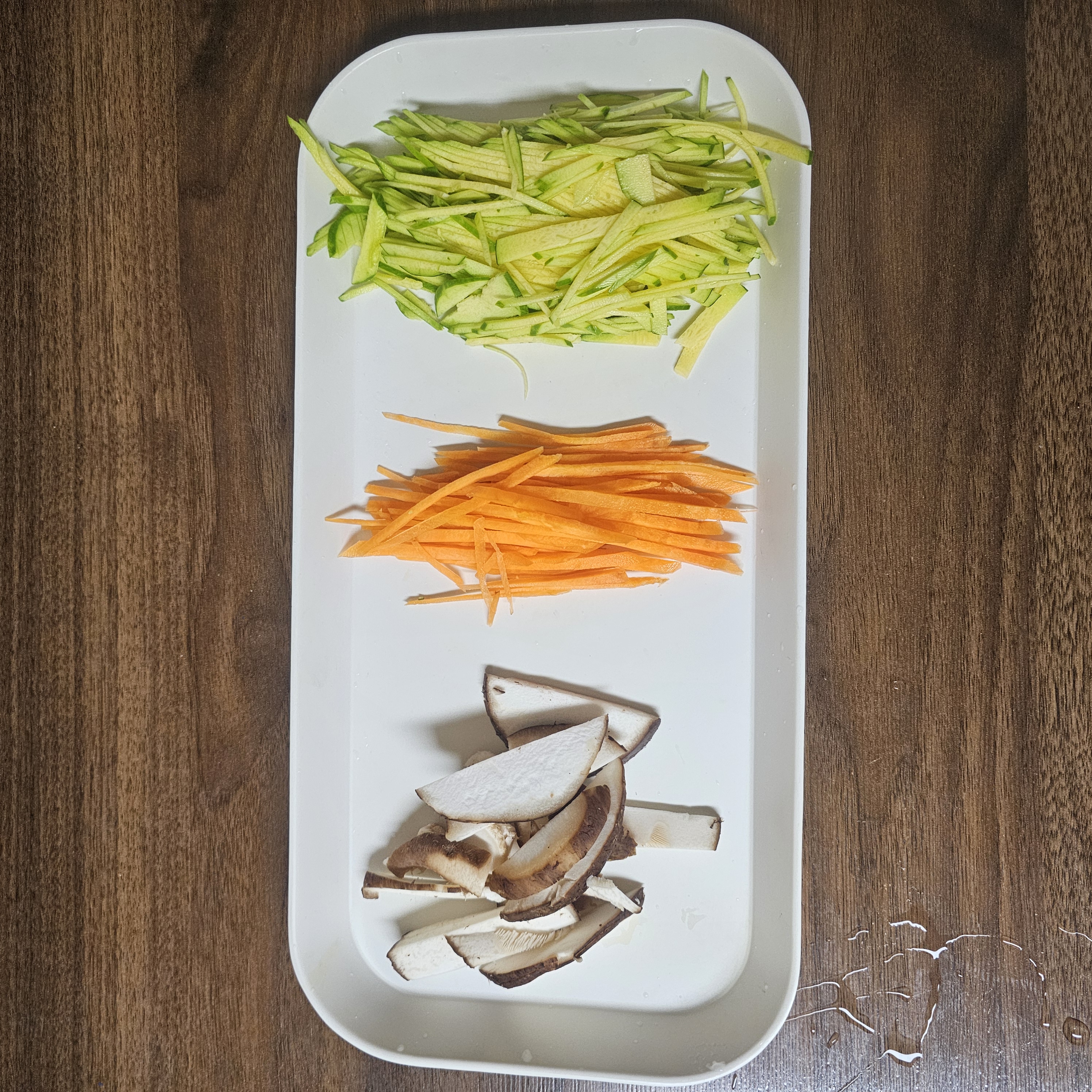 애호박, 당근, 버섯은 얇게 채 썰어 주세요.