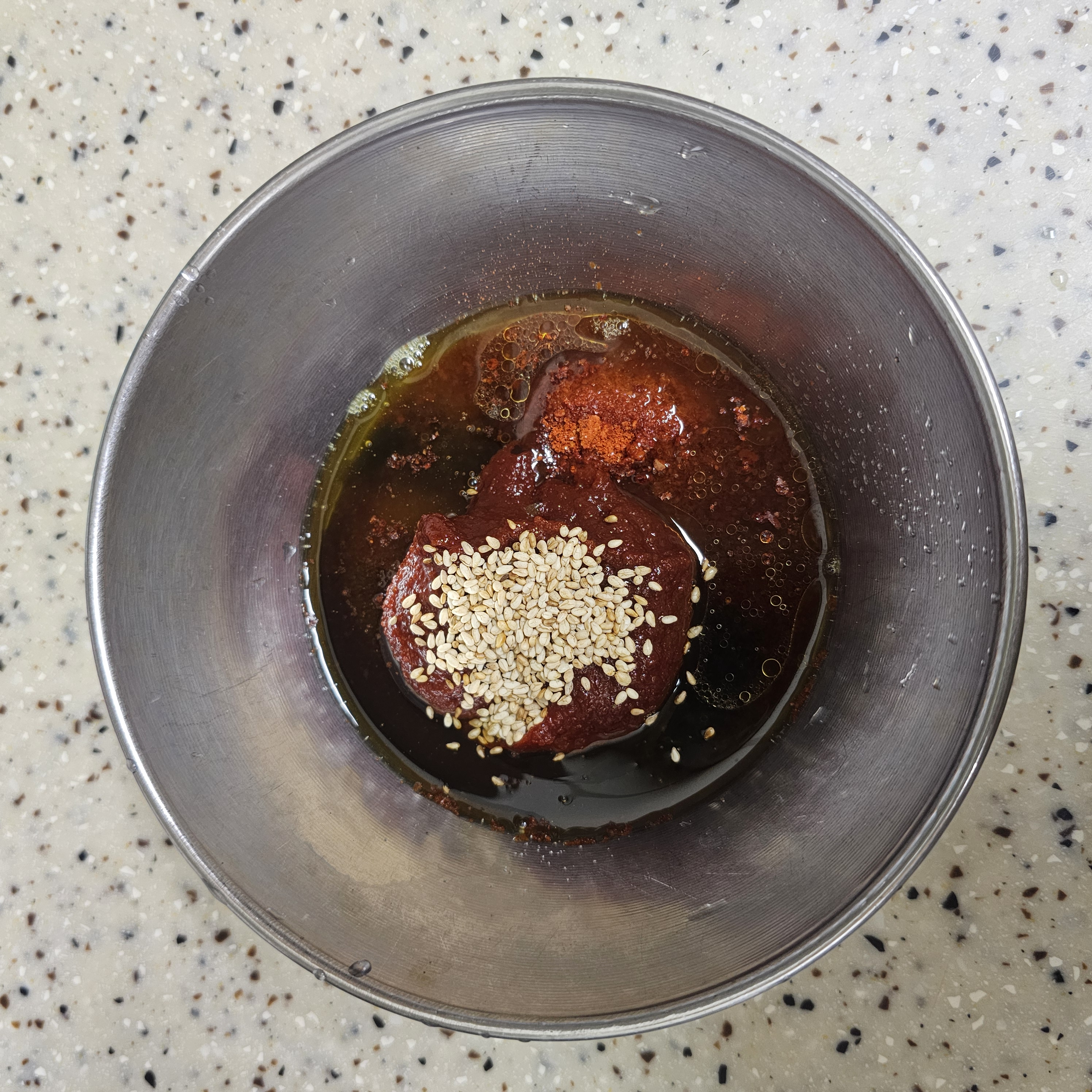 고추장 1, 고춧가루 1, 간장 0.5~1, 매실액 1, 설탕 0.5, 참기름 1, 식초 0.5, 깨를 넣어 만들어 줍니다.