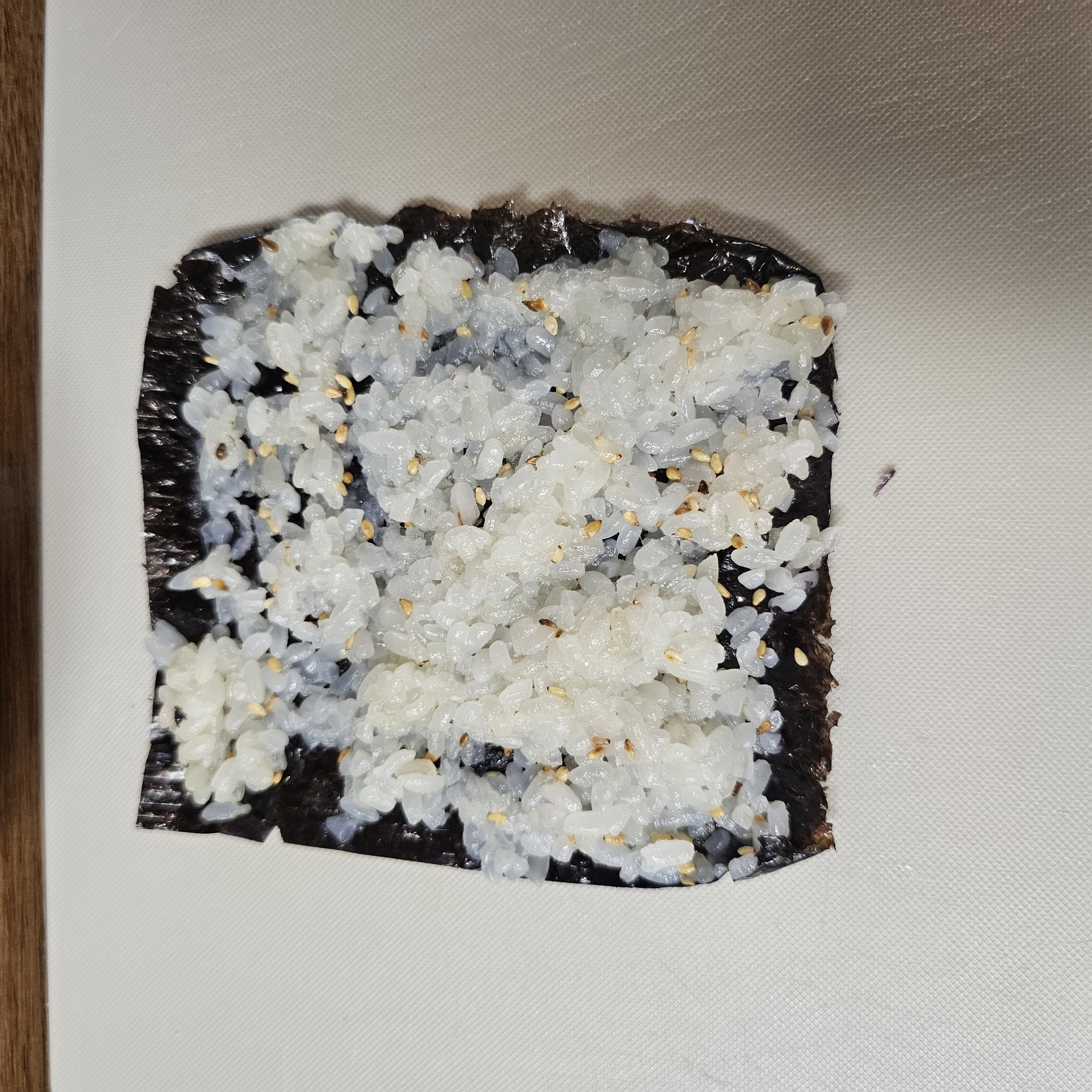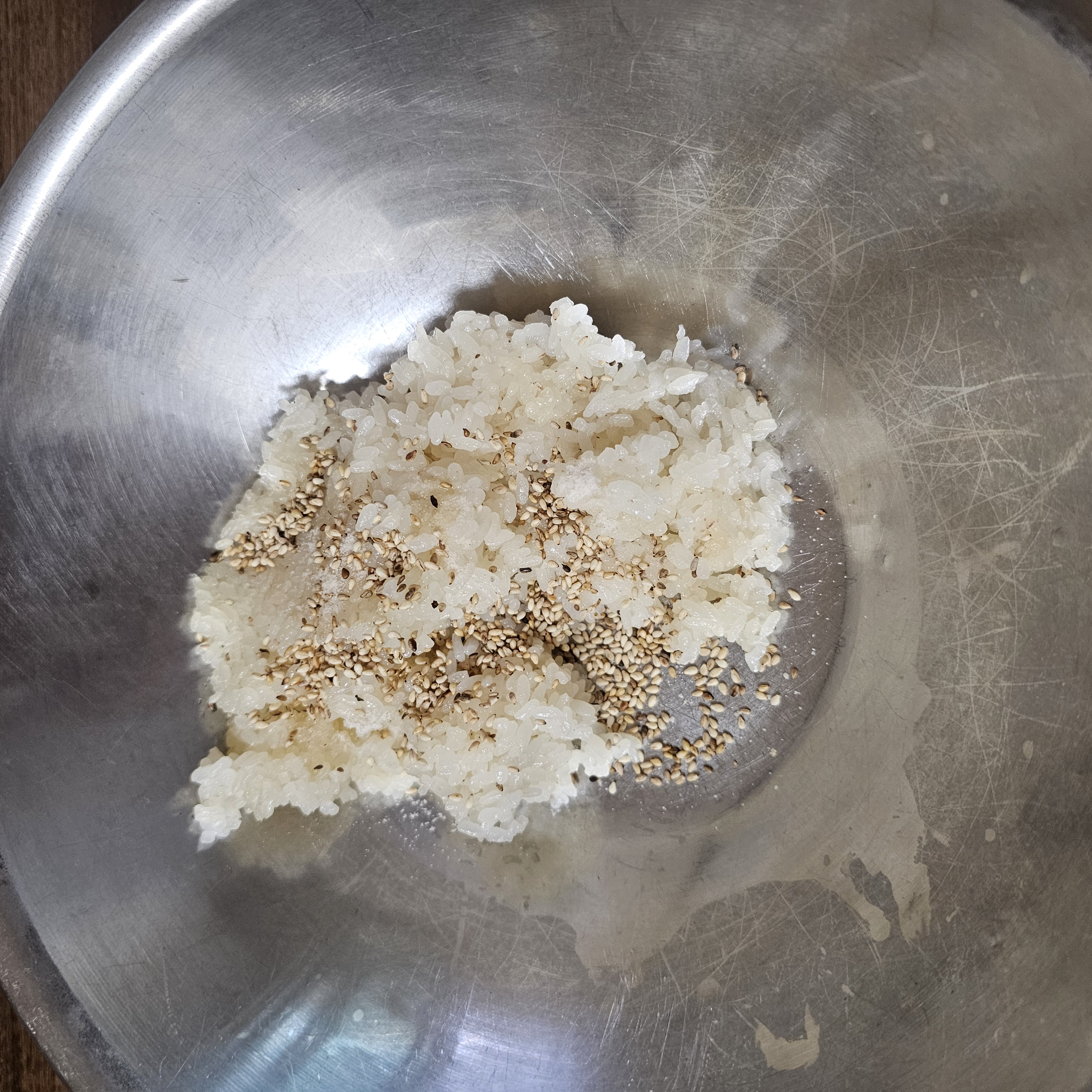 밥, 소금, 참기름, 깨를 넣어 밥에 양념을 해줍니다.