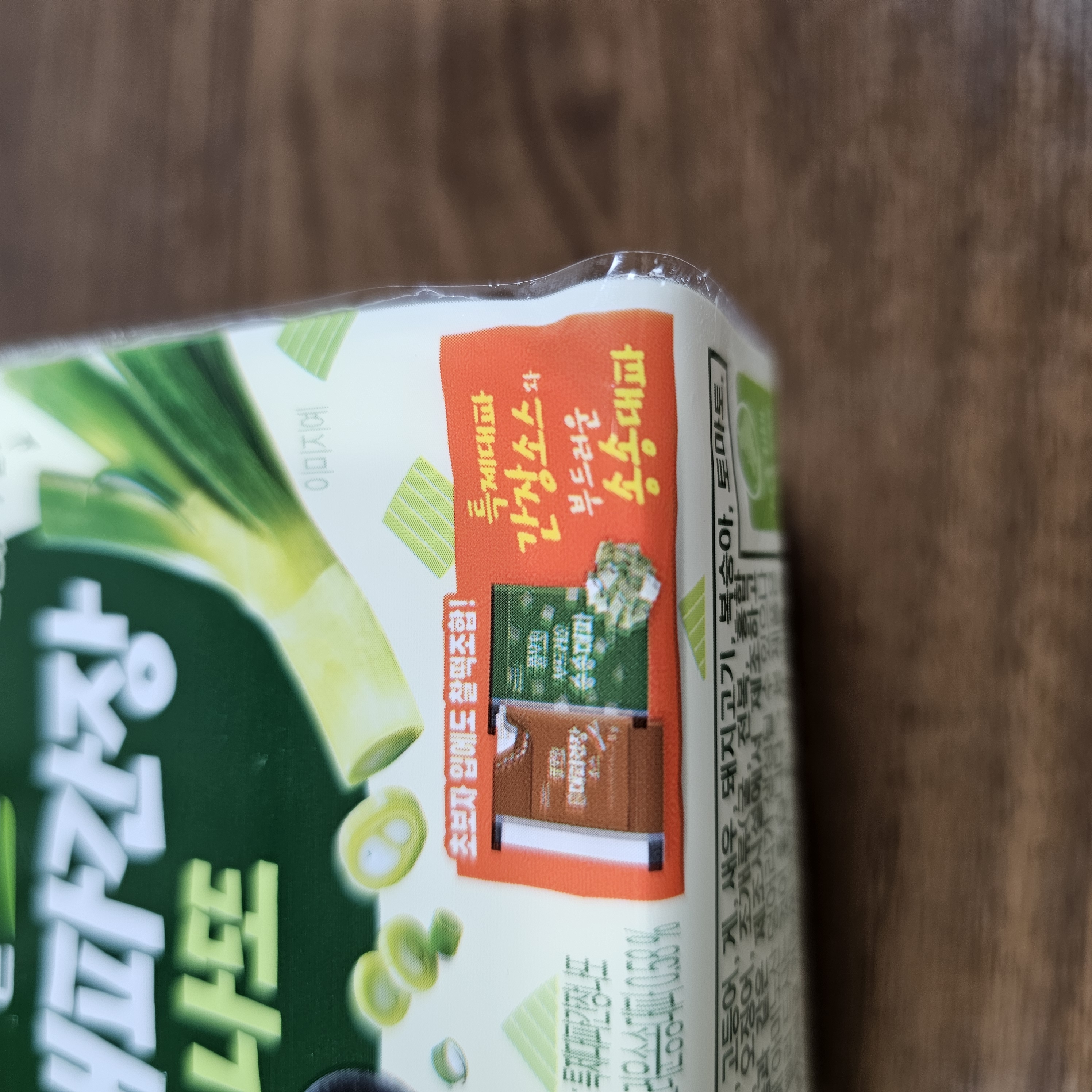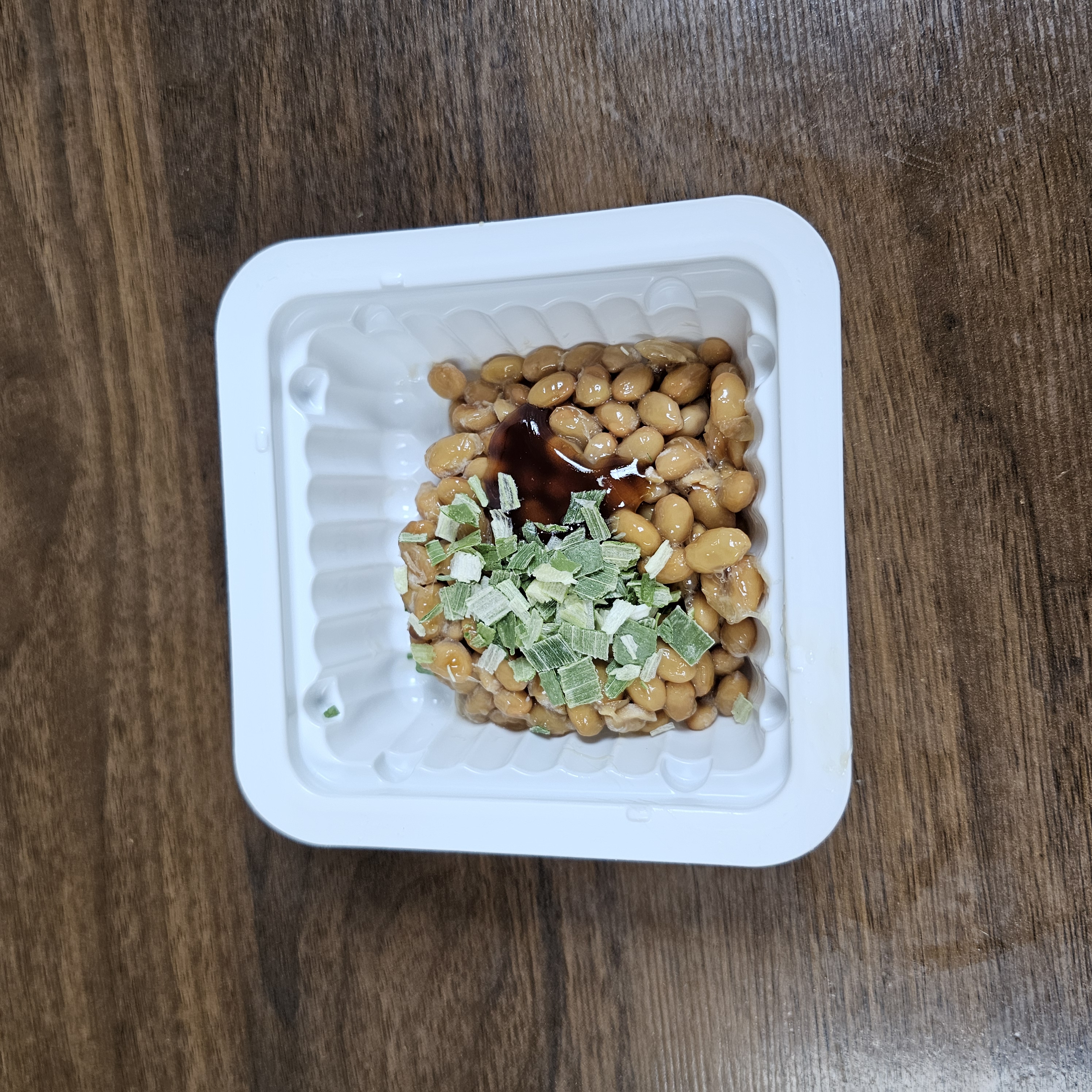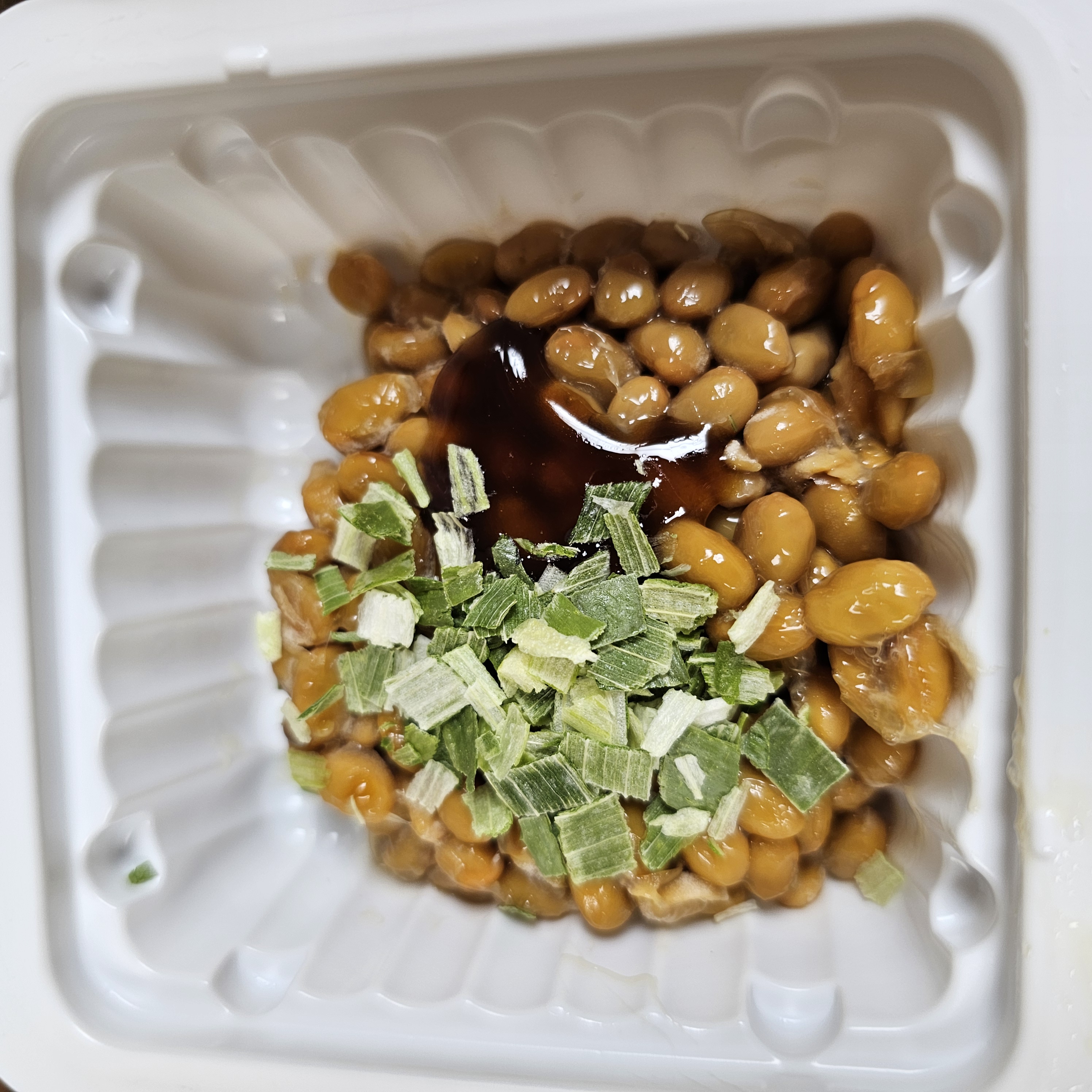 나또 위에 비닐이 한겹 씌워져 있고 대파, 간장이 담겨 있어요
