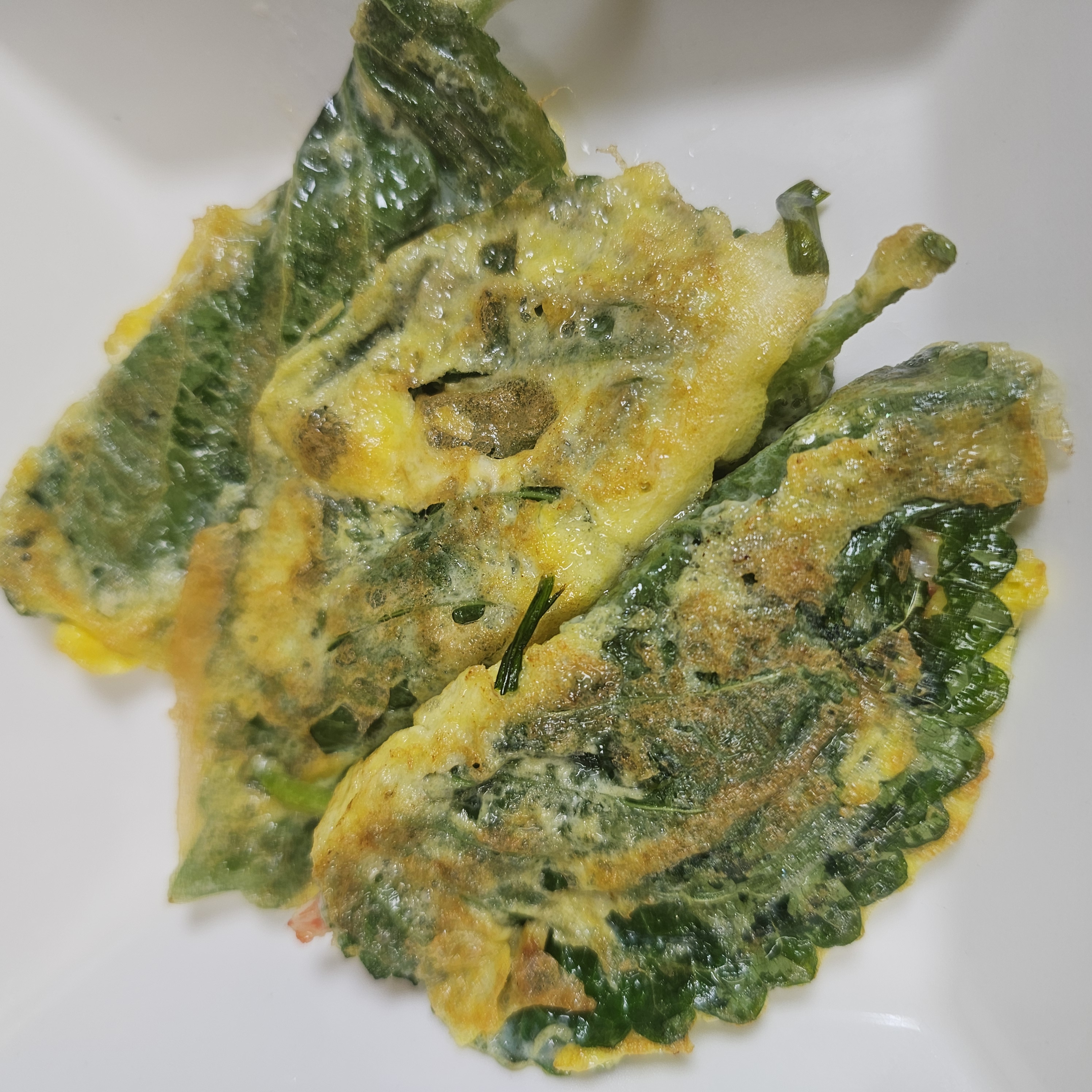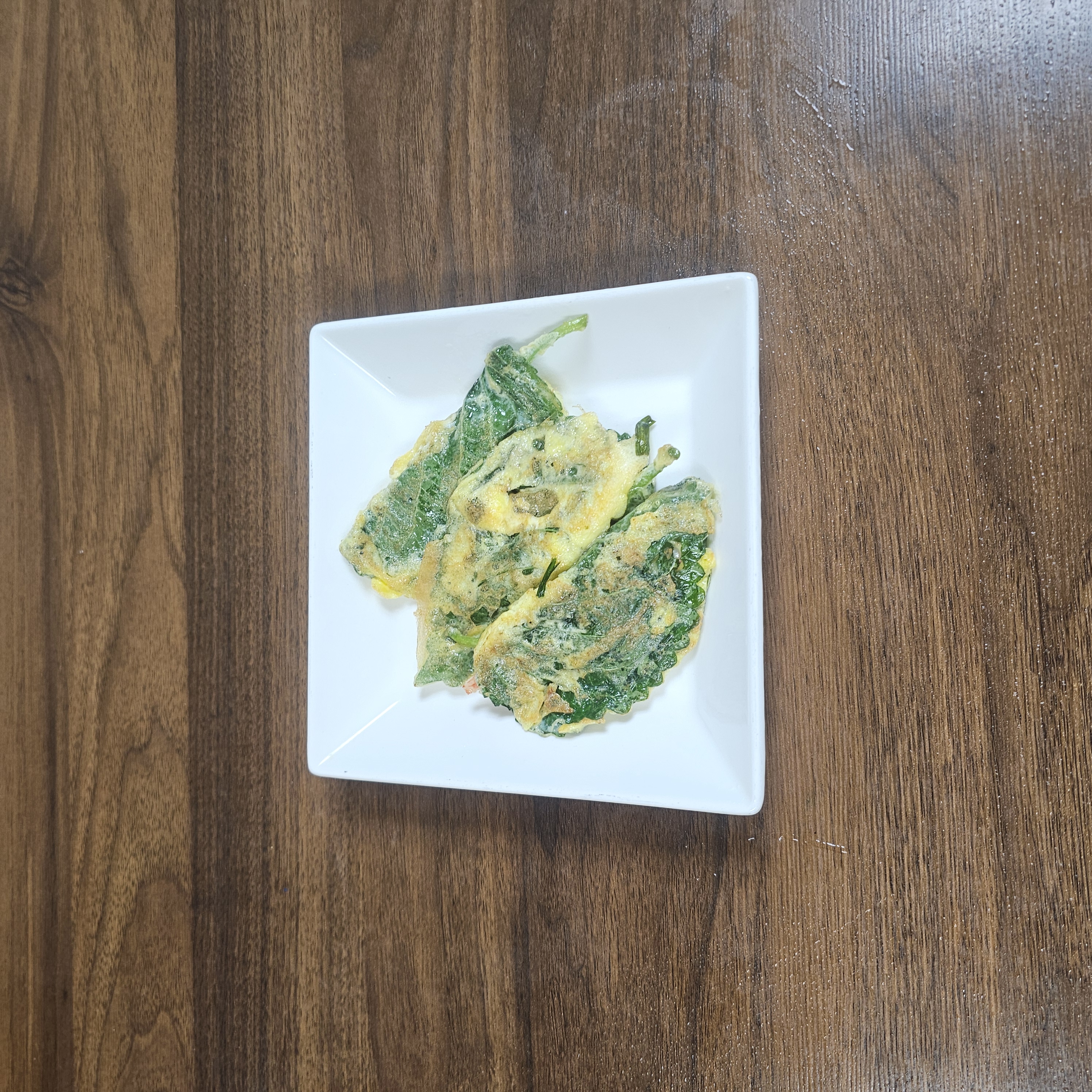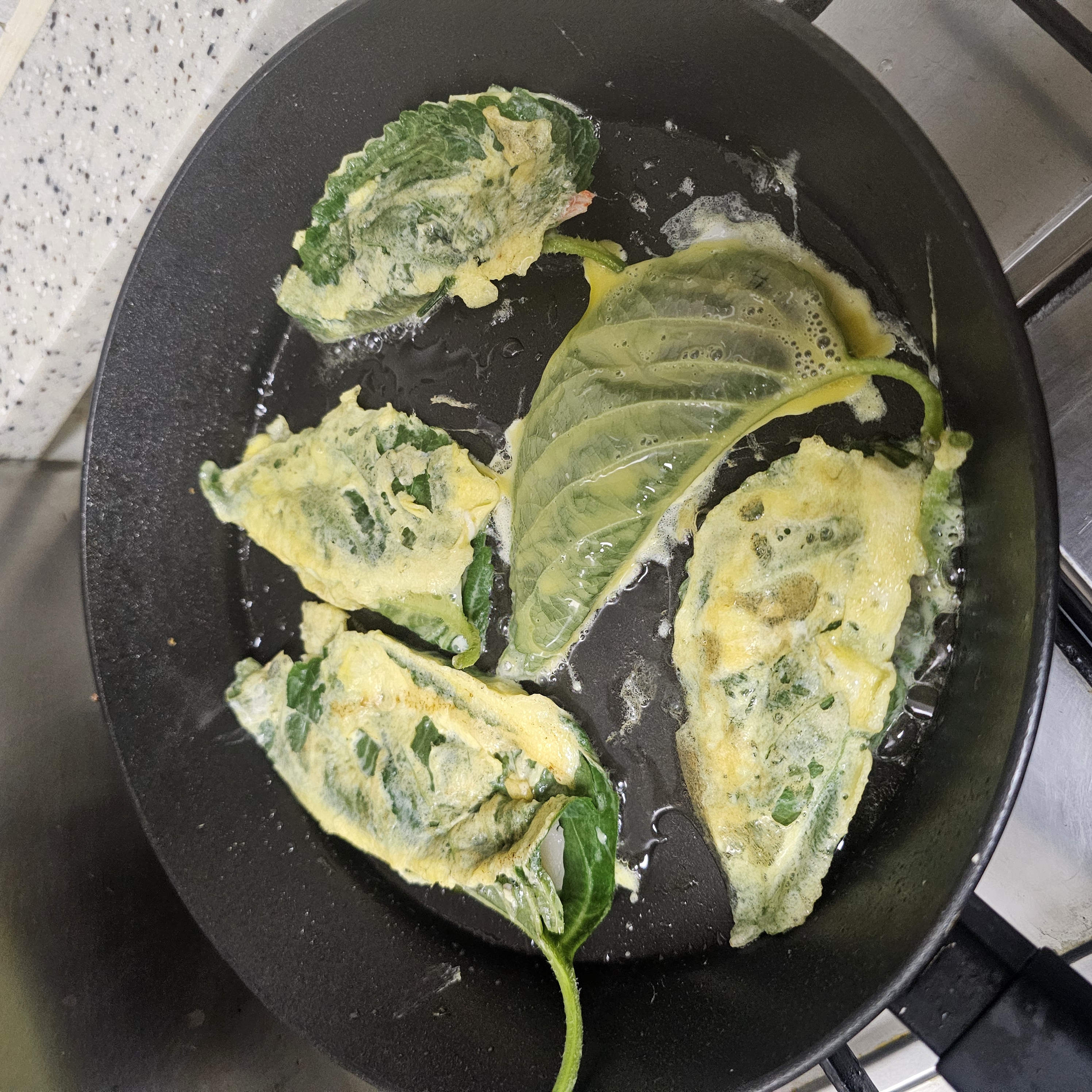 깻잎을 반으로 접은 후 계란물에 입혀 바로 구워줍니다.