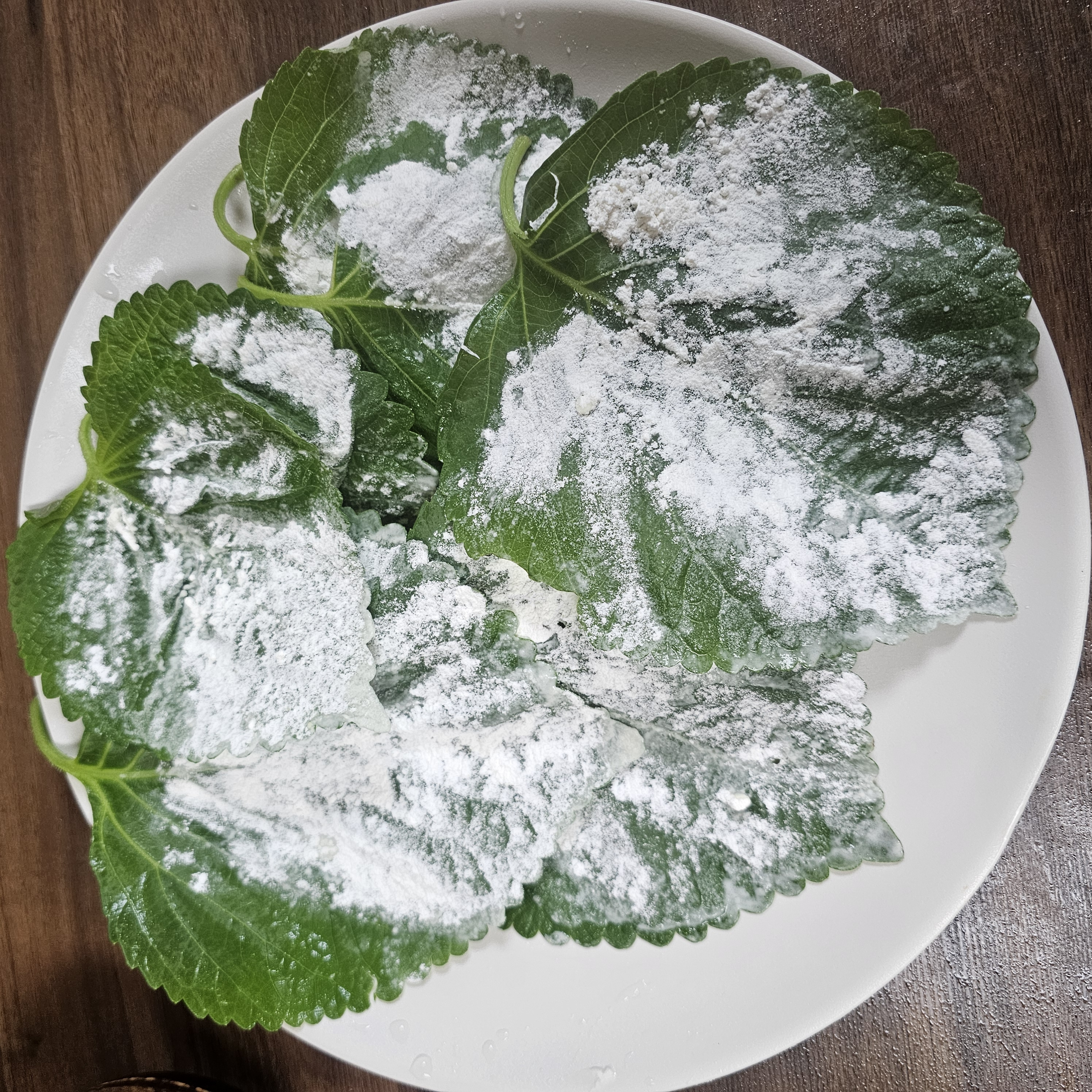 깻잎 물기를 제거한 후 밀가루를 뿌려줍니다.