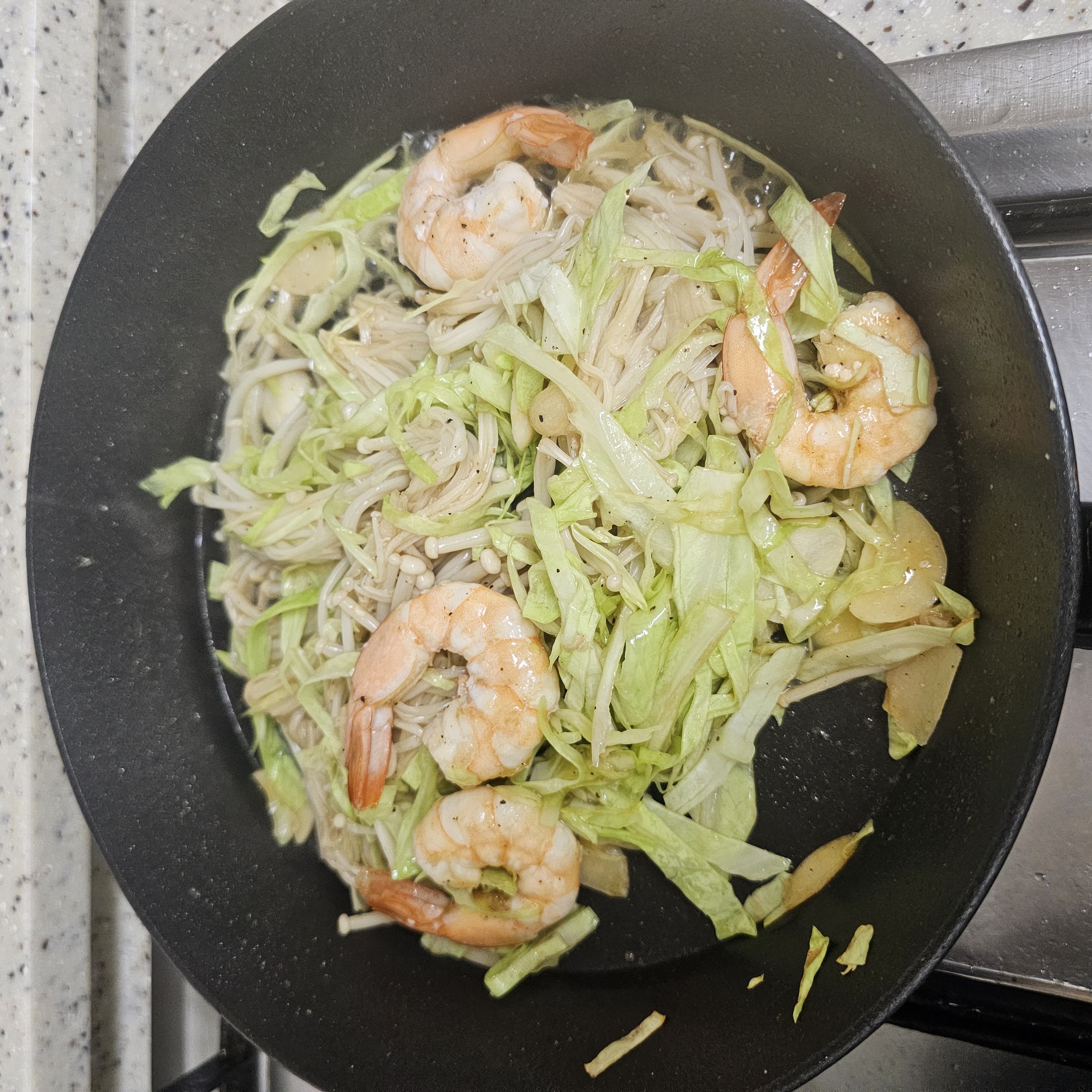 새우가 익으면 팽이버섯과 양배추를 넣어줍니다.