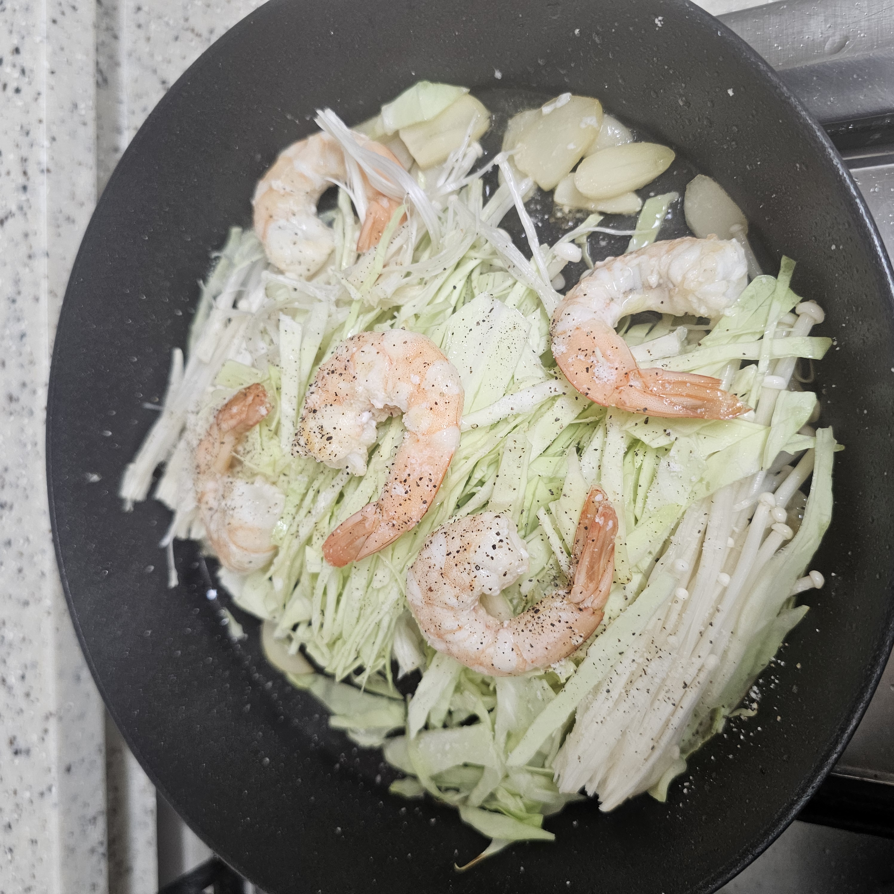 양배추, 새우, 팽이버섯, 슬라이스마늘, 올리브유, 맛술, 굴소스, 소금, 후추