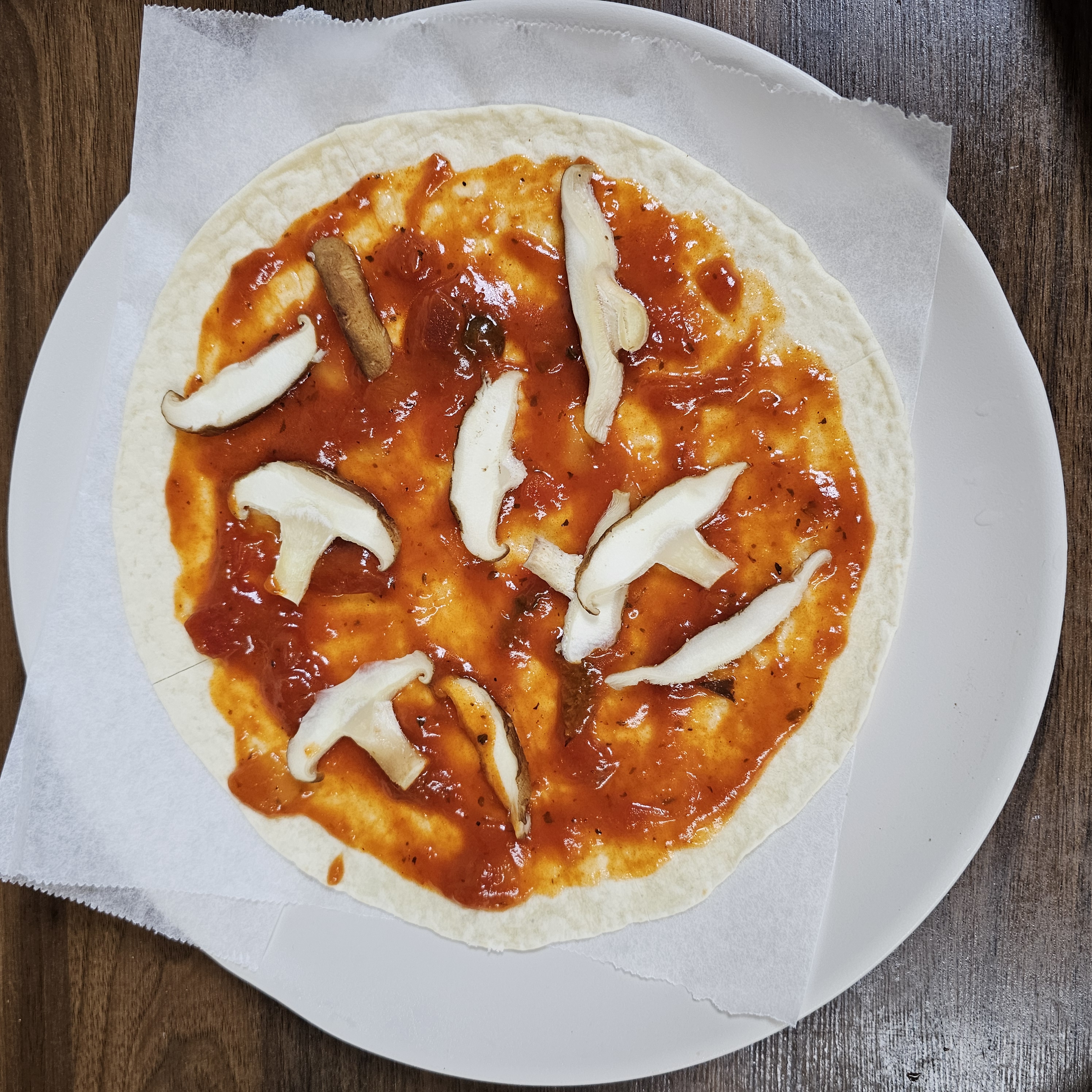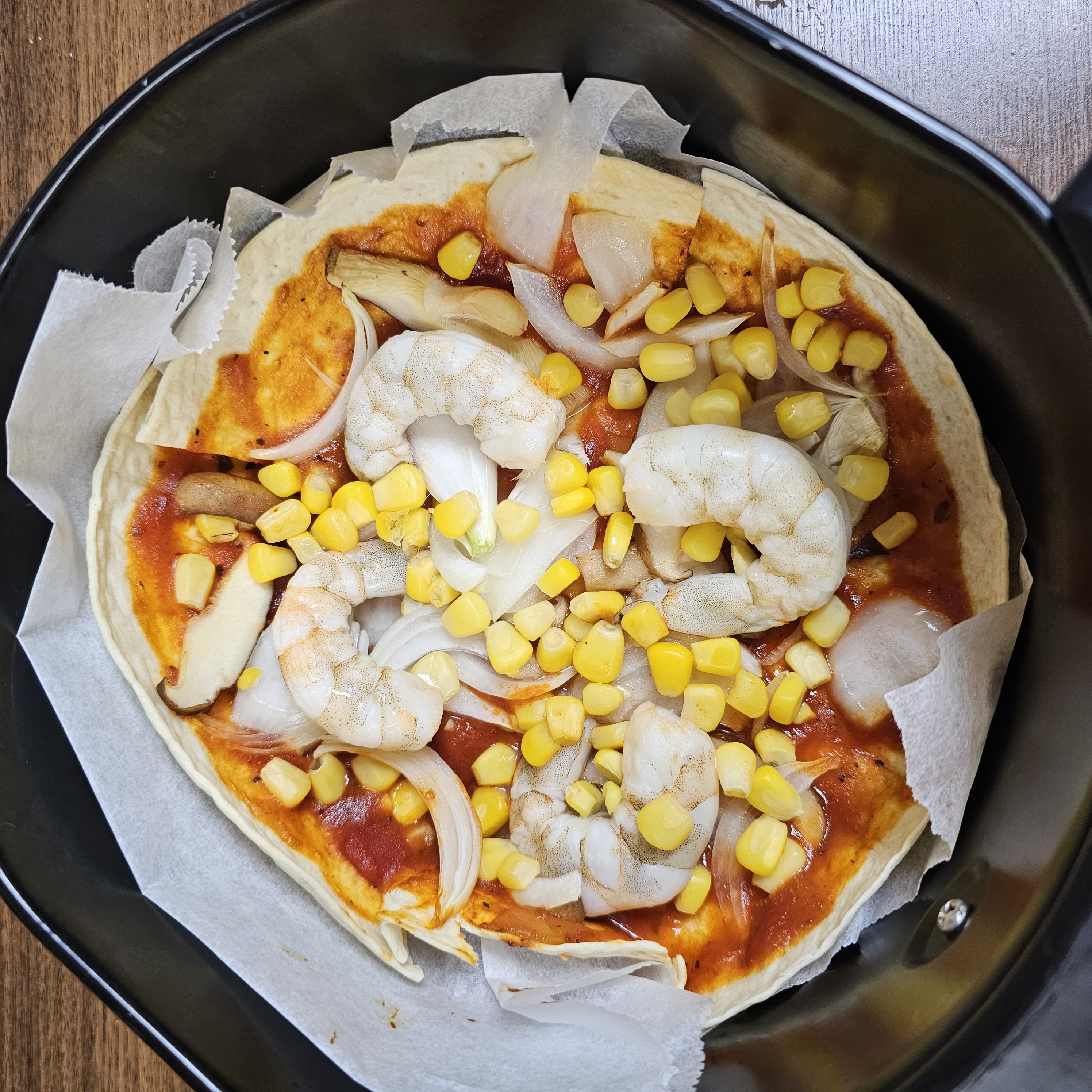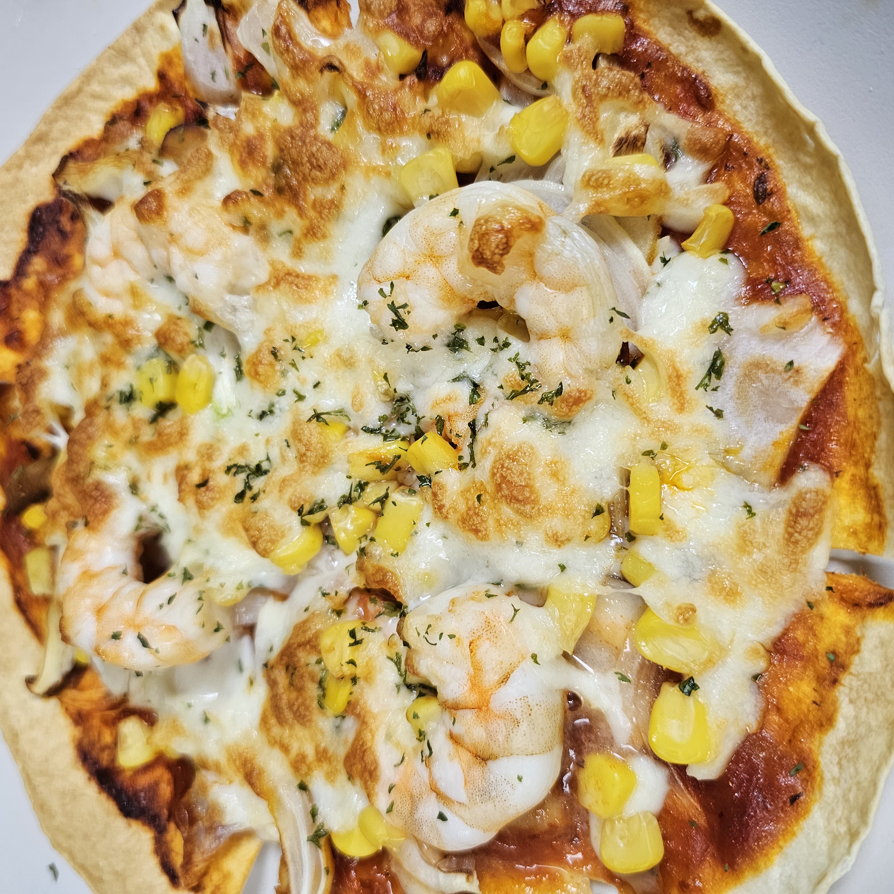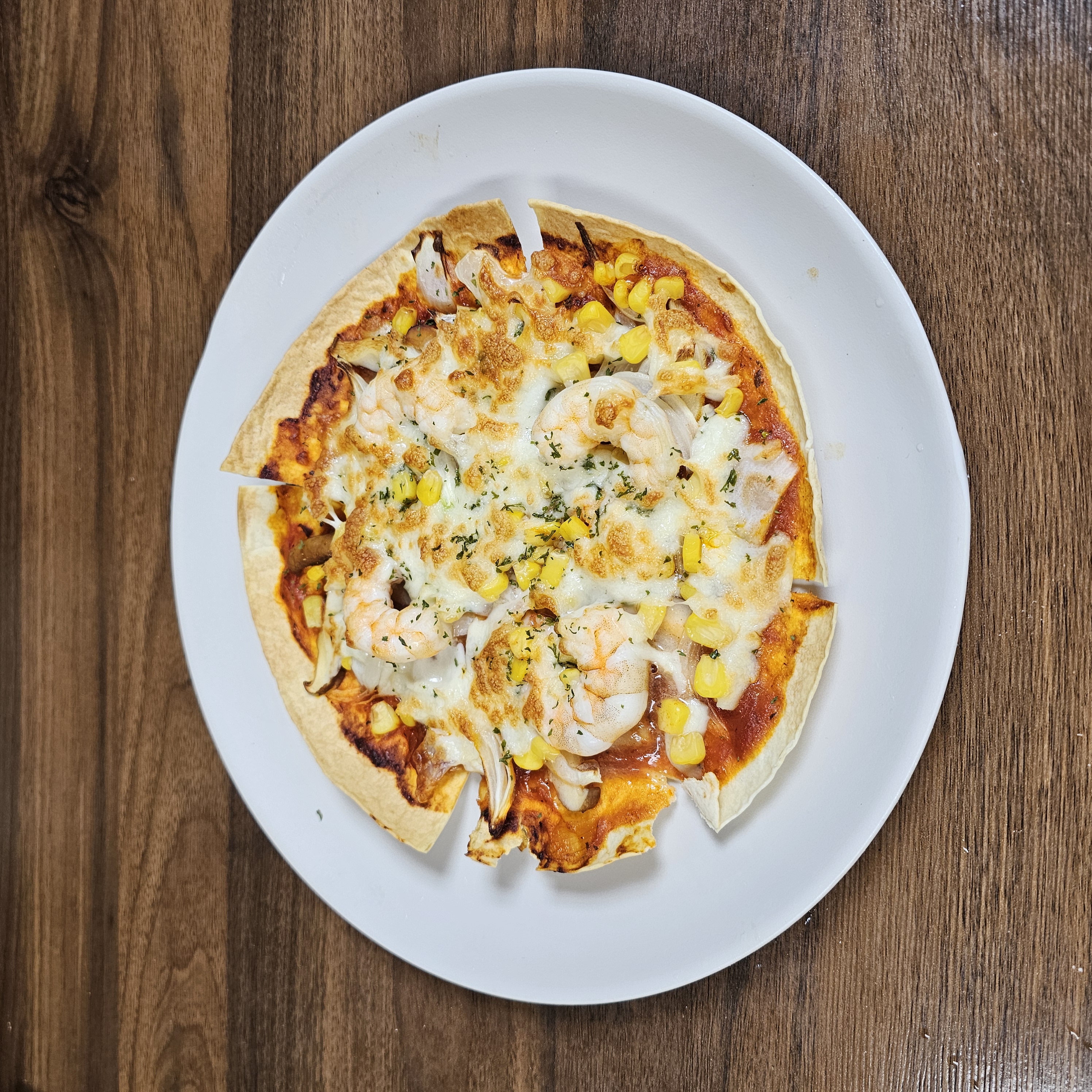 또띠아, 토마토 소스, 치즈, 버섯, 옥수수콘, 양파, 새우
