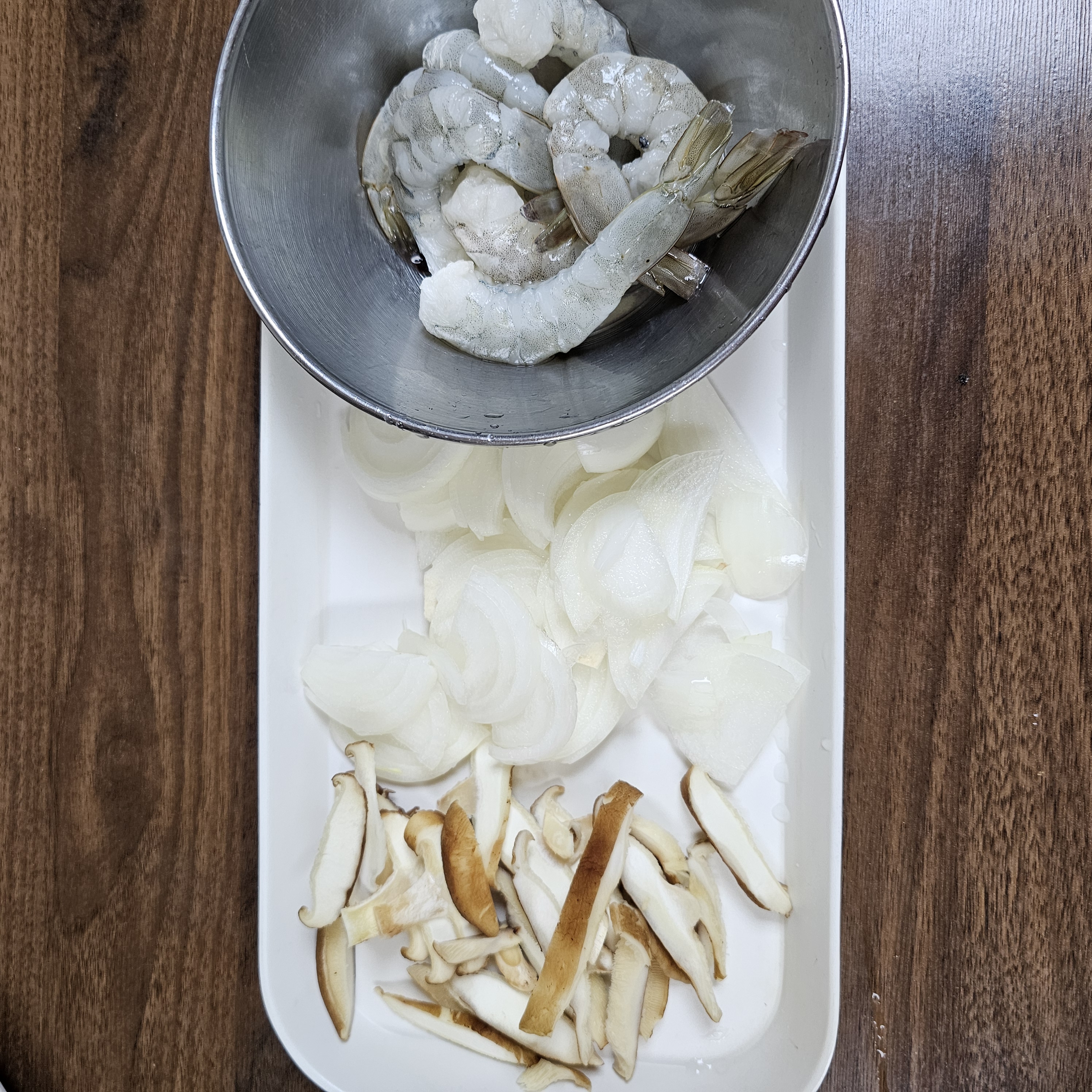 냉동새우는 물에 담가 놓습니다. (이때 맛술 1~2방울 넣고 담가놓으면 잡내 사라져요!)