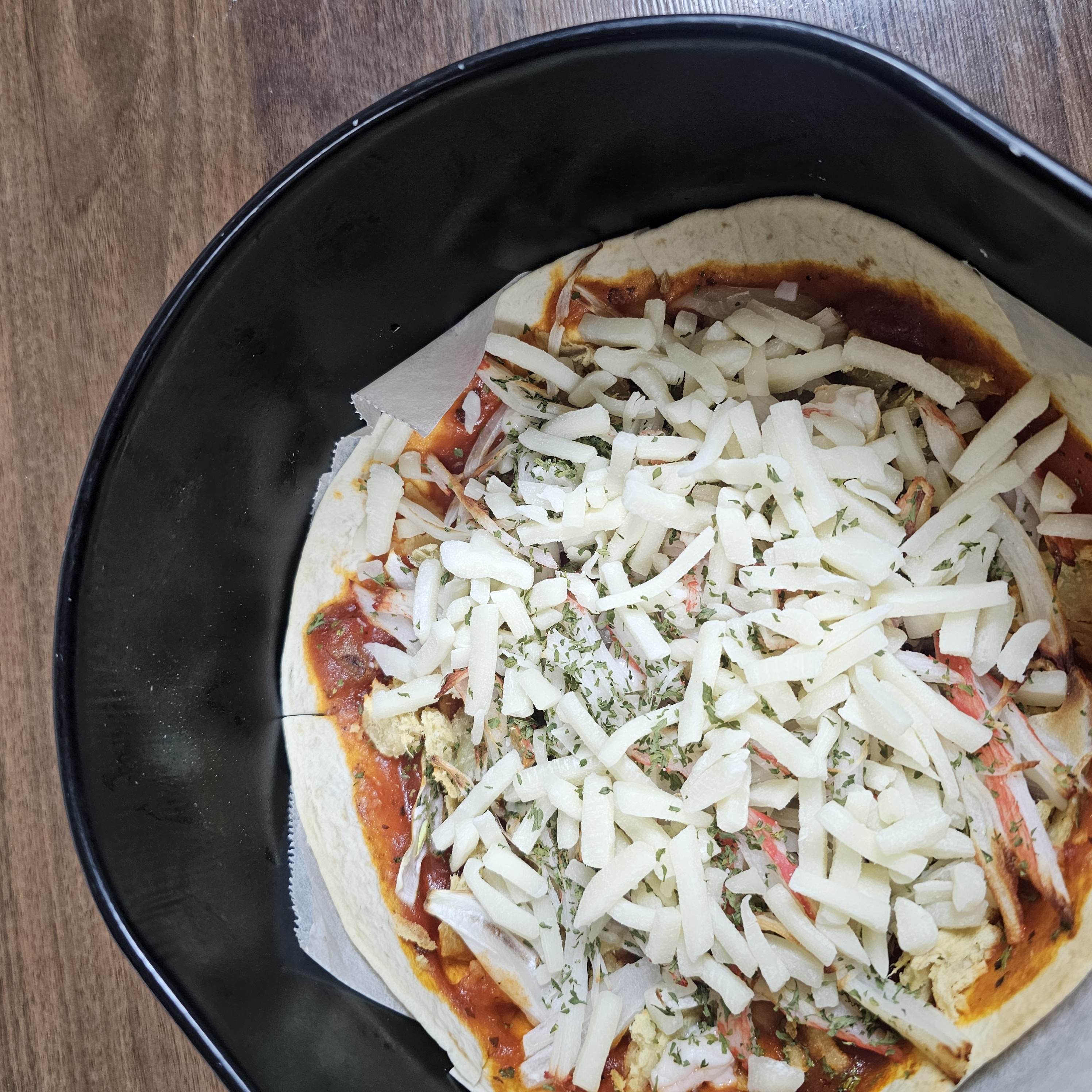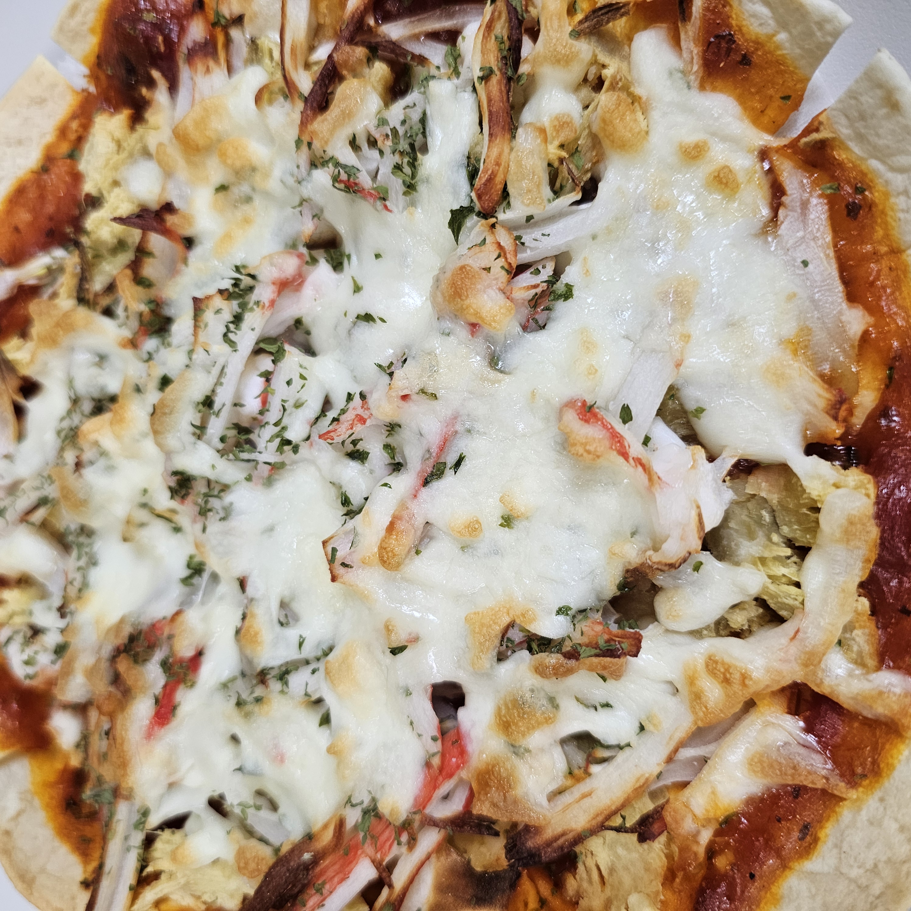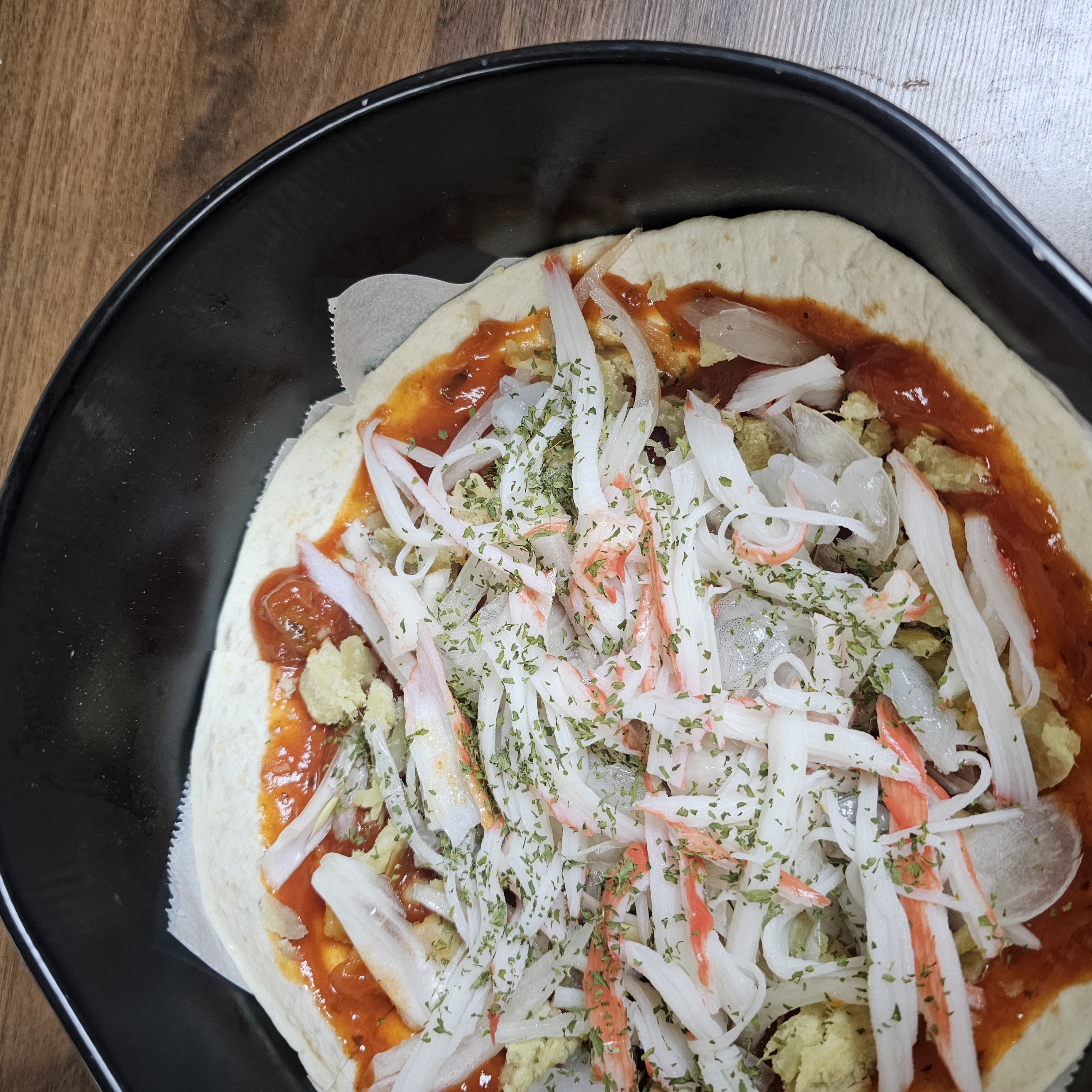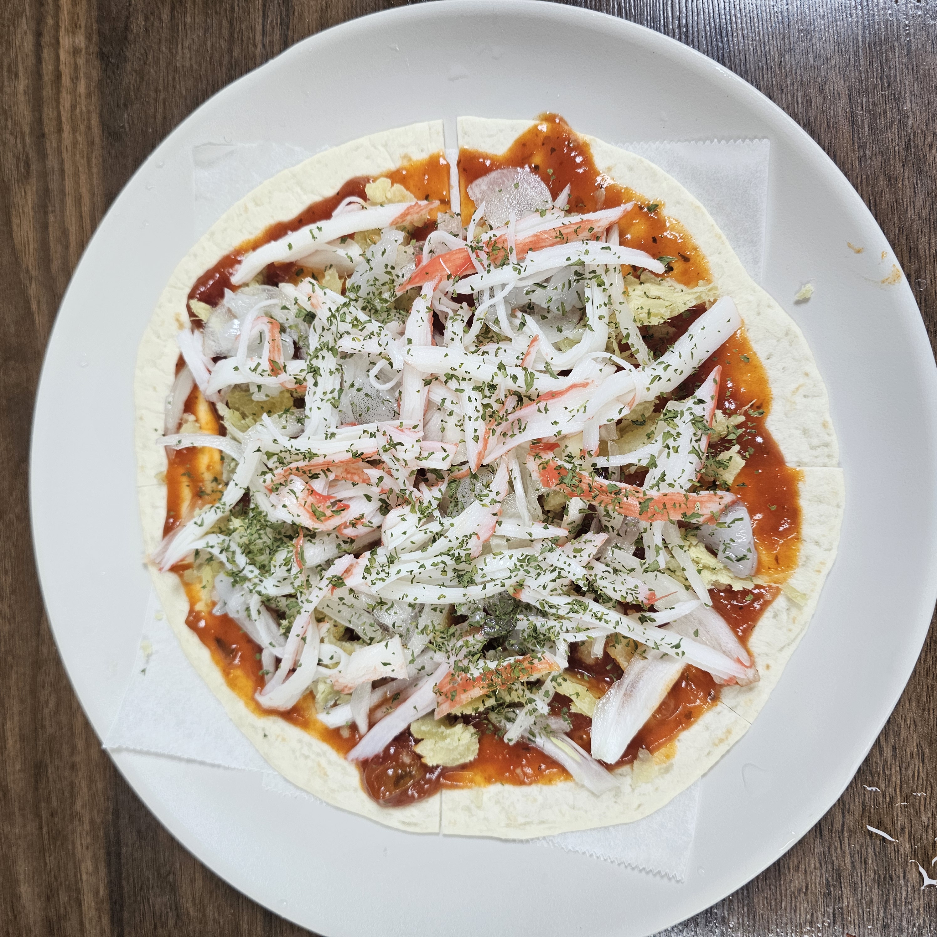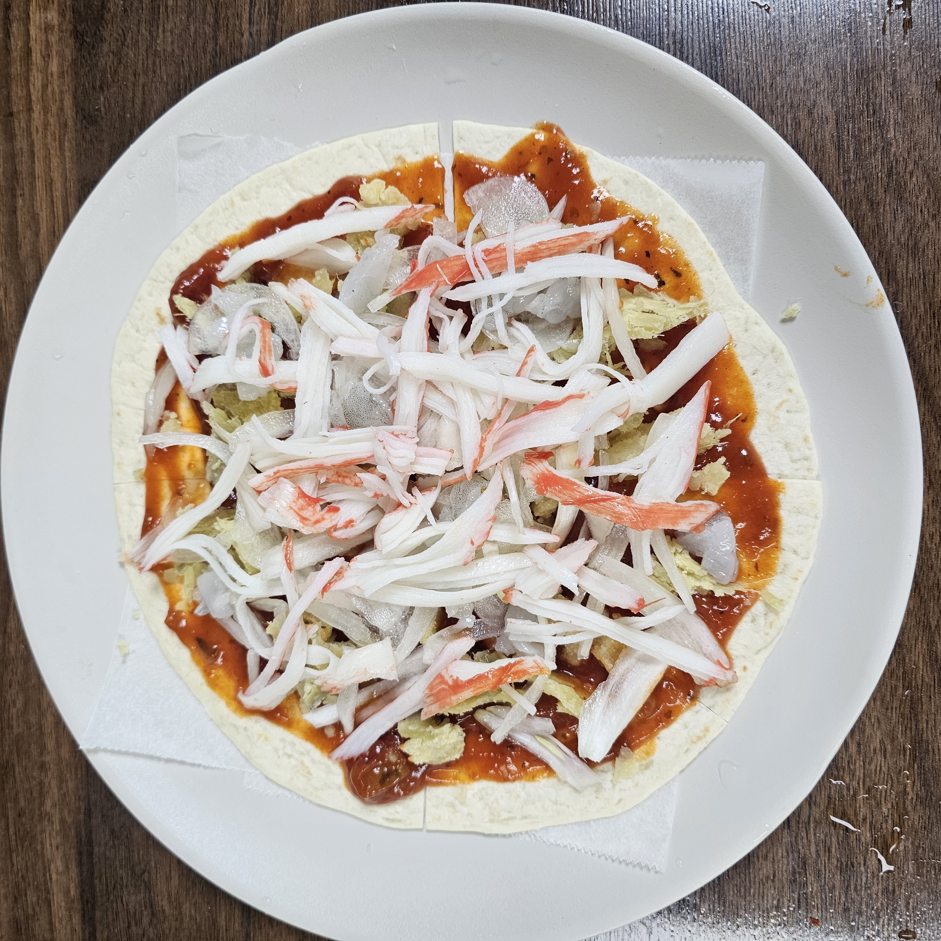 또띠아, 크래미, 치즈, 고구마, 토마토소스, 양파, 새우