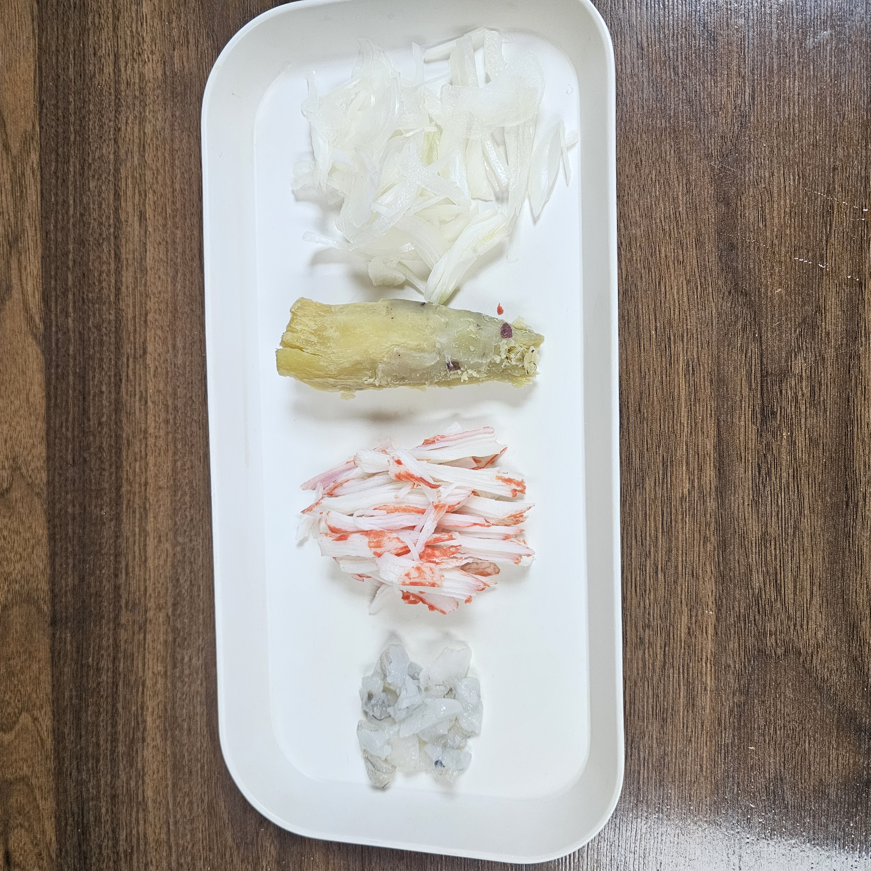 새우살은 다져주고 크래미는 잘게 찢어줍니다.