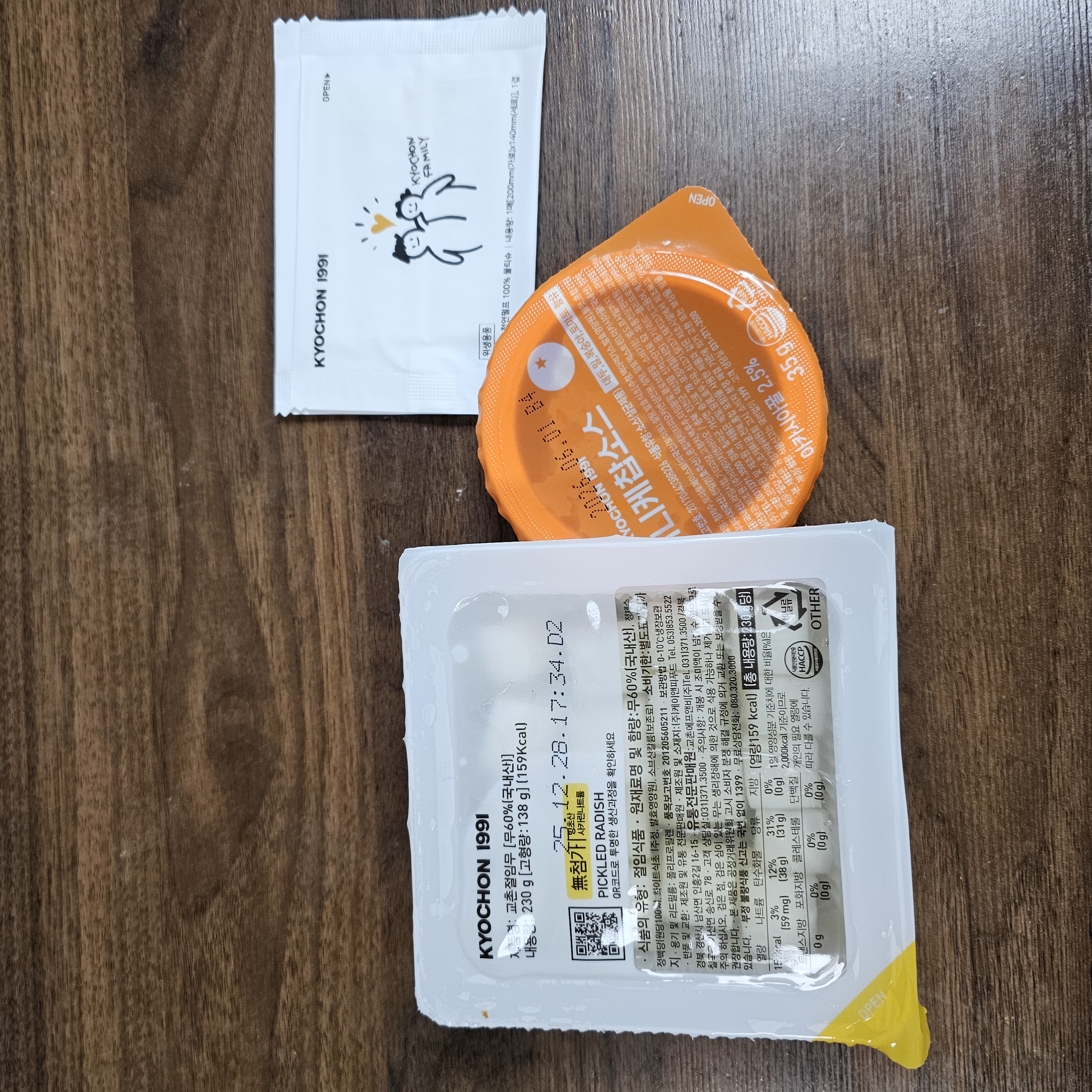 치킨무, 허니케찹소스, 티슈 2개가 들어있어요