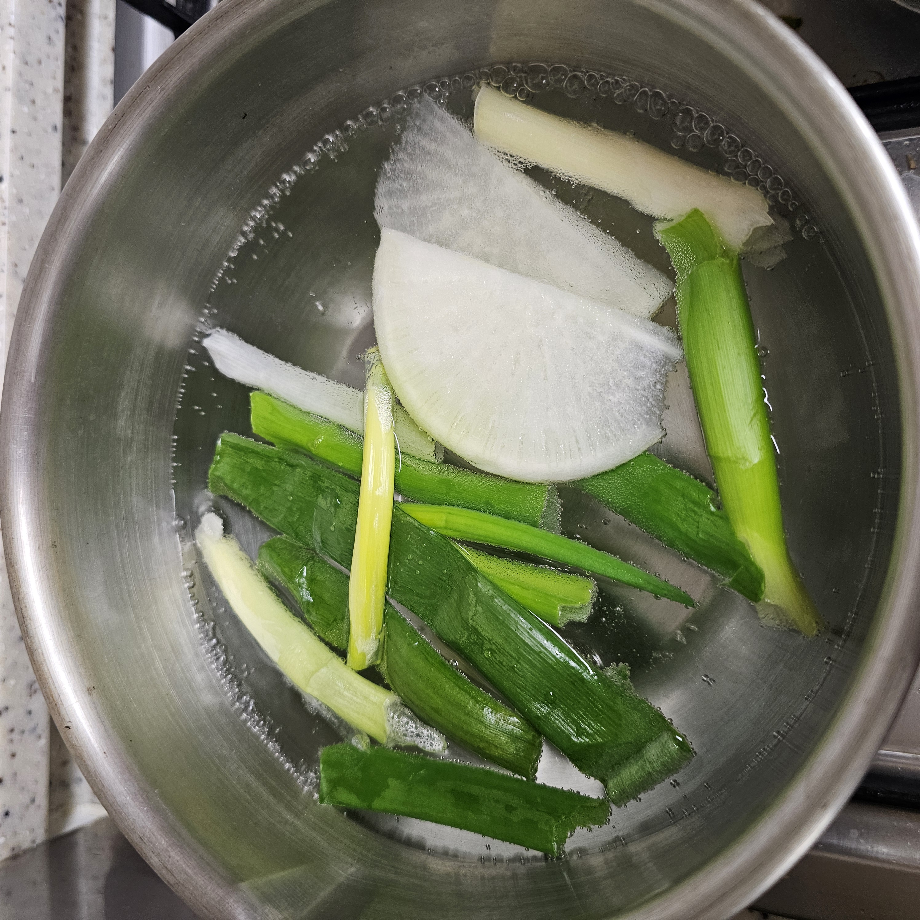 일단 물에 파와 무를 넣어 국물을 시원하게 만들어 줬어요