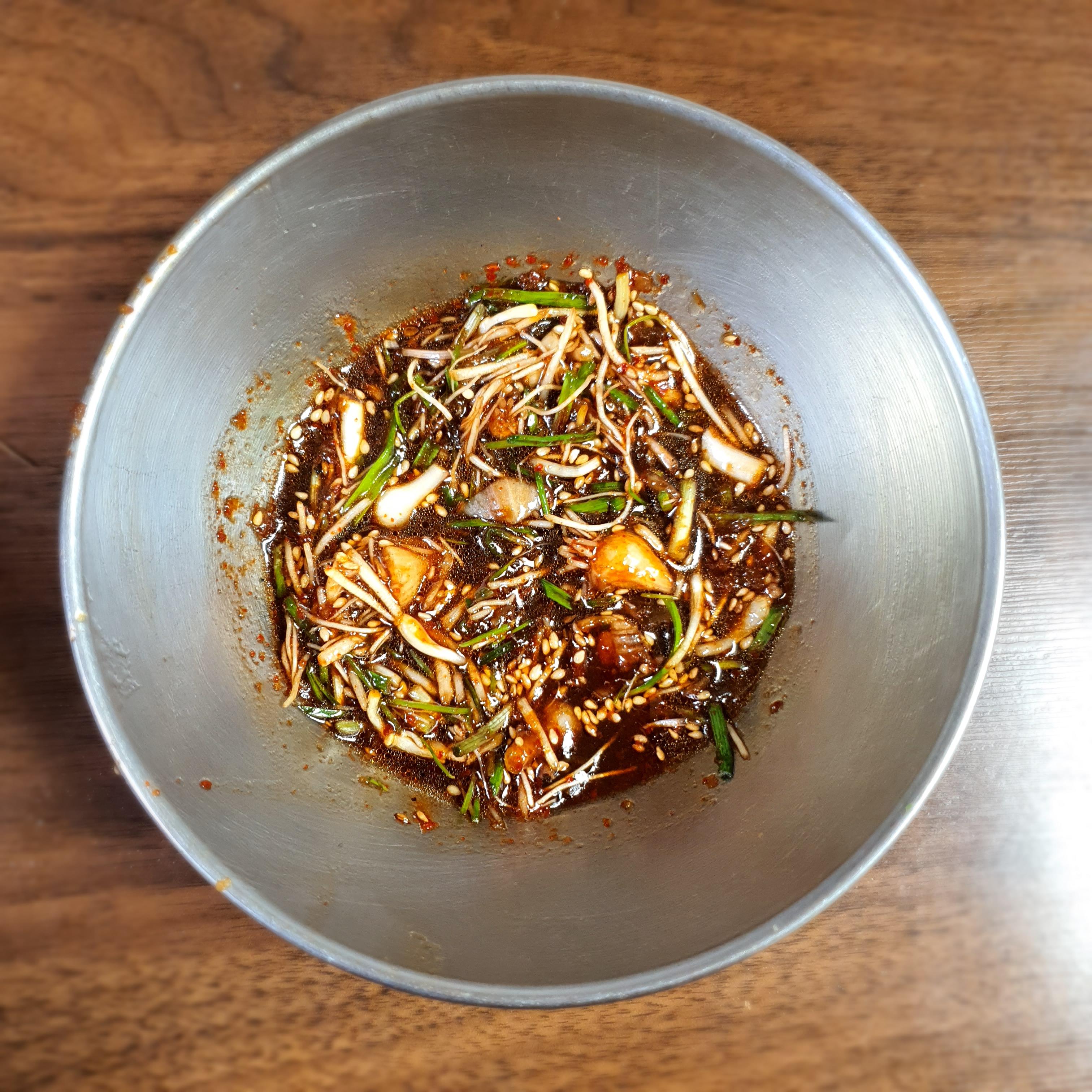 고춧가루 1, 다진 마늘1, 식초 0.5, 들기름 0.5, 간장2, 깨