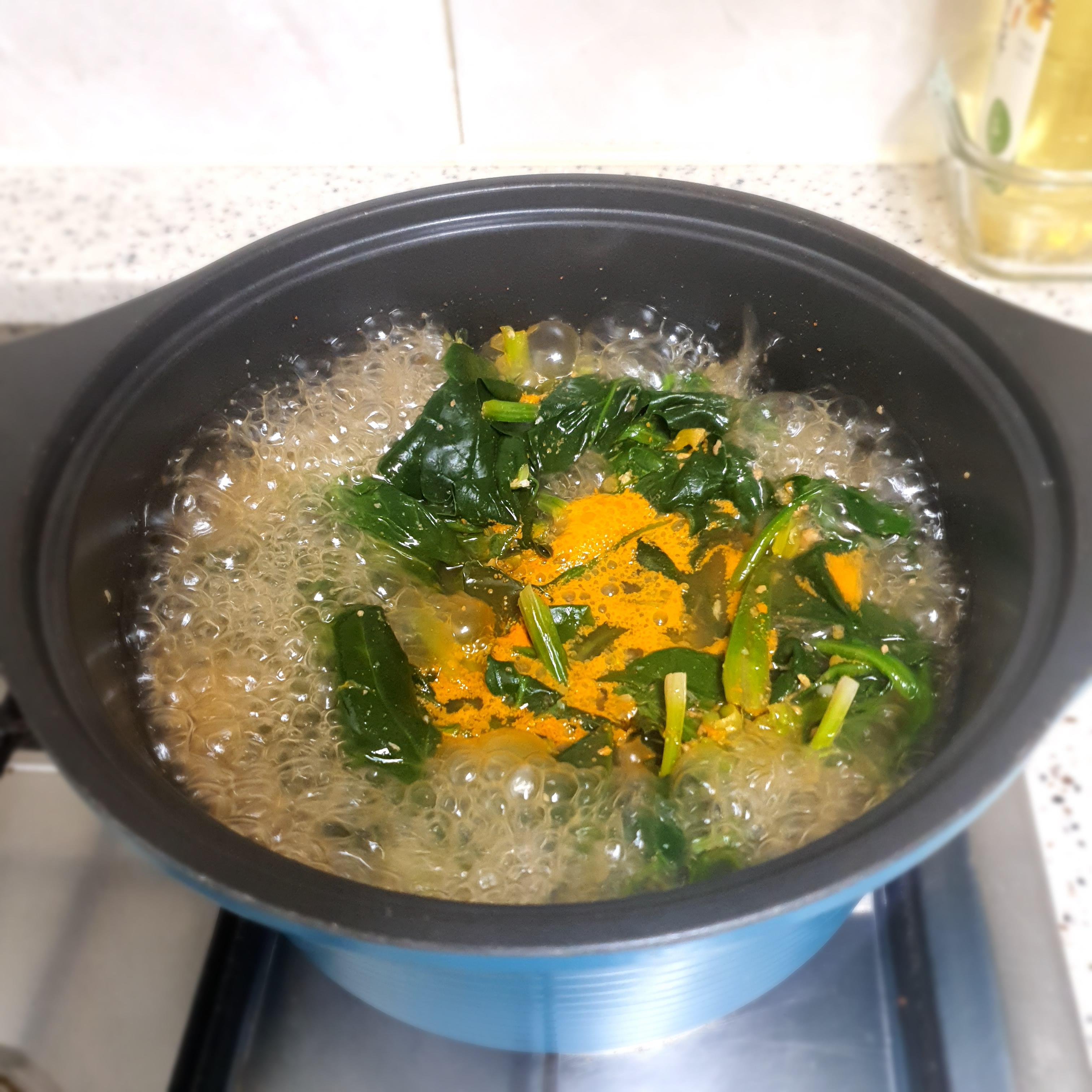 국이 끓으면 세척한 시금치를 넣어줍니다.