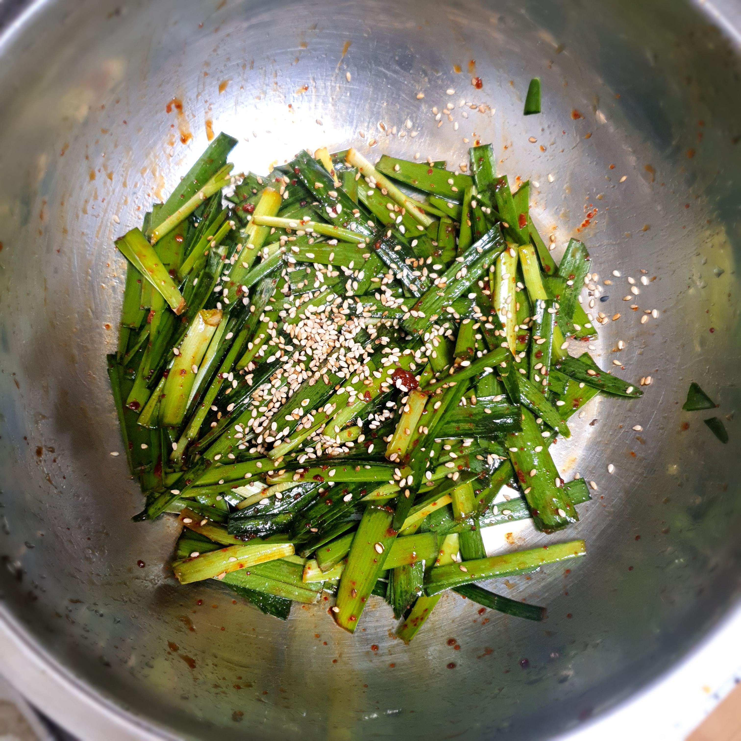 부추, 간장, 식초, 고춧 가루, 참기름, 들기름, 깨