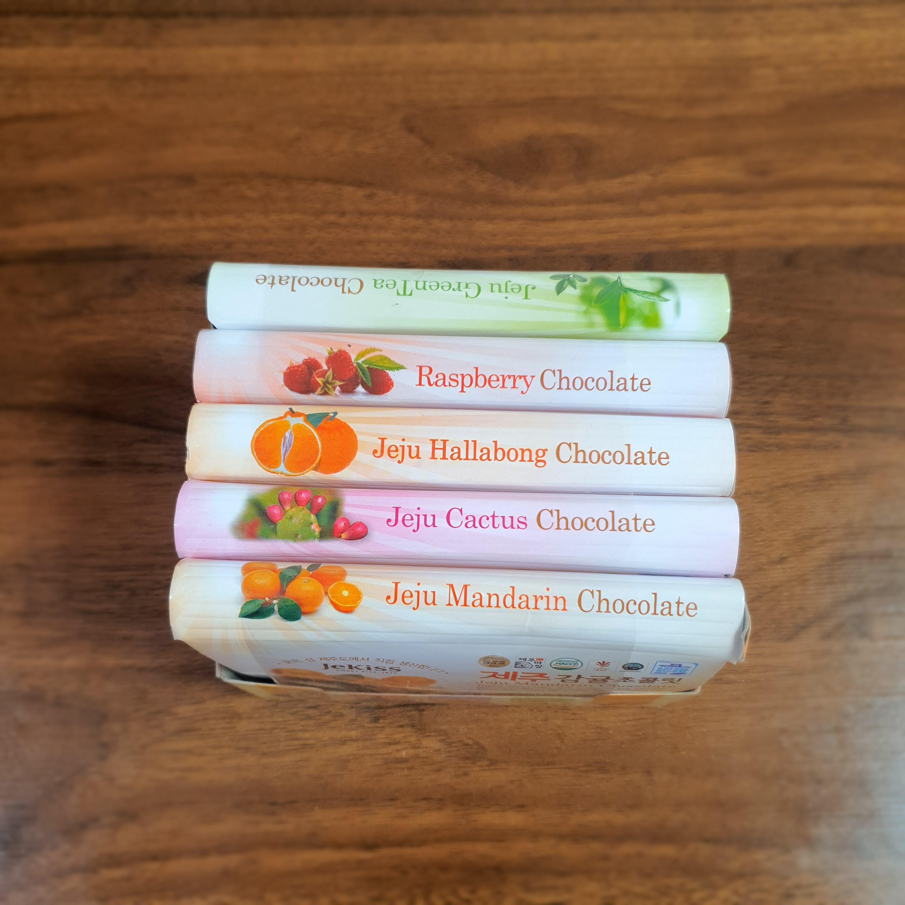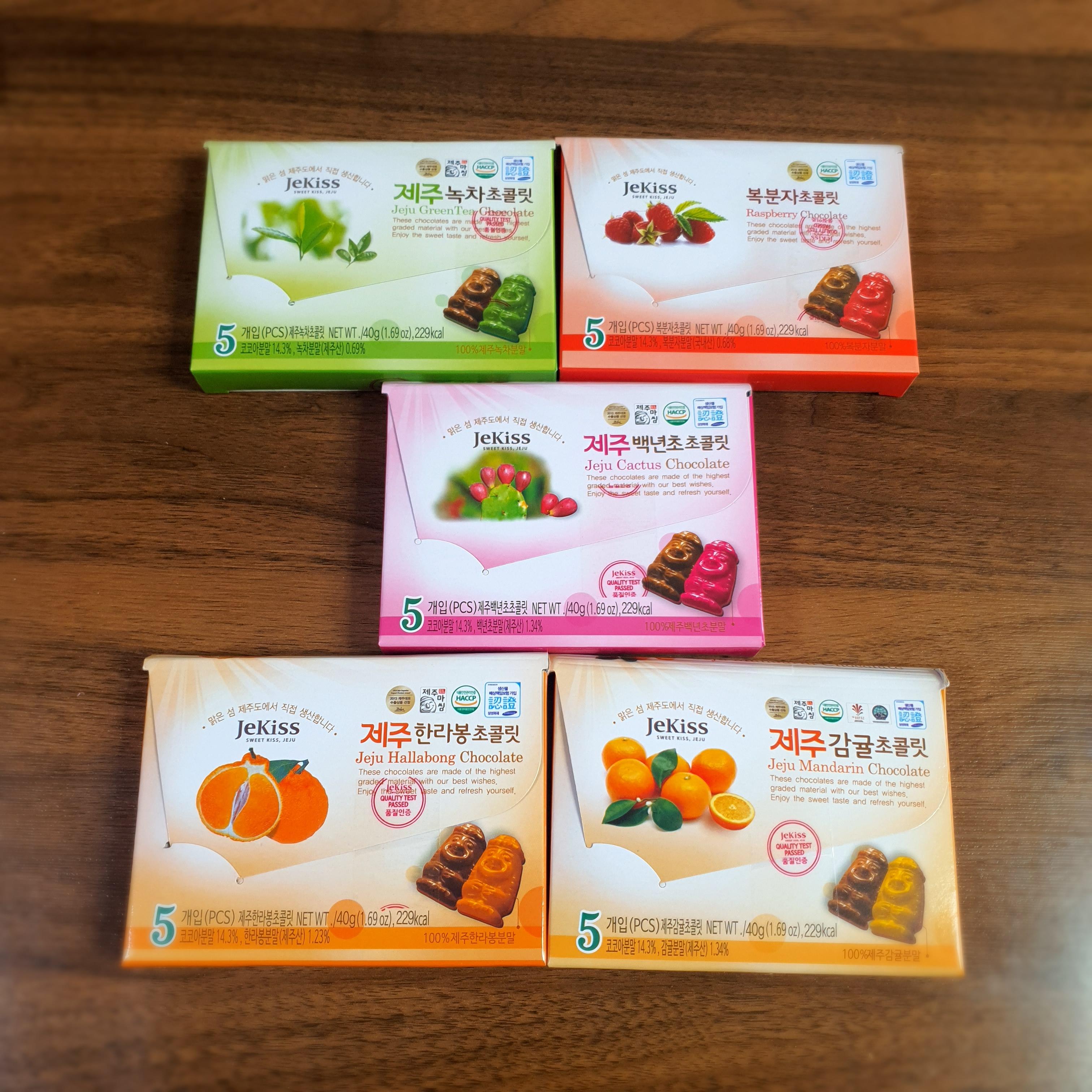 제주 종합 초콜릿 종류는 녹차, 복분자, 백년초, 한라봉, 감귤 이렇게 총 5가지 입니다.