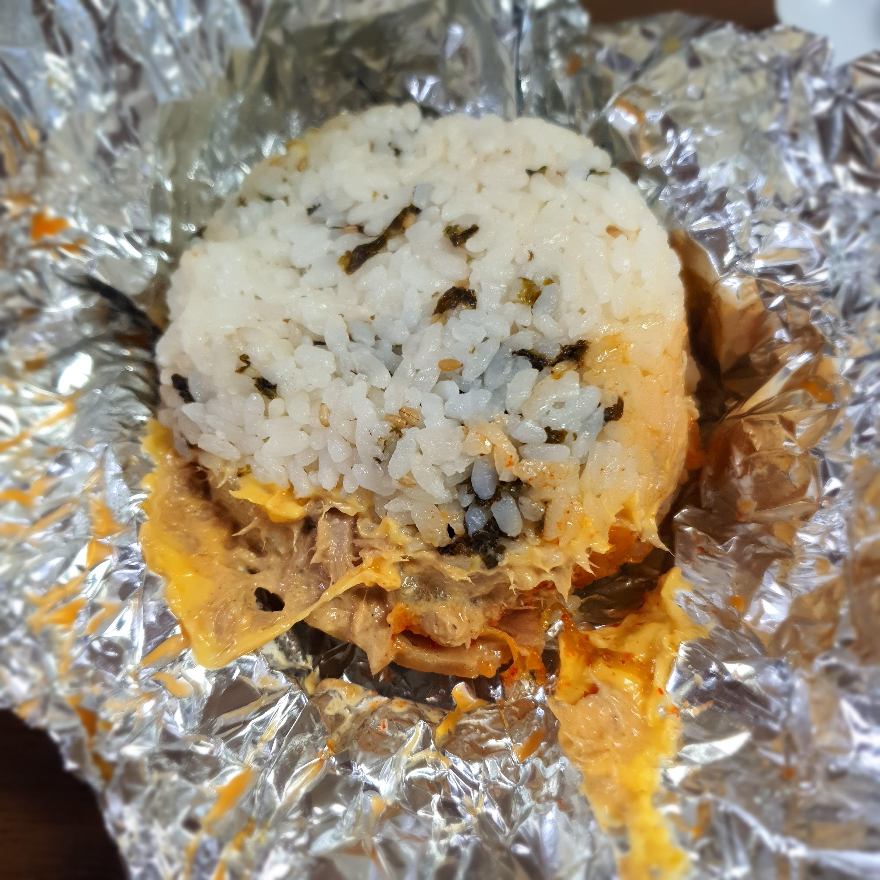 햄+치즈+단무지+참치+볶음김치+마요네즈가 들어있는 햄 치즈 밥버거입니다.