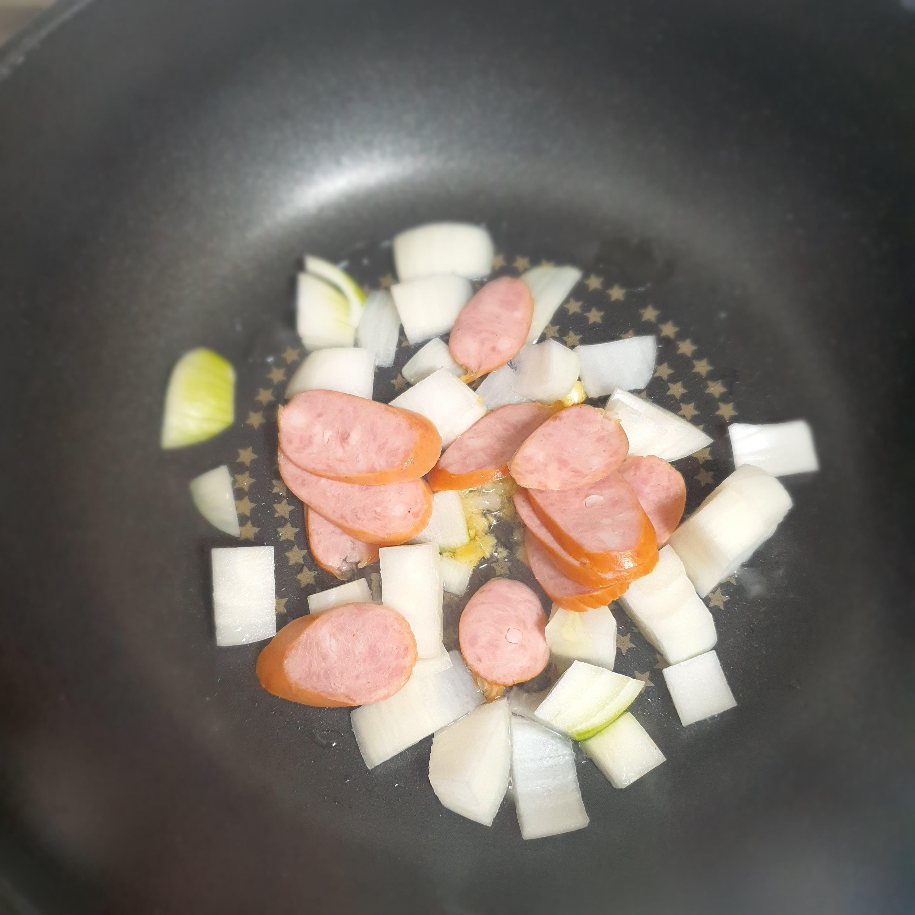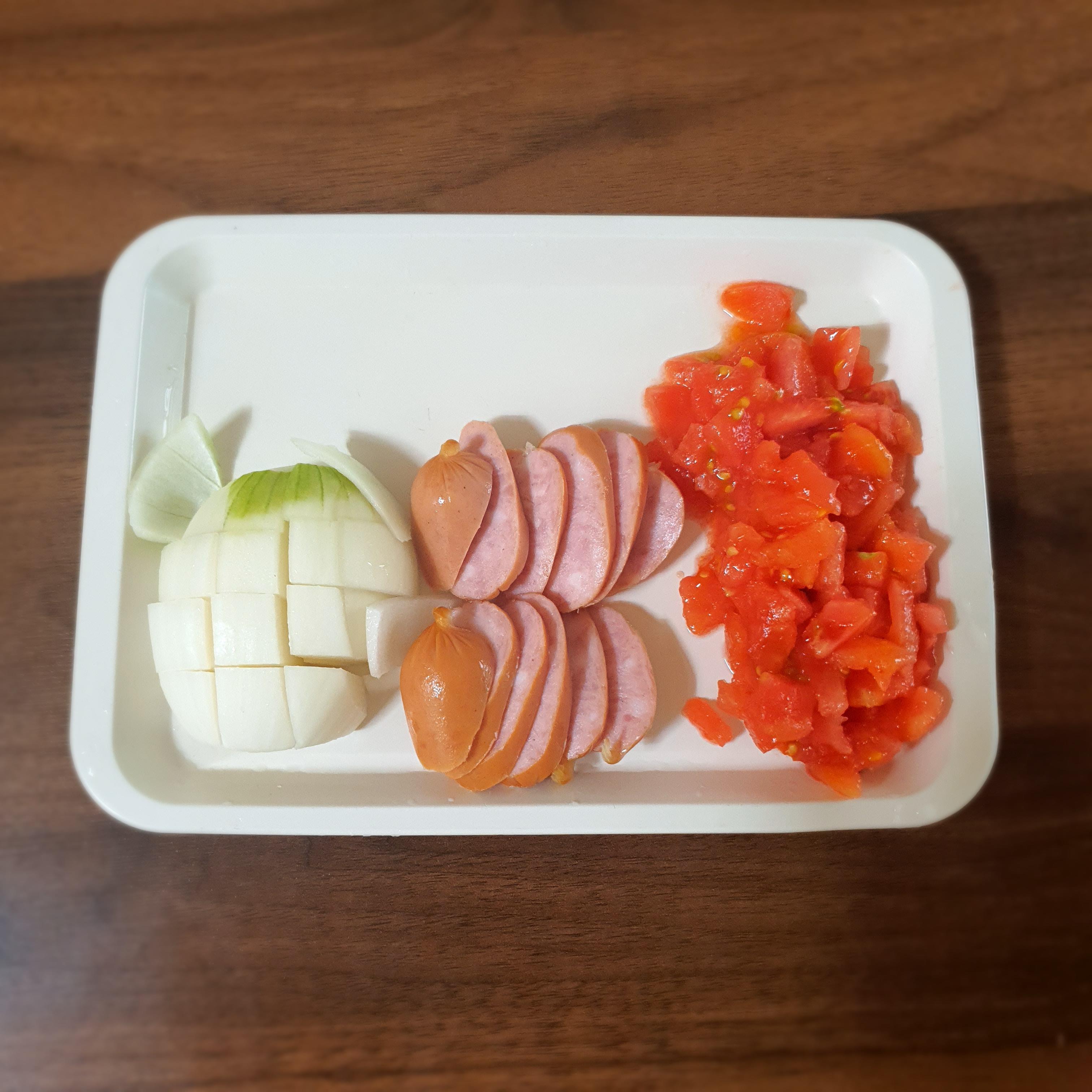 양파는 직사각형으로 썰어줬고 햄은 비엔나로 준비했습니다.