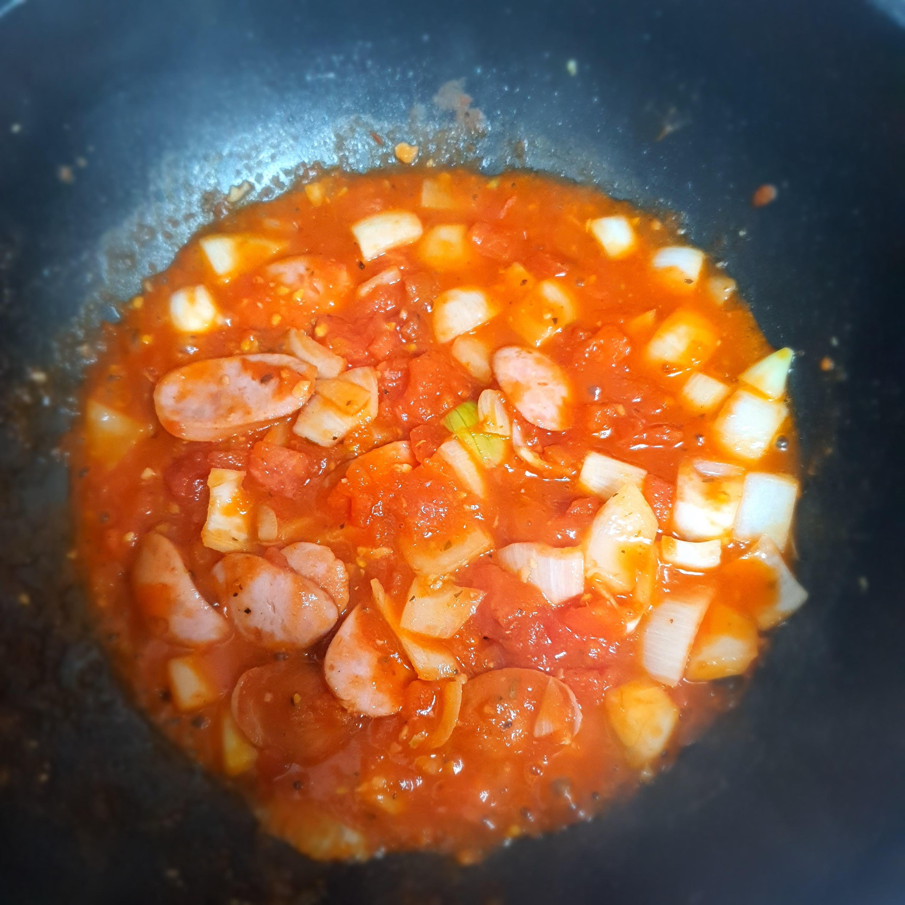 약 2~3뷰 볶아주고 손질해놓은 생토마토 넣고 토마토소스를 조금 넣어줬습니다.