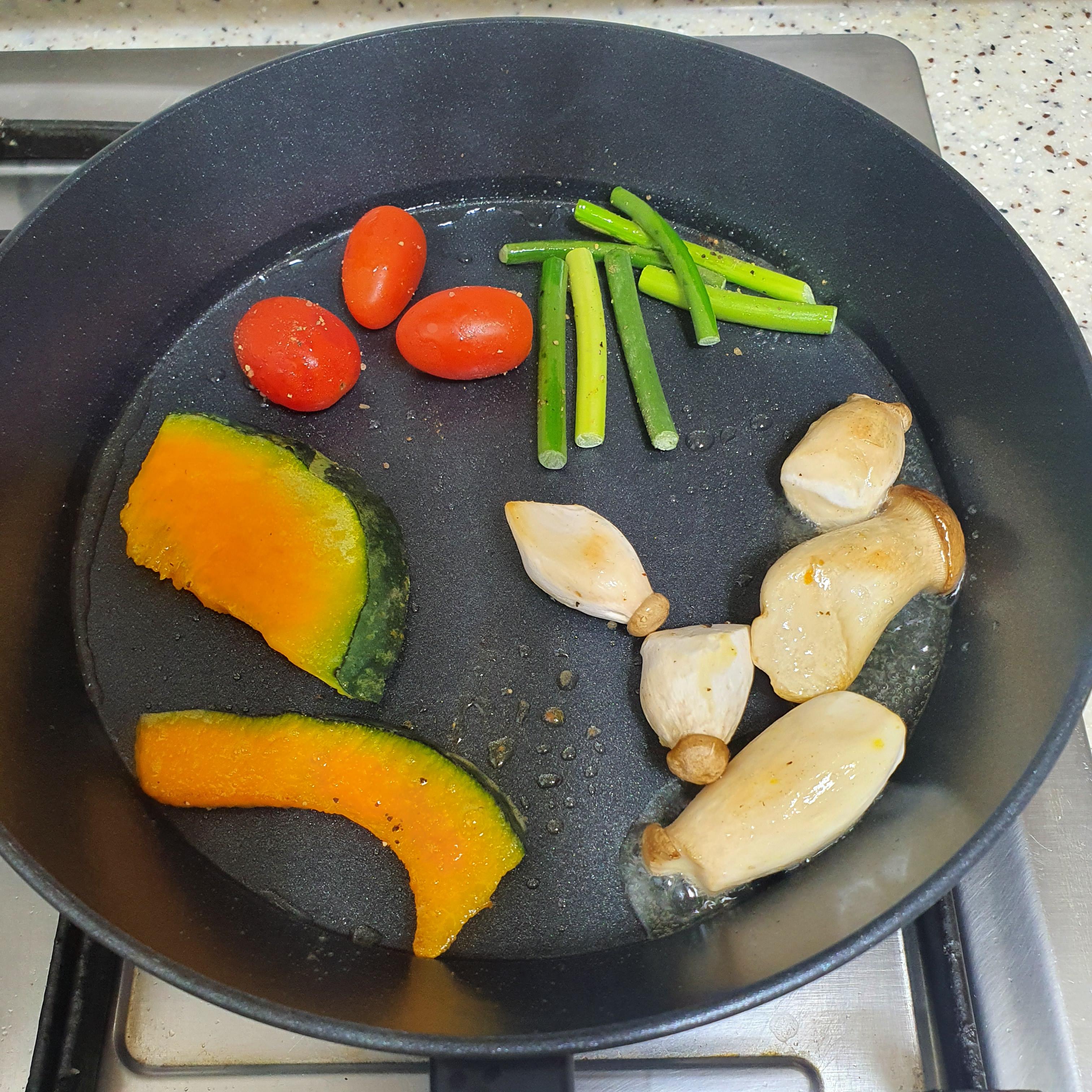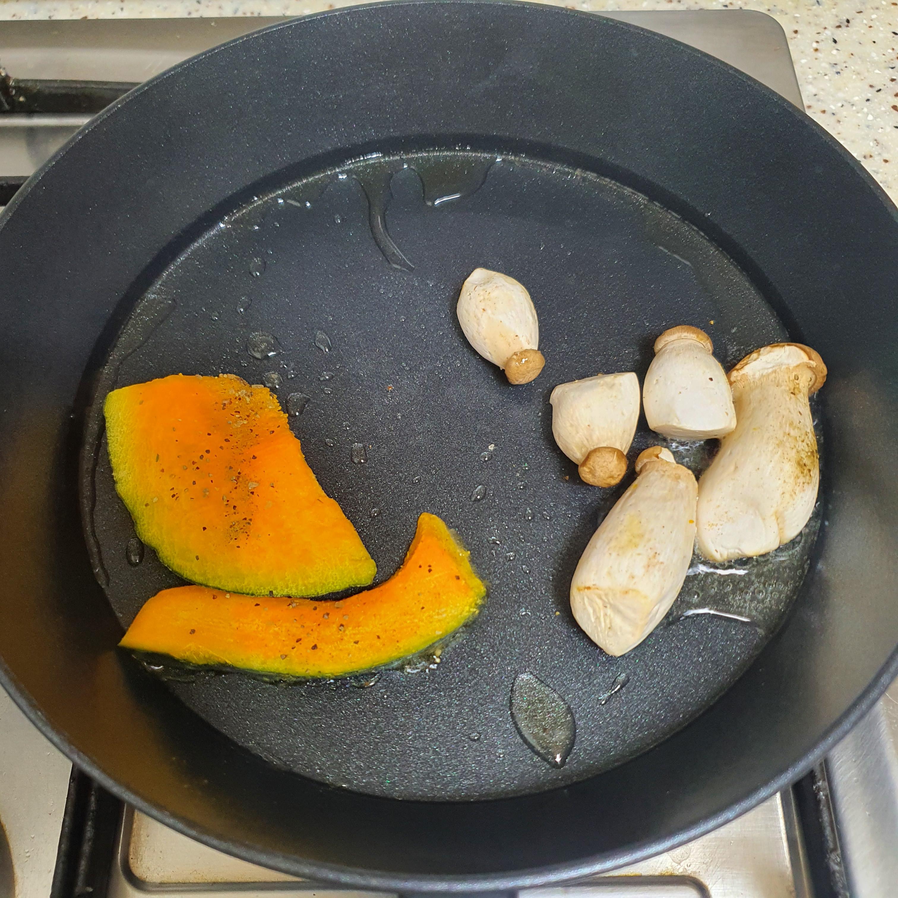 단단한 단호박과 버섯을 먼저 살짝 구워주었습니다.