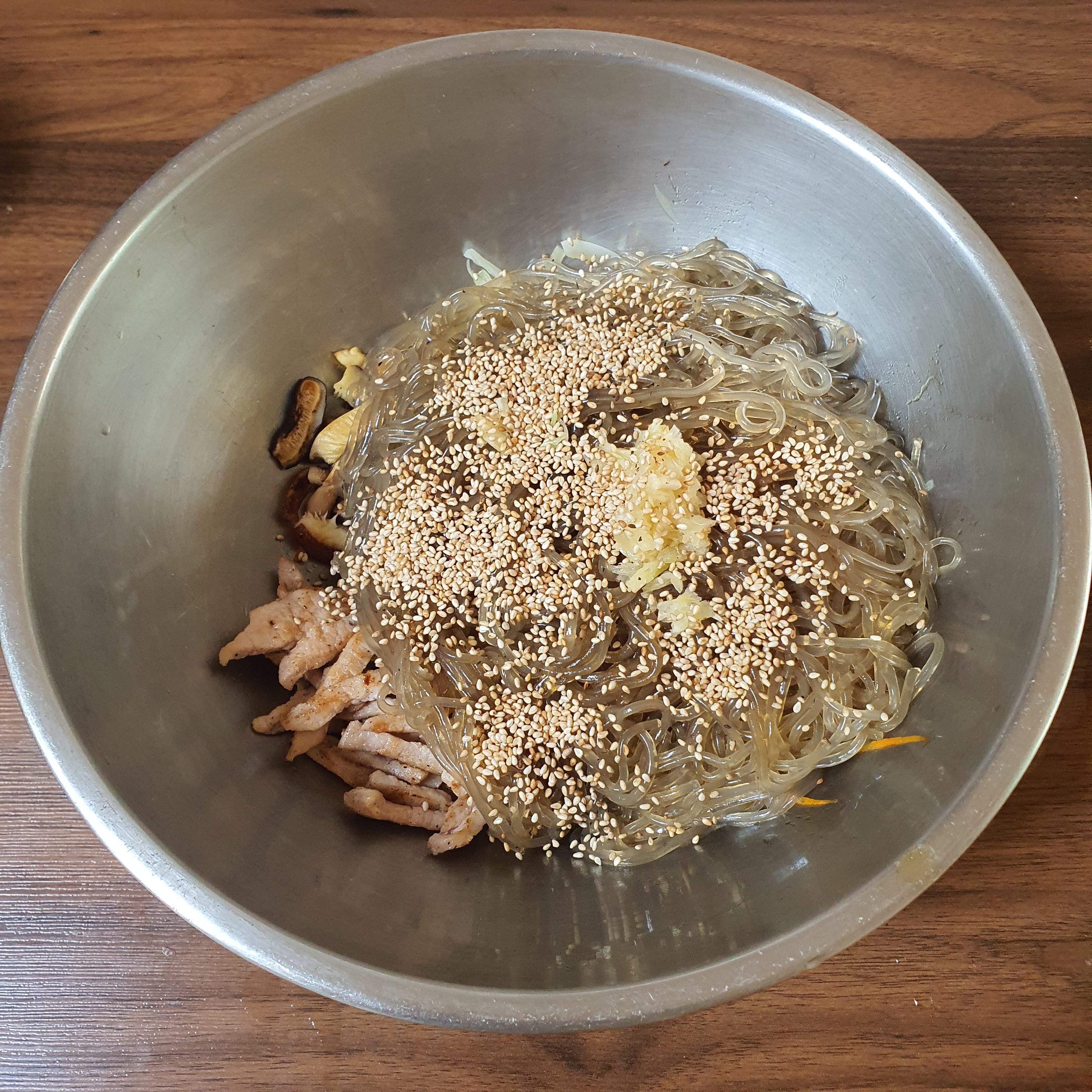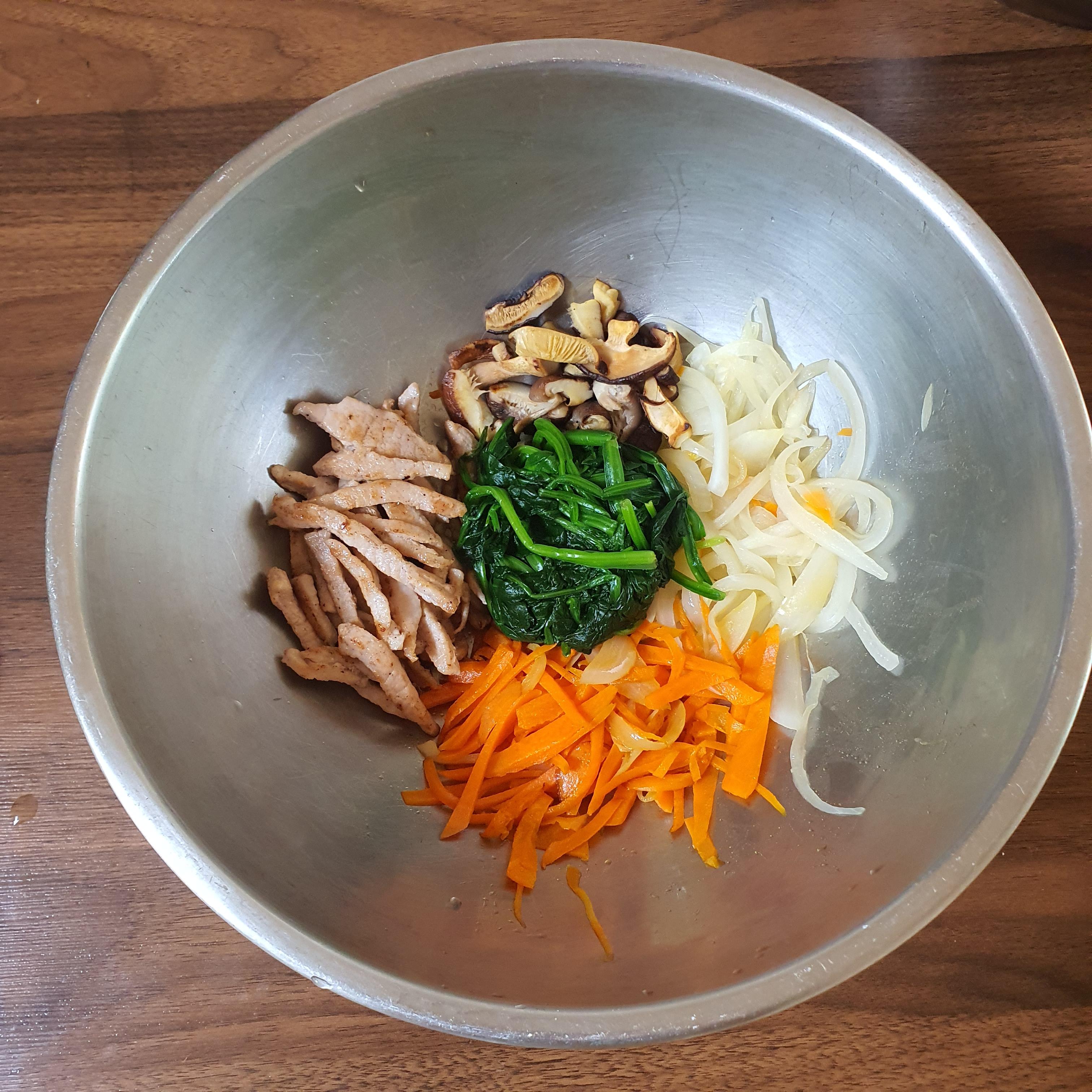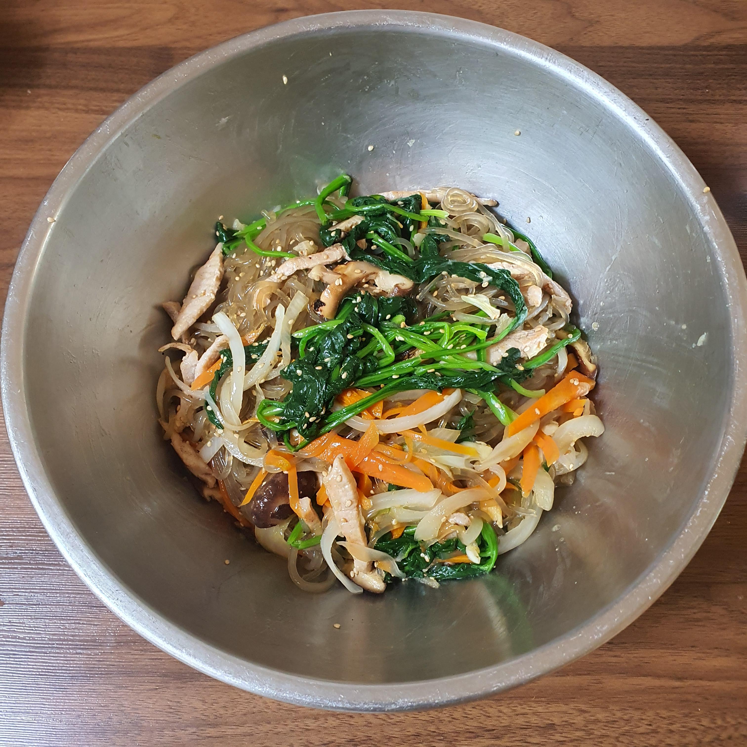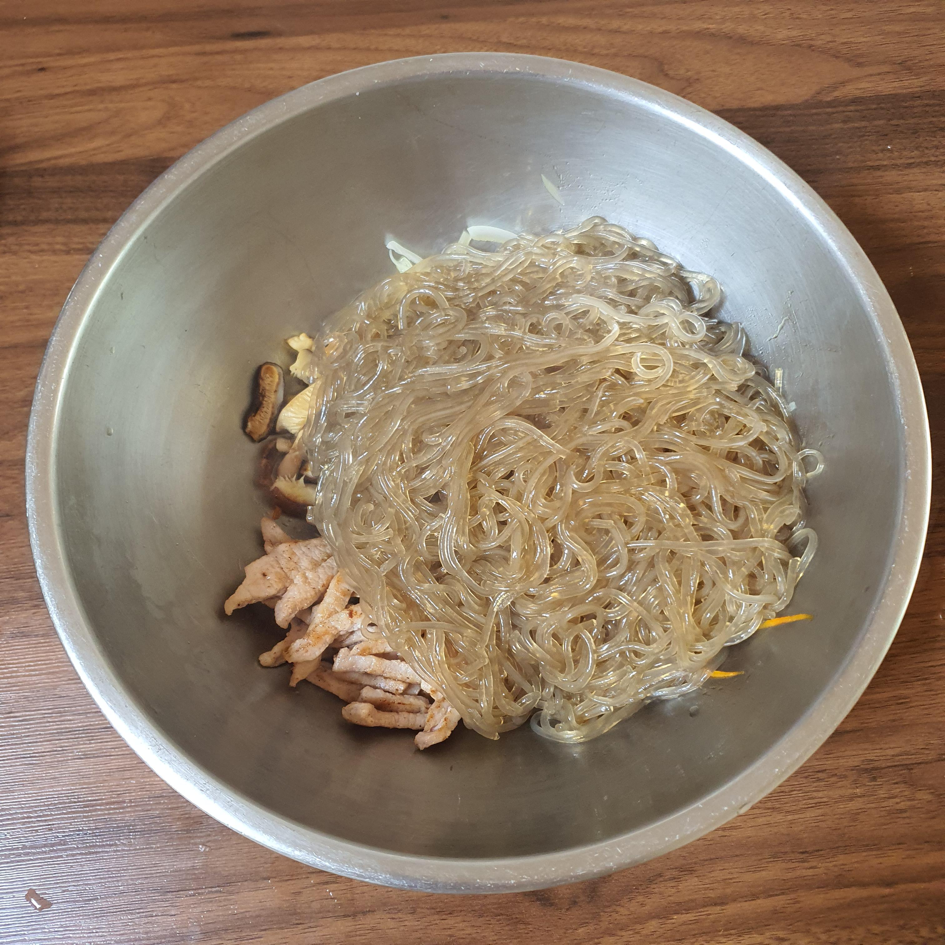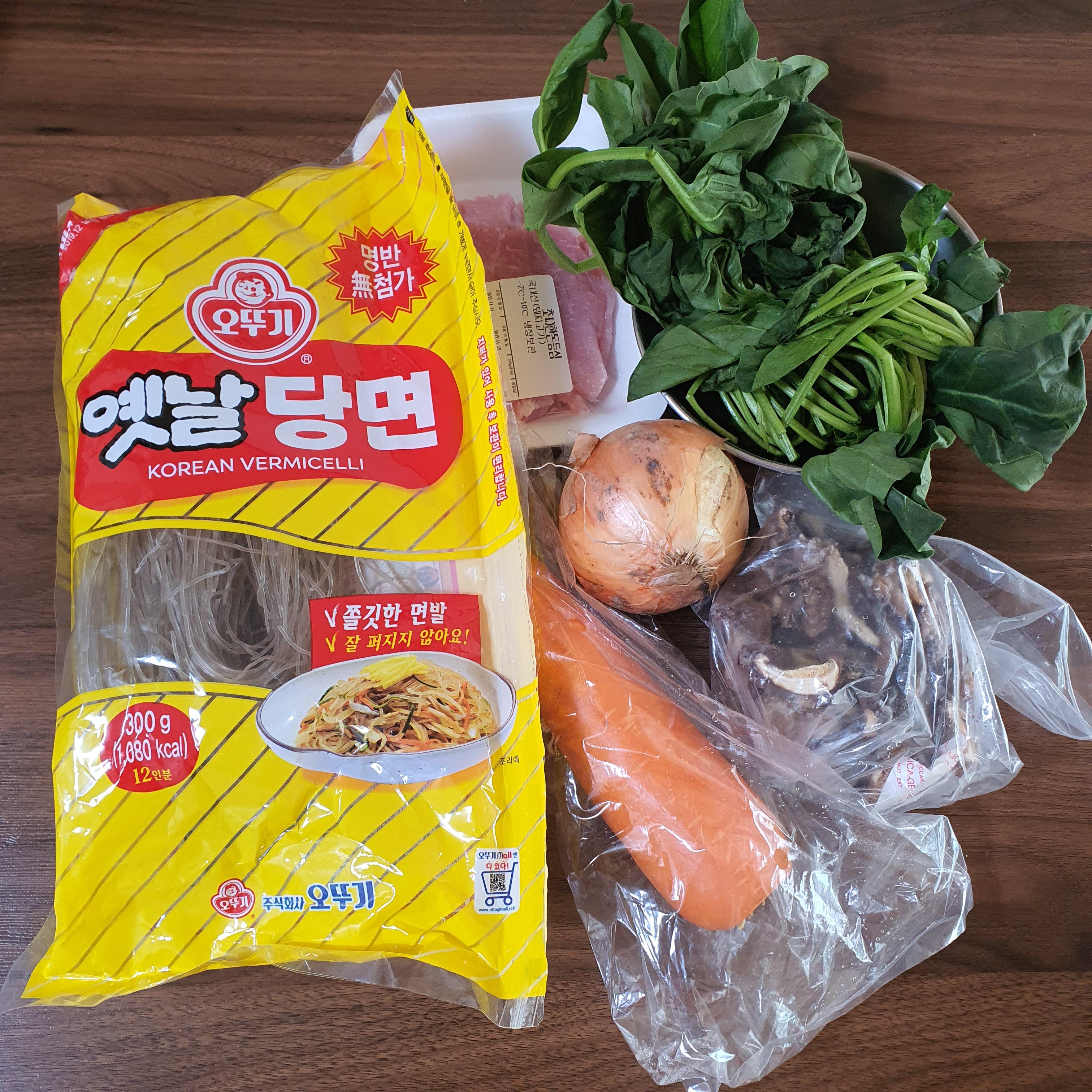 당면, 잡채 전용 고기, 당근, 양파, 표고버섯, 시금치