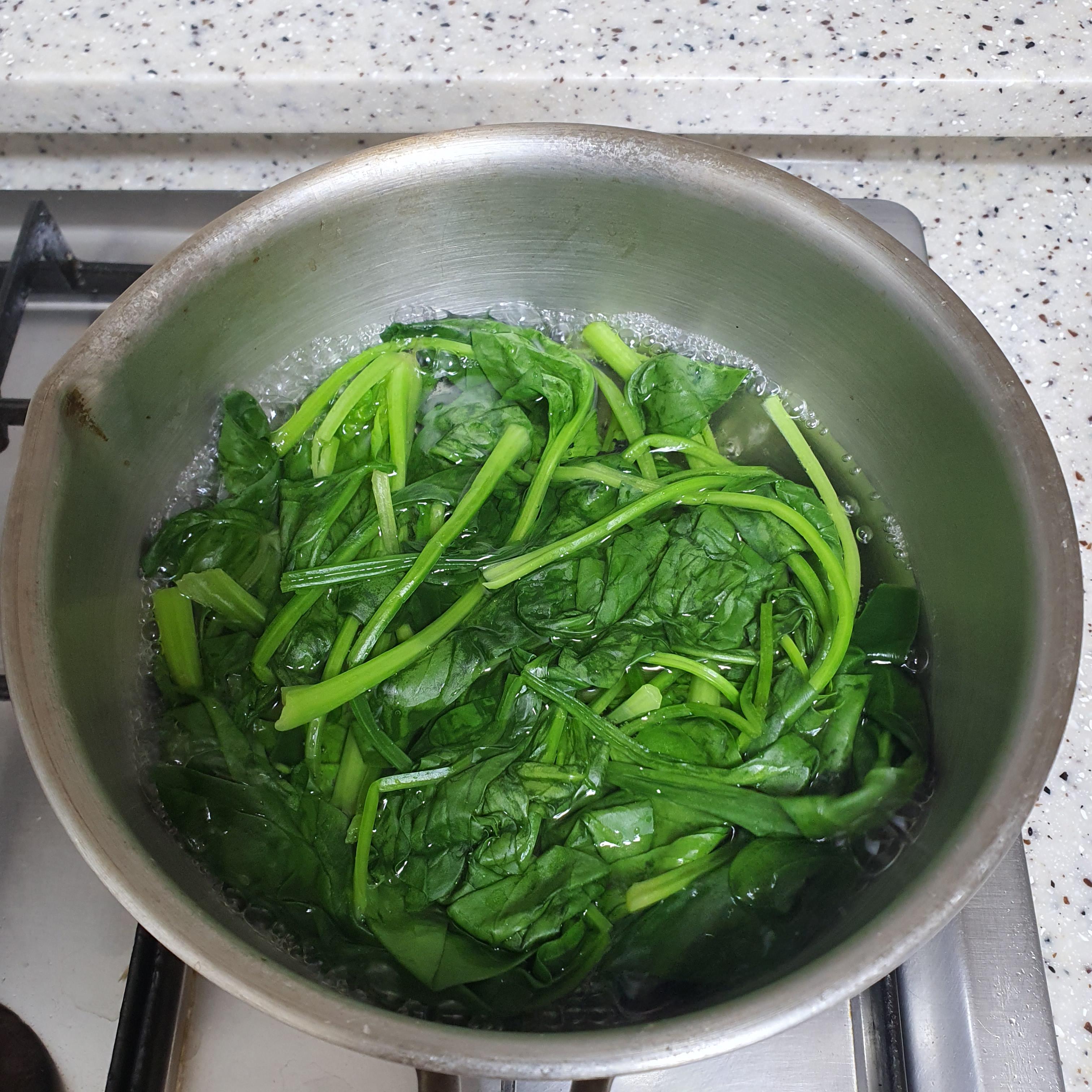 끓는 물에 시금치를 넣어 삶아줍니다.