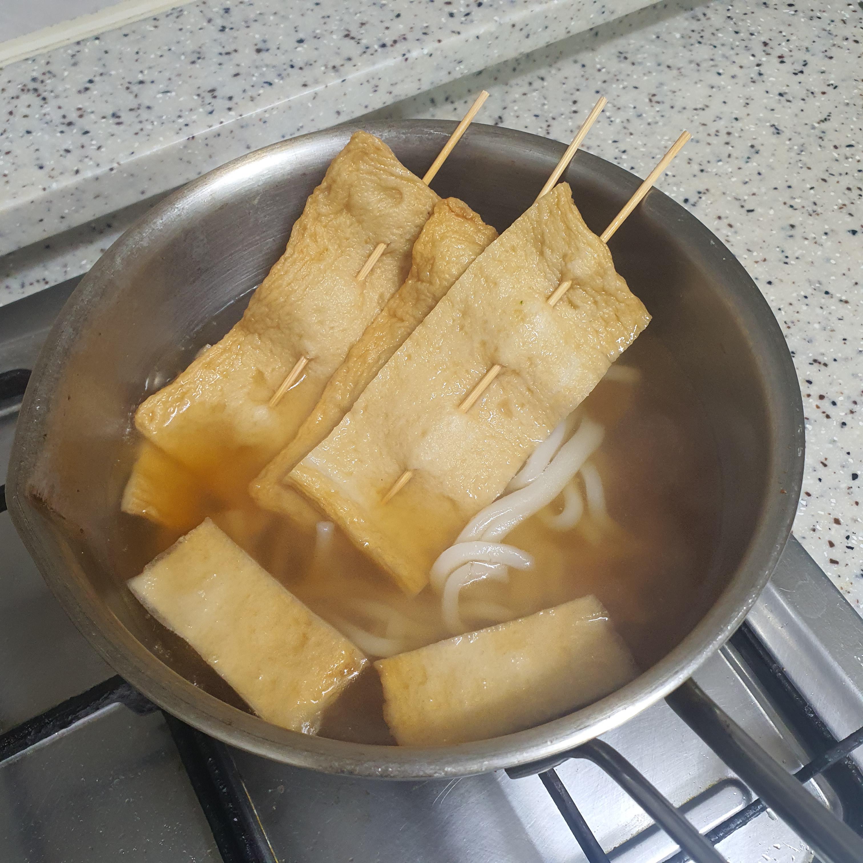어묵과 우동 사리는 미리 삶았던 거라 국물이 팔팔 끓으면 됩니다.