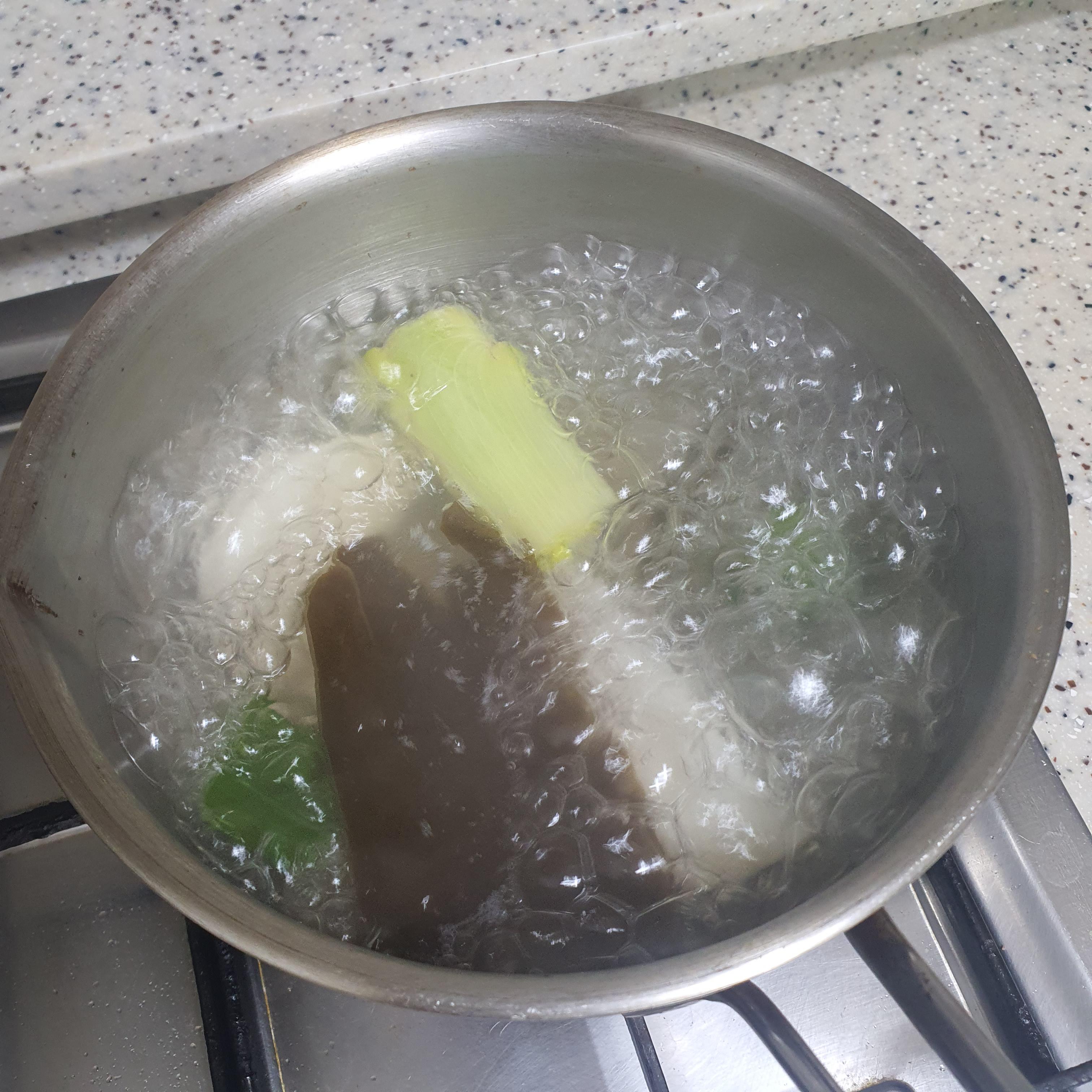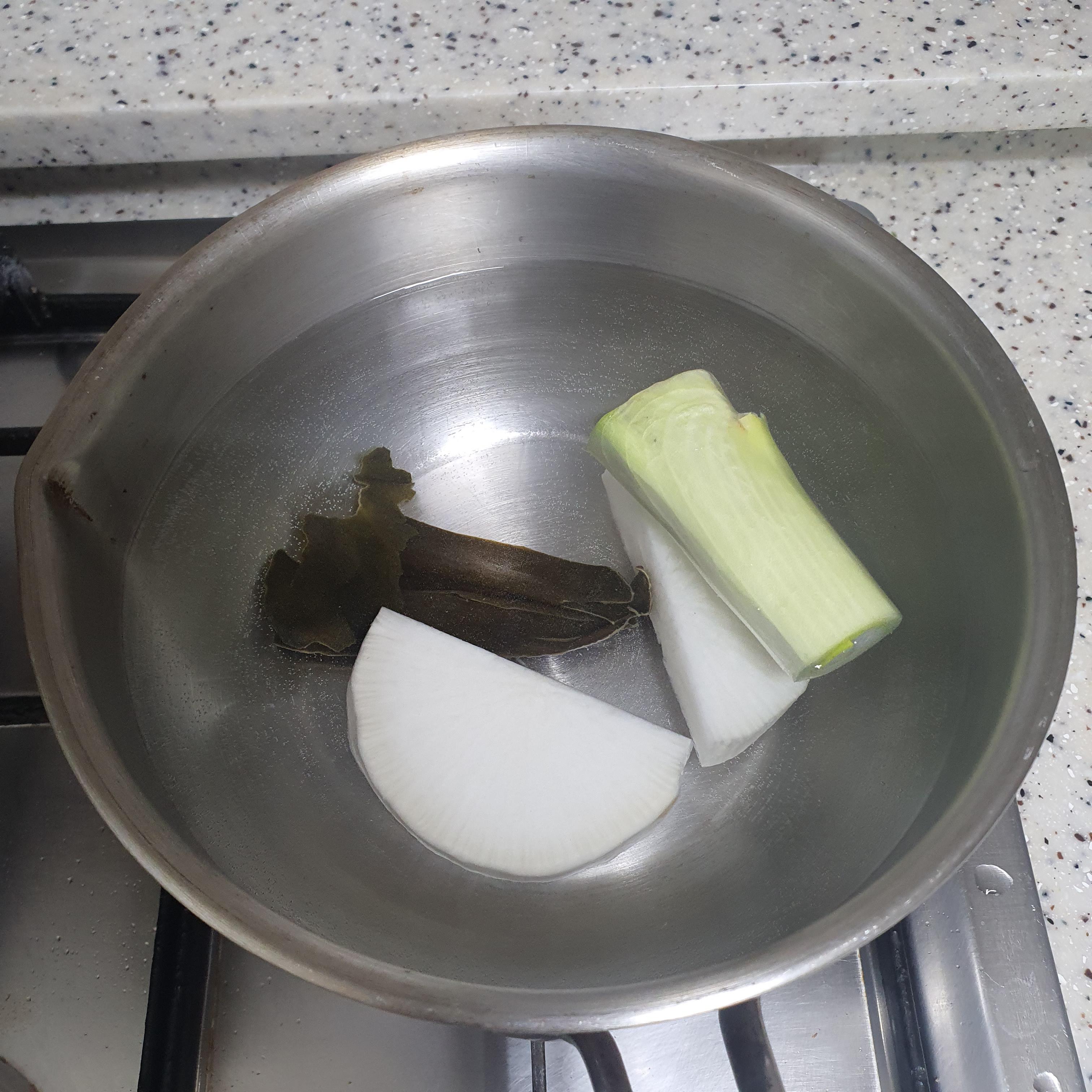 먼저 물을 많이 잡고 무와 다시마, 파를 넣고 팔팔 끓여줍니다.
