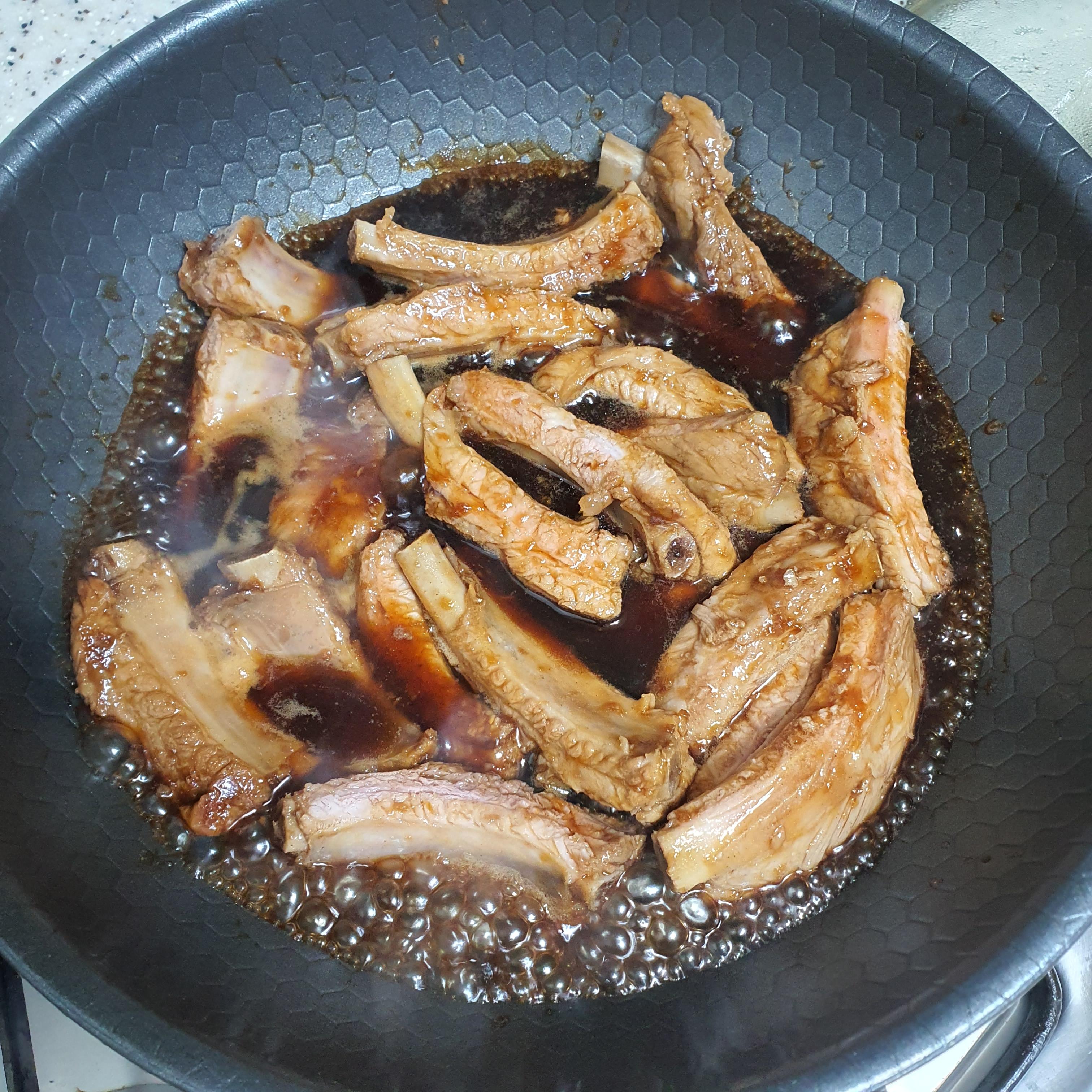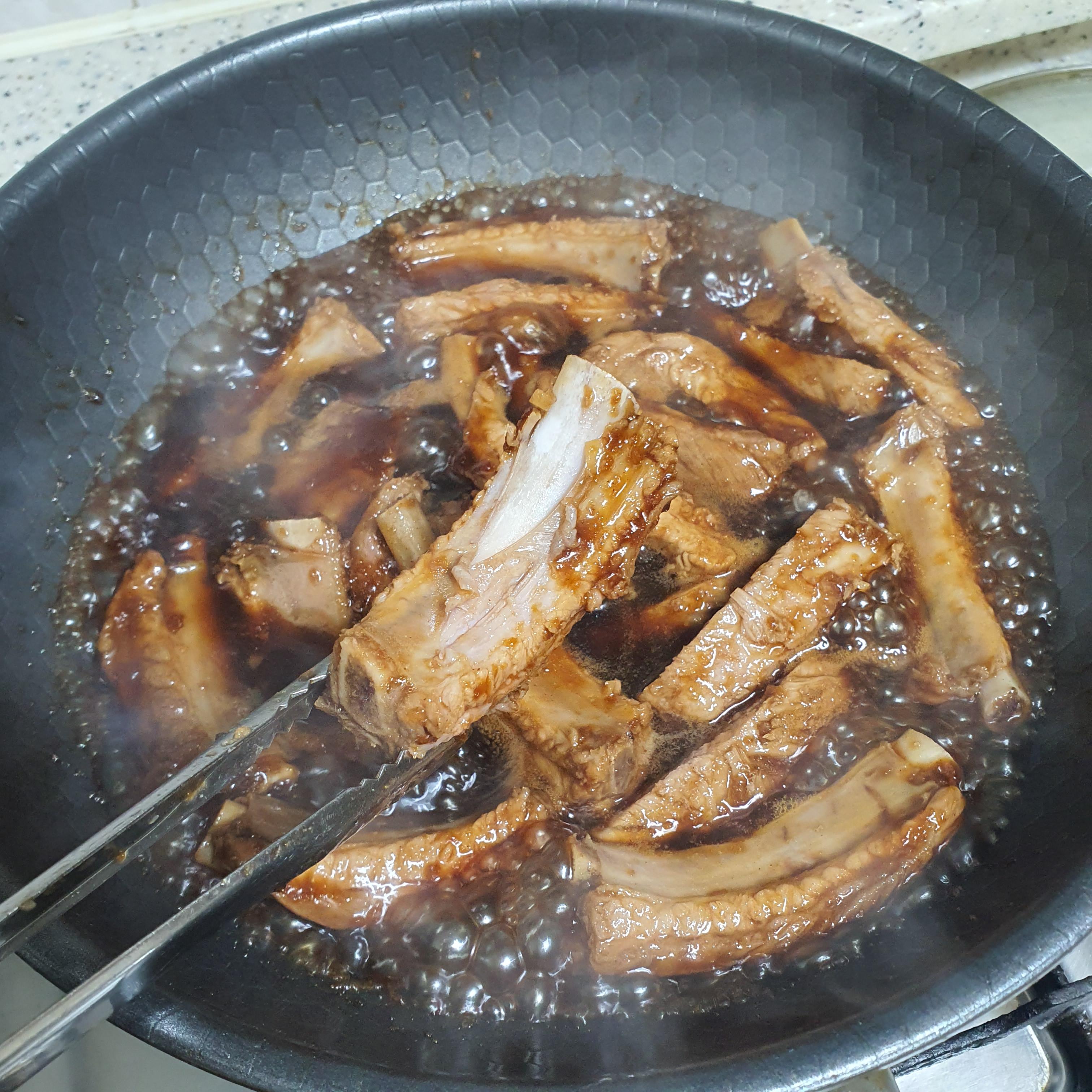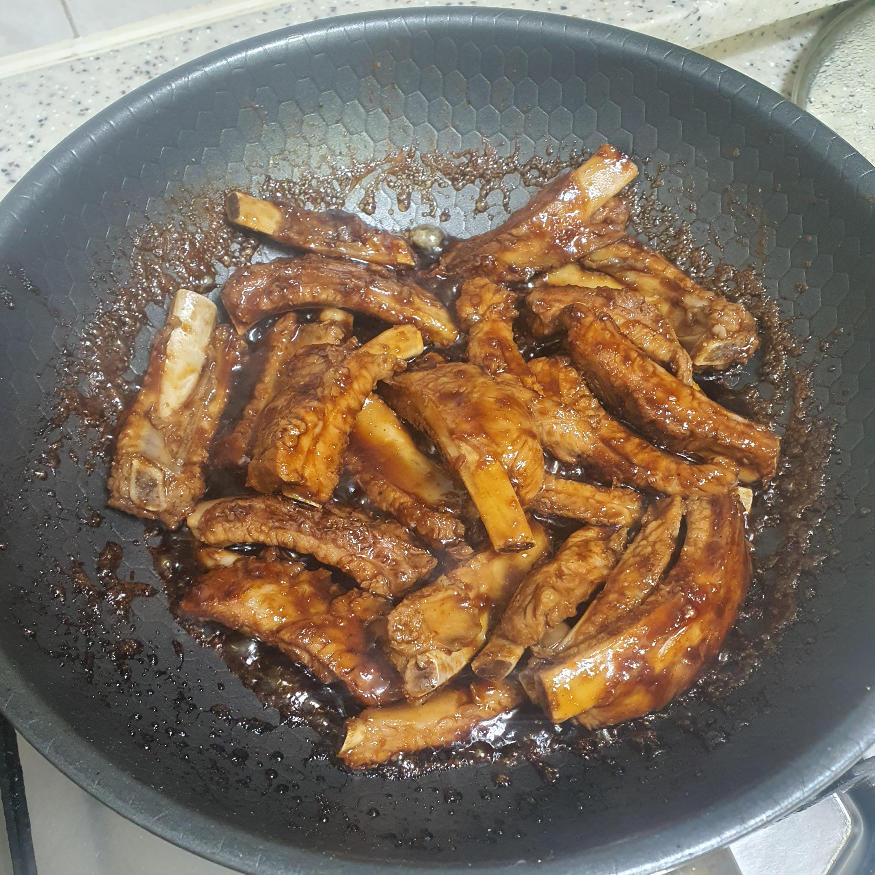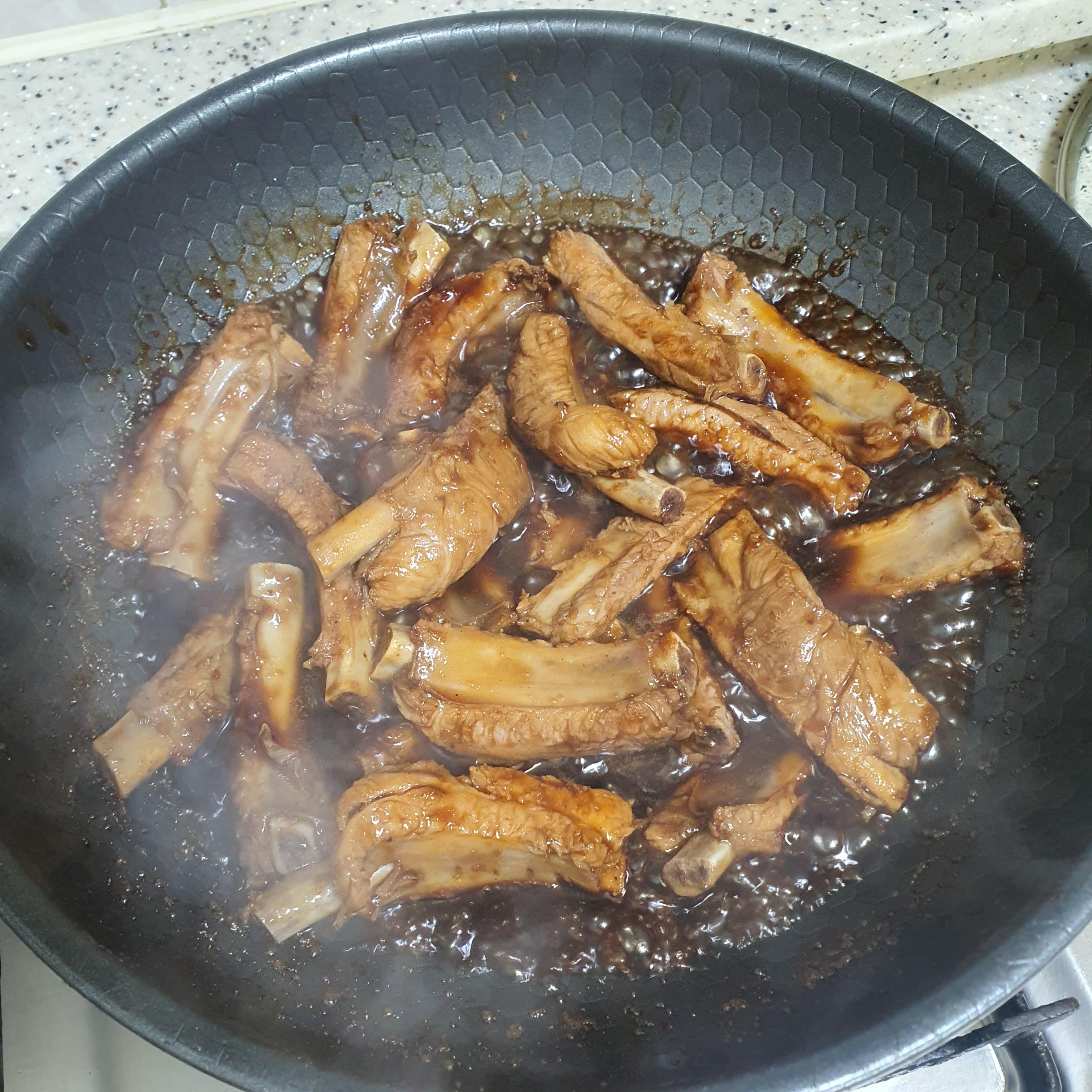소스가 등갈비에 스며들어 등갈비 색이 진해지고